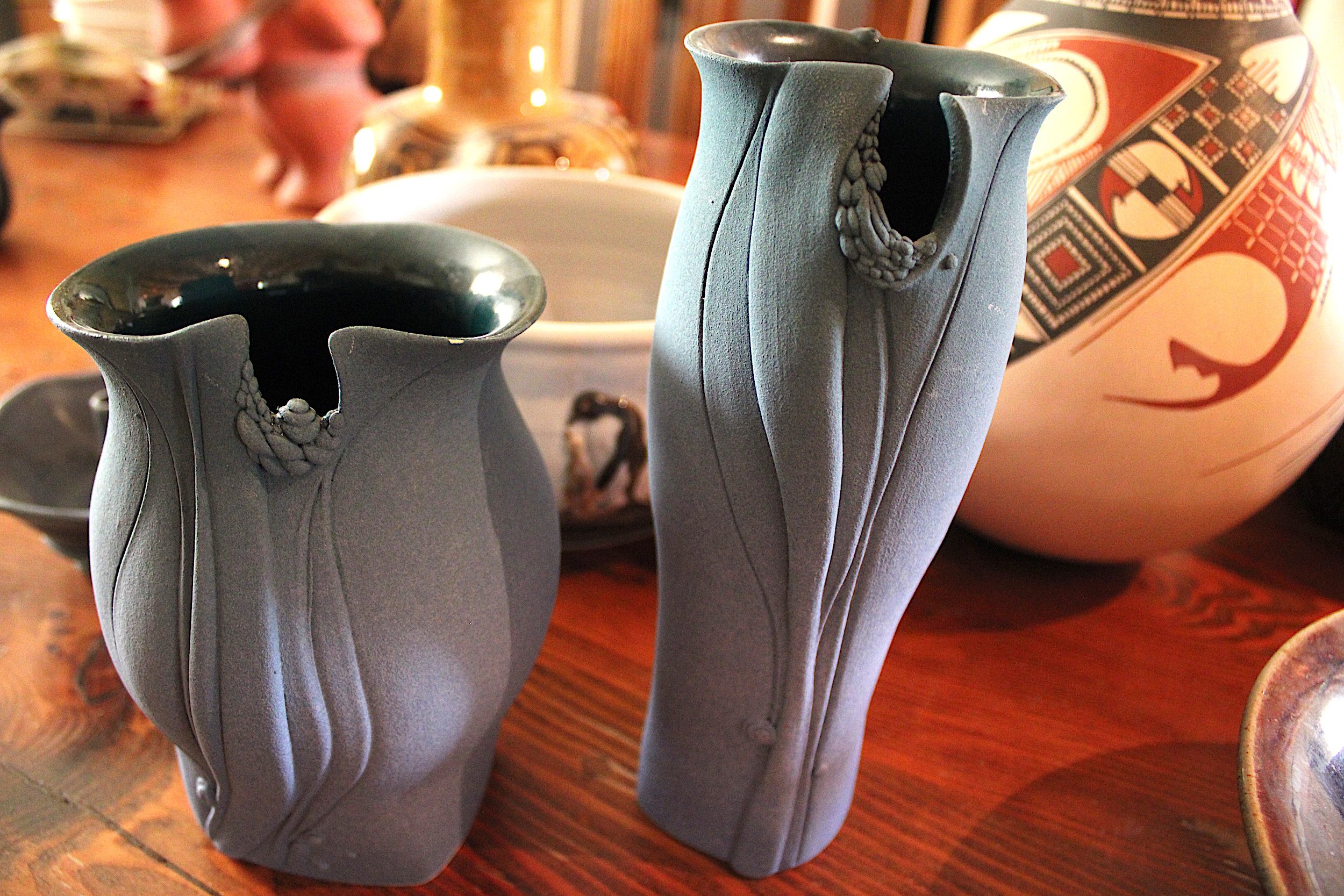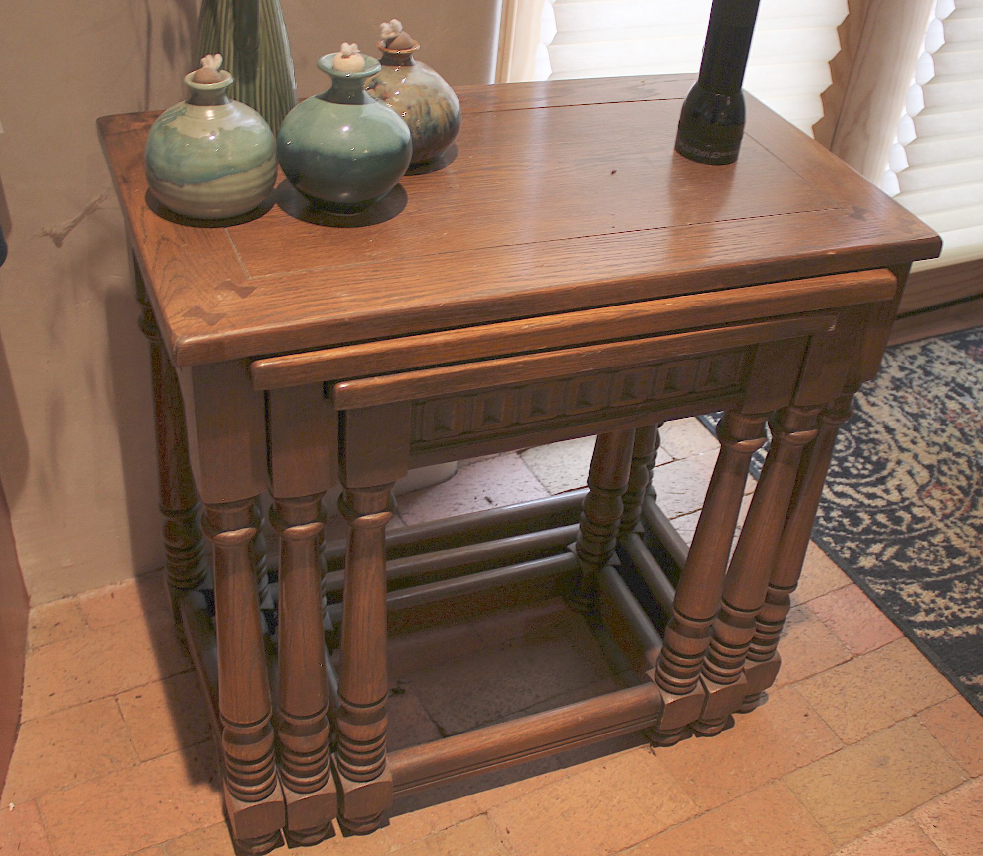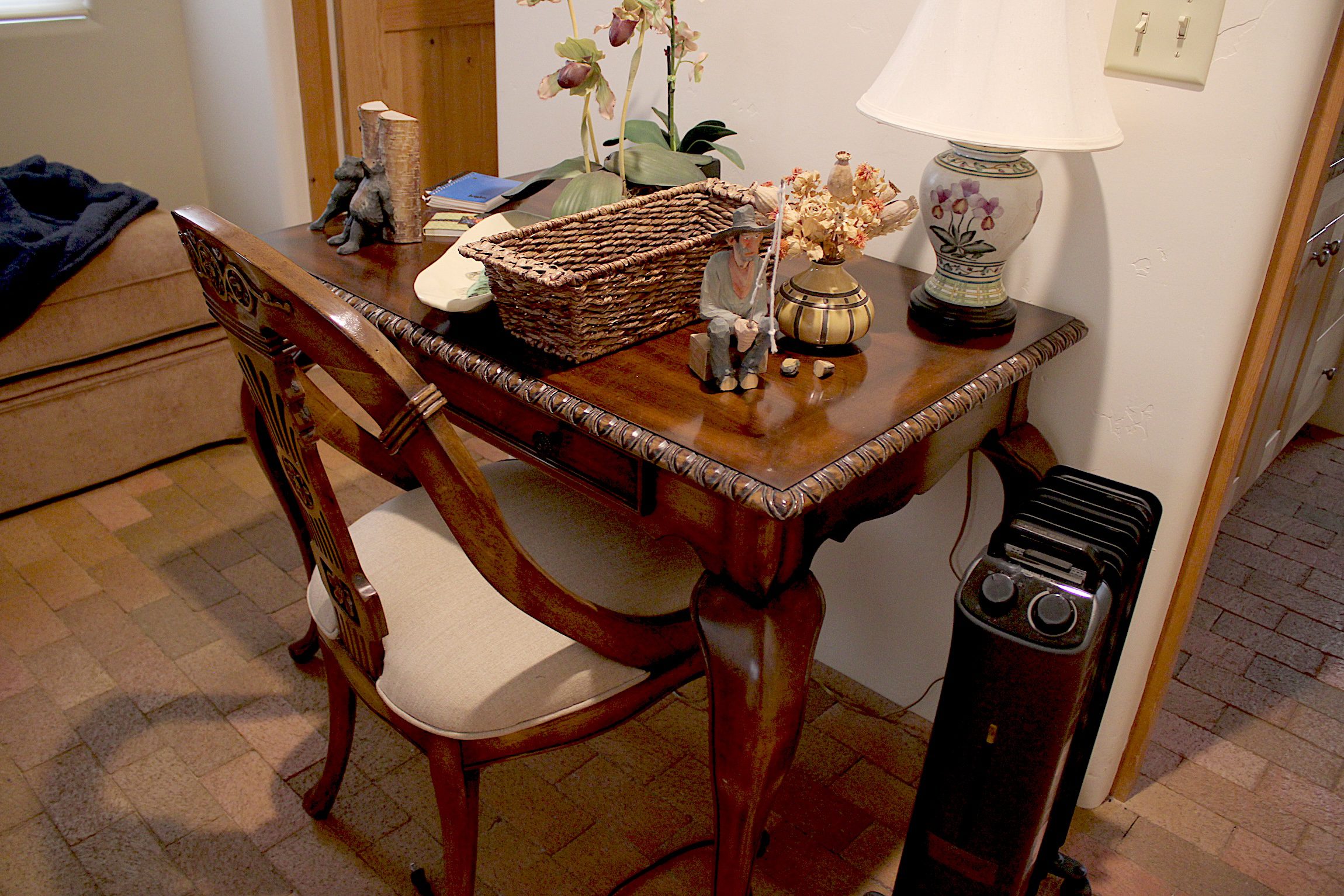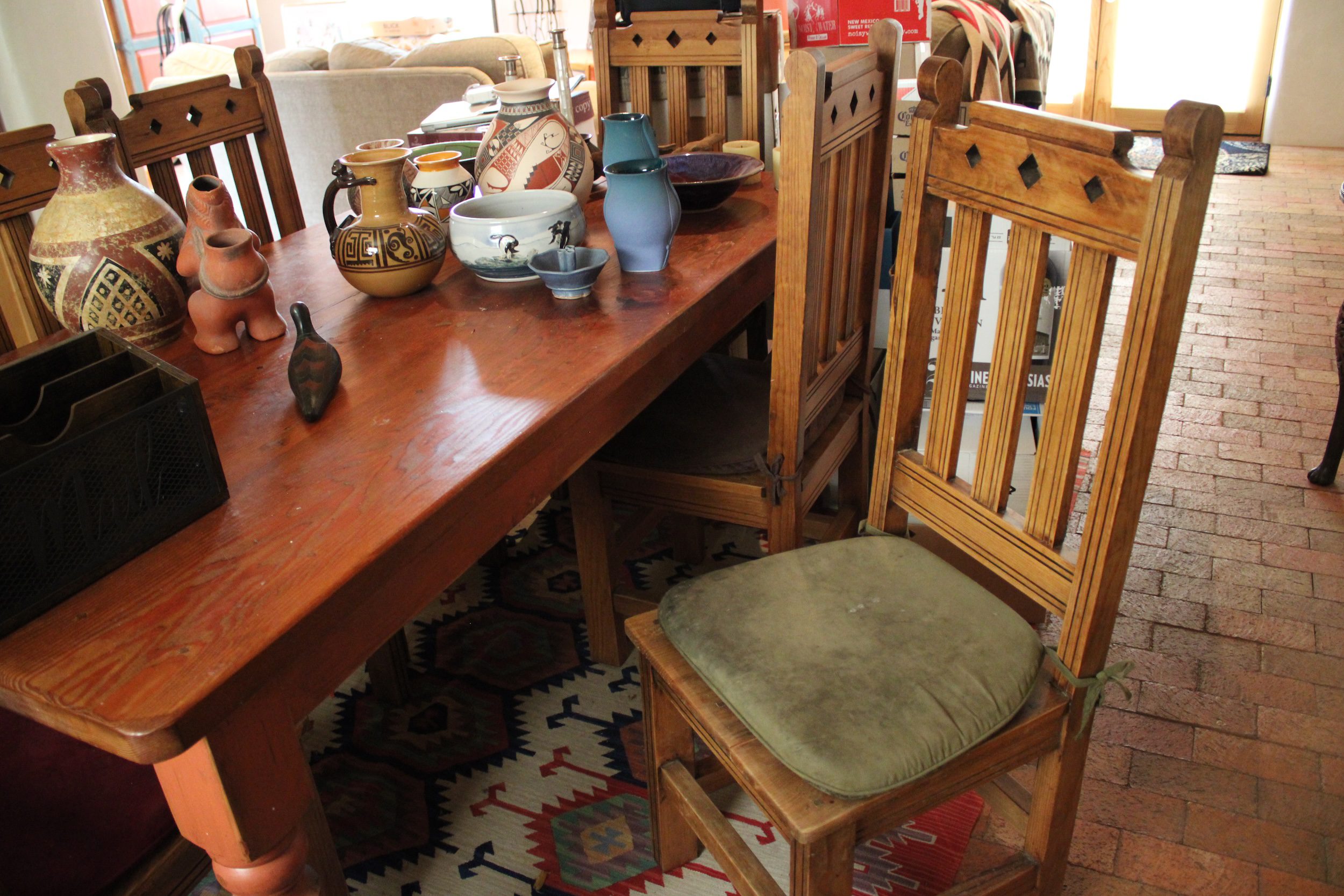 Ready for a cozy sale with tons and tons of charm? This week Taos Black Dog brings you the Elizabeth Mann downsizing sale, a treat for anyone looking to feather their nest with beautiful Taos art, outfit new digs or an empty casita with gently loved furnishings or decorate their windows with bright geometric stained glass. Joseph Imhoff and Elmer Schooley lithographs from the 1950s are the highlight of the marvelous local art. Two Pfaff sewing machines and a clothes dryer for the seamsters, ready for the next project, and quilts for those of us less handy are available. Did we mention stained glass? There are four lovely panels in a variety of sizes. For the dining room, there is an excellent Southwest table and chair set, a collection of Fiesta Ware plates and cups, and a complete set of Haviland dishes as well as brilliant cut glass bowls and servers. And in the lovely antique China cabinet crystal from Lalique and figurines from Lladro, Hummel and other fine makers. Rugs, a matching sofa and love seat, desks, dressers and bookcases round out the selection for this sweet and neatly packed condo.