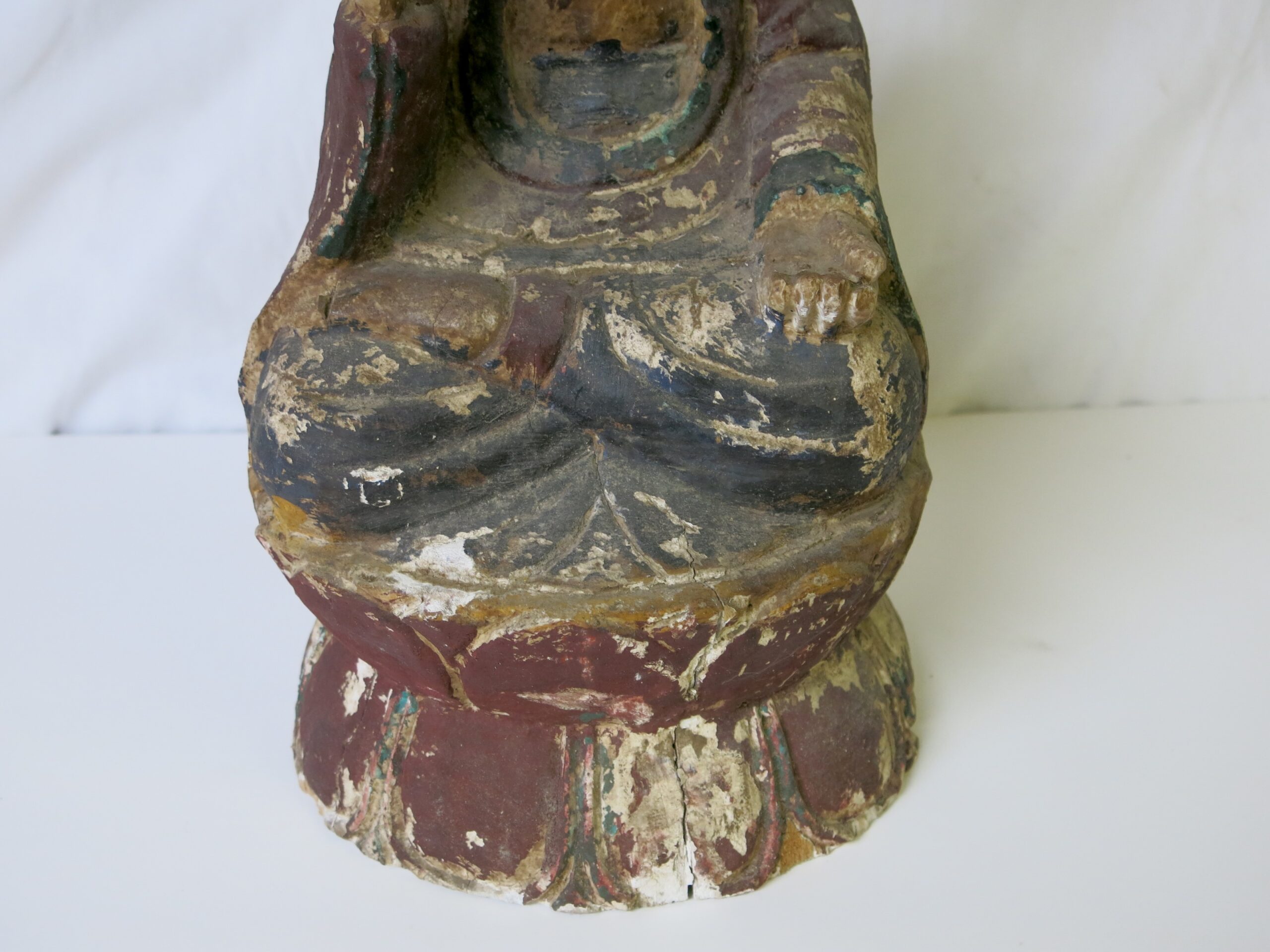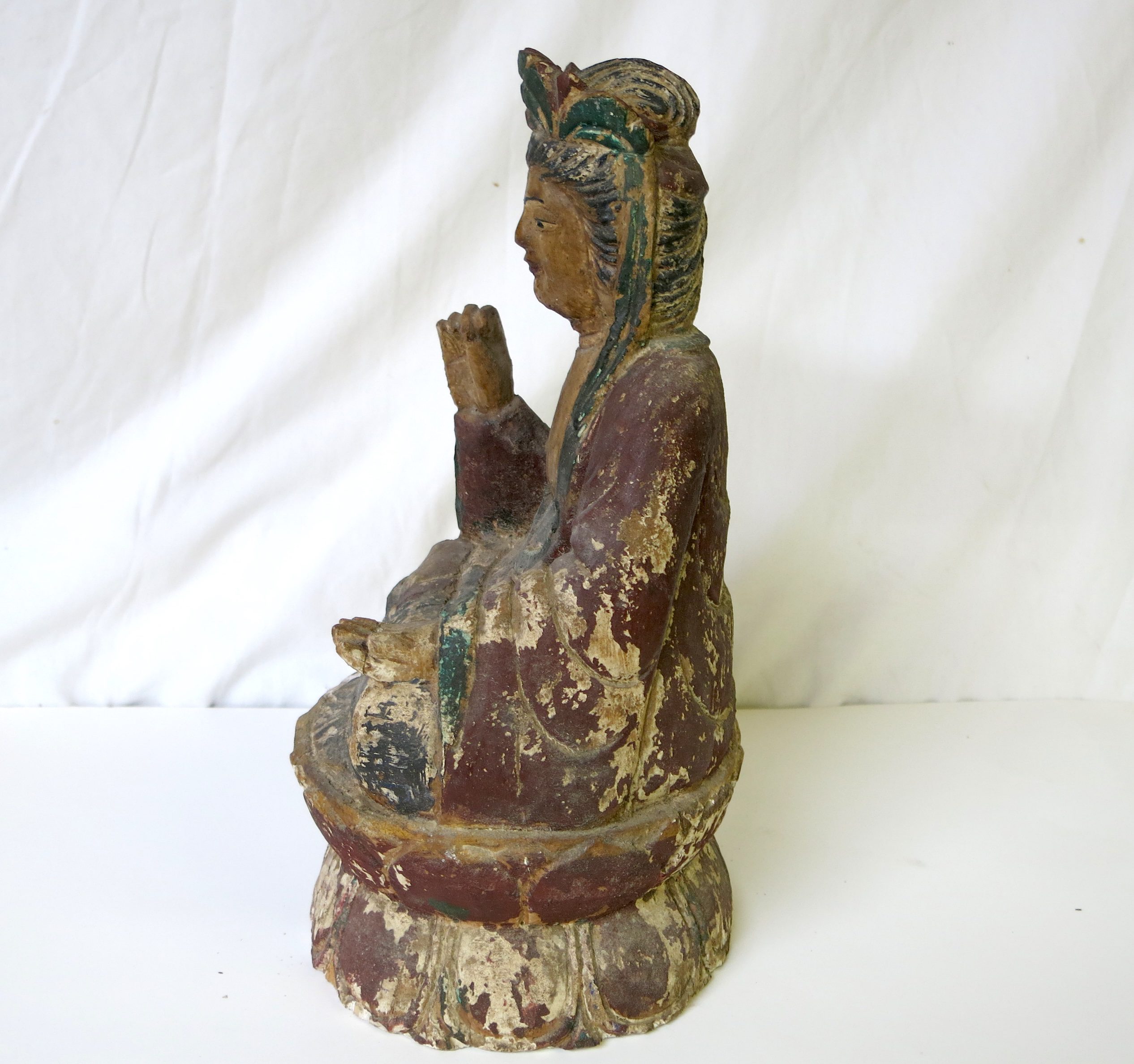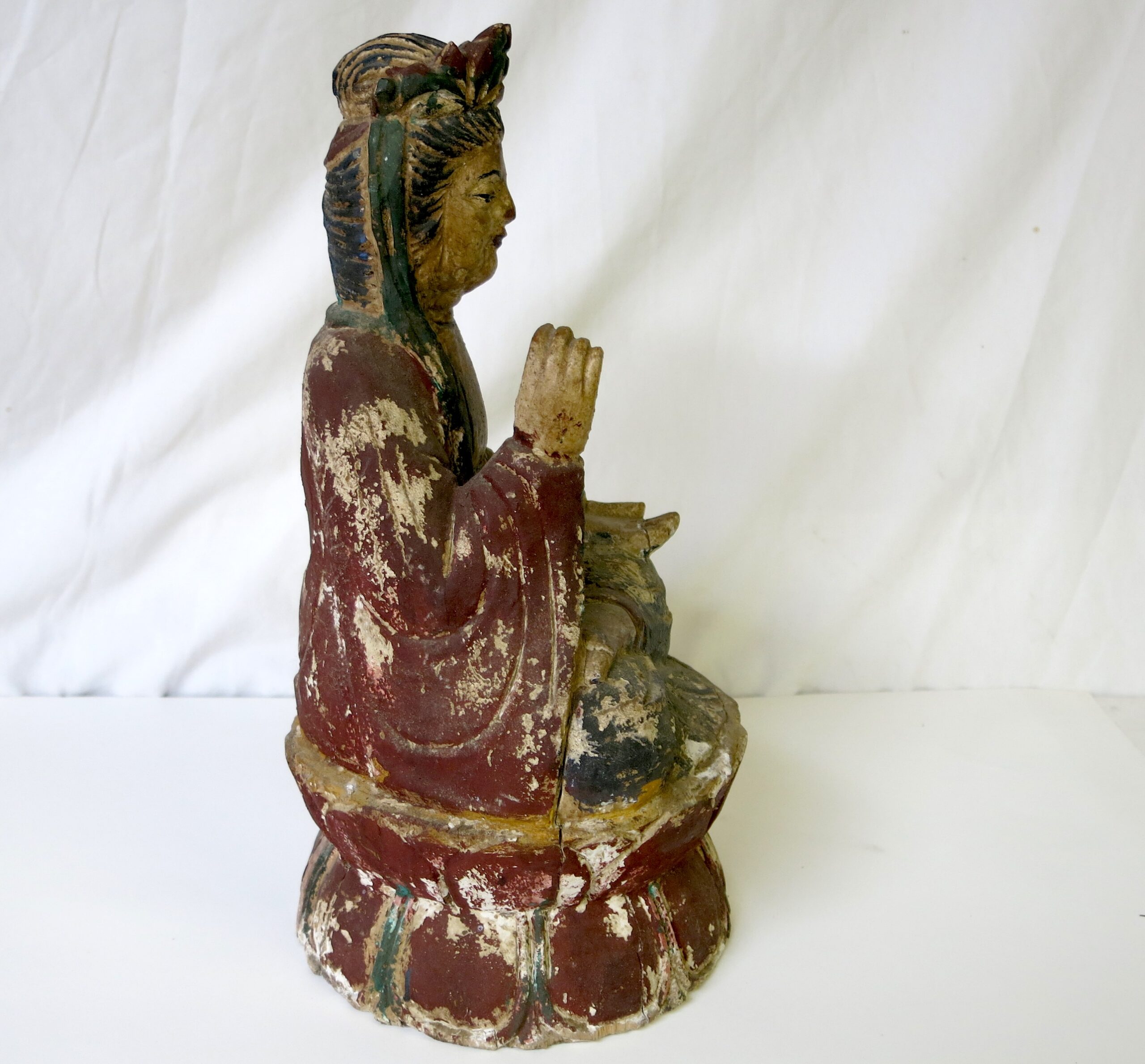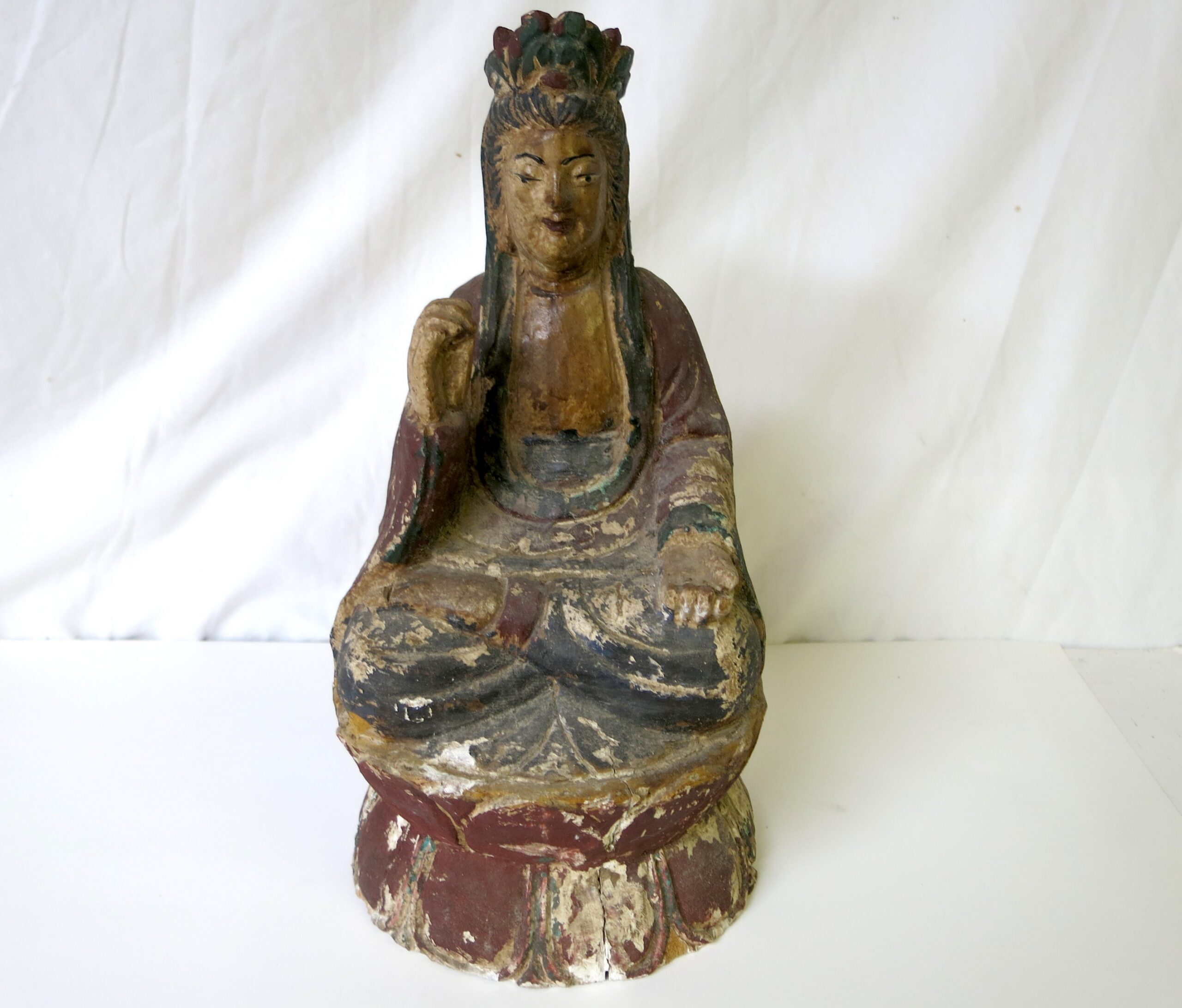 Description: This Guanyi (Kwan-yin) is carved from wood and was originally polychromed, based on the wear and the style it is probably late Ming dynasty and dates from the 16th or 17th century. Some paint chipping and a couple of cracks, but in really good condition for its age. Repaired left hand fingers. Guan Yin frequently appears standing or sitting, as in this case, on a lotus flower, a ubiquitous Buddhist symbol of enlightenment and spiritual awakening. The lotus grows from the muddy waters of samsara, yet remains unstained by impurities, representing the transcendence of suffering and the attainment of enlightenment.