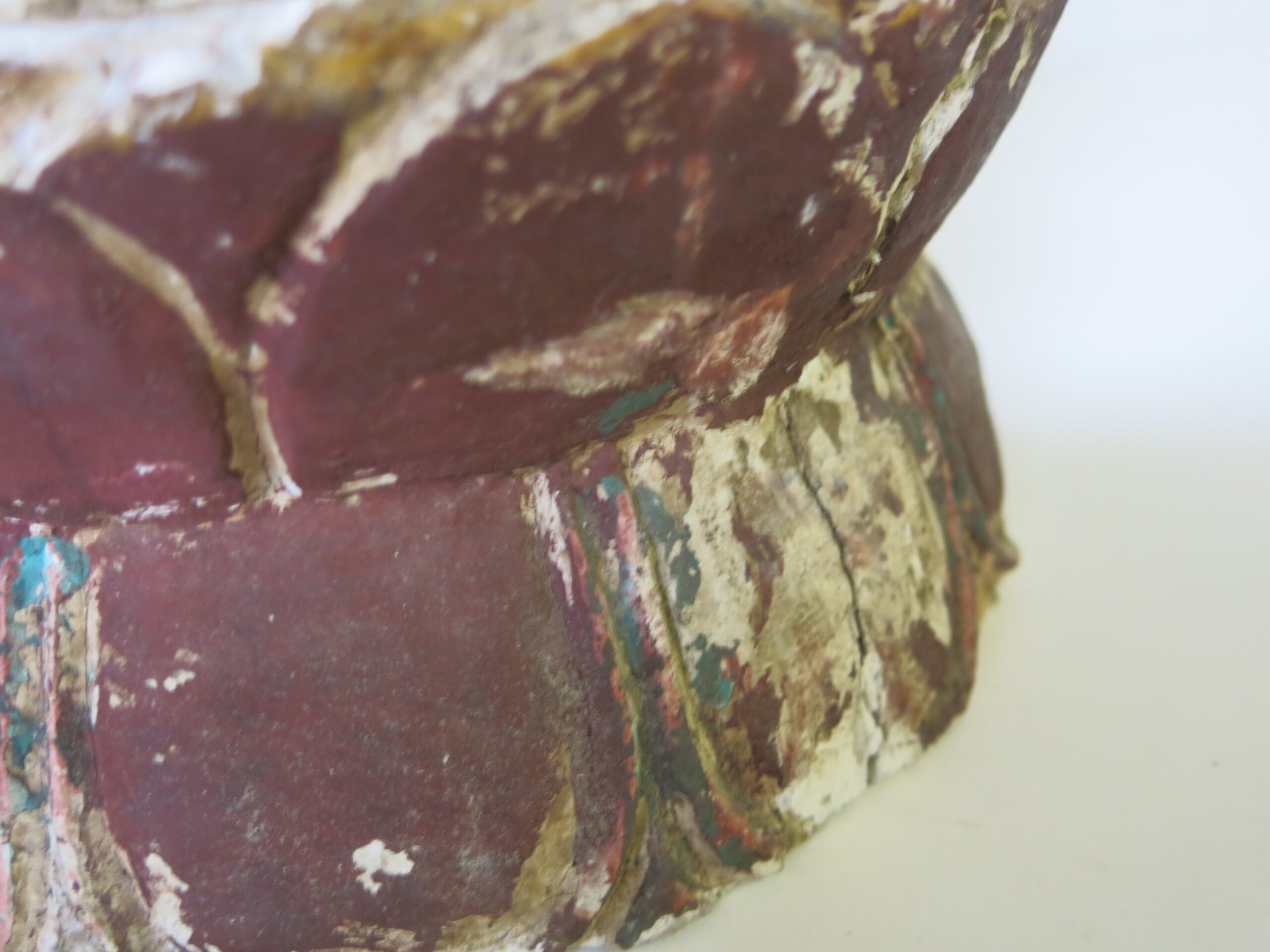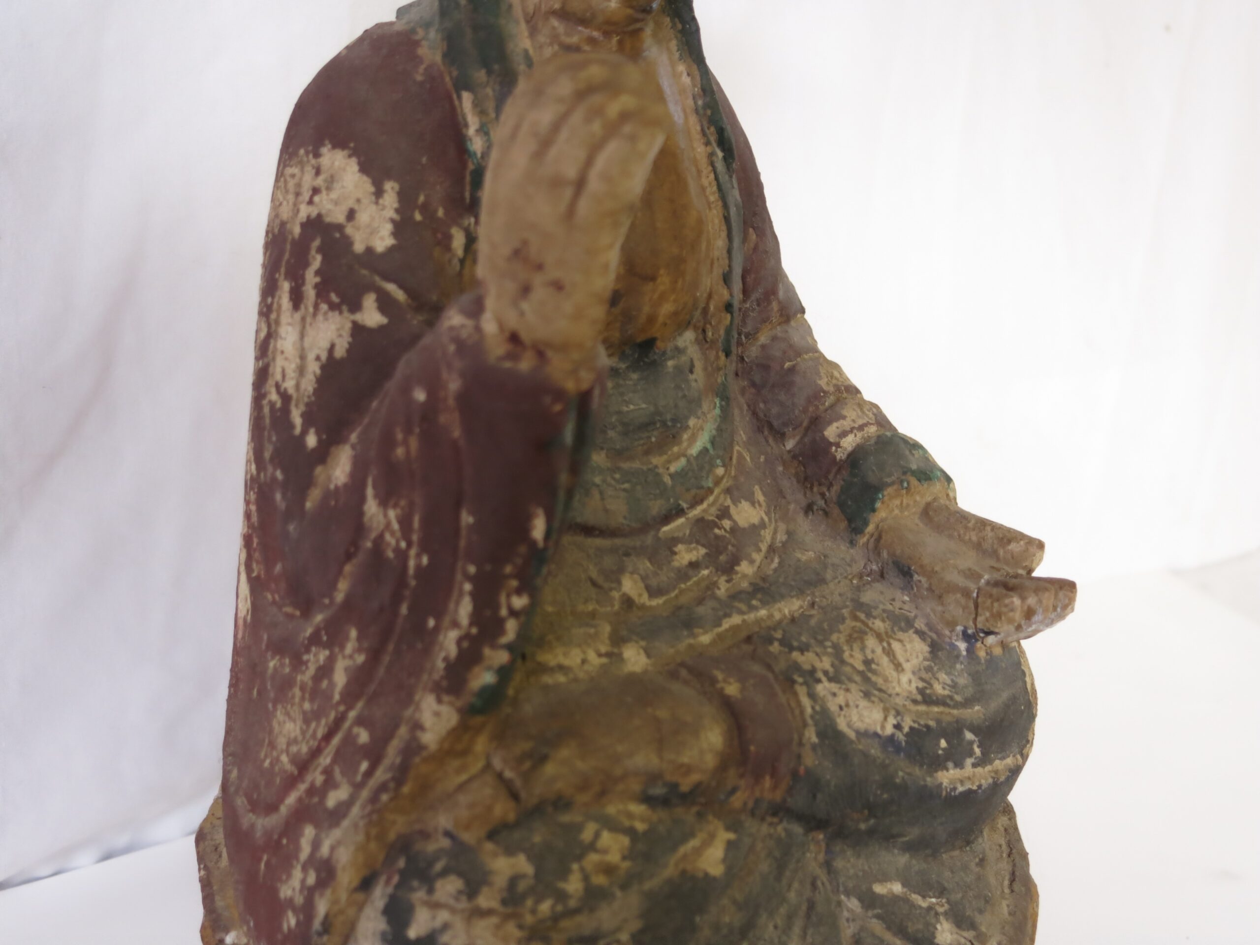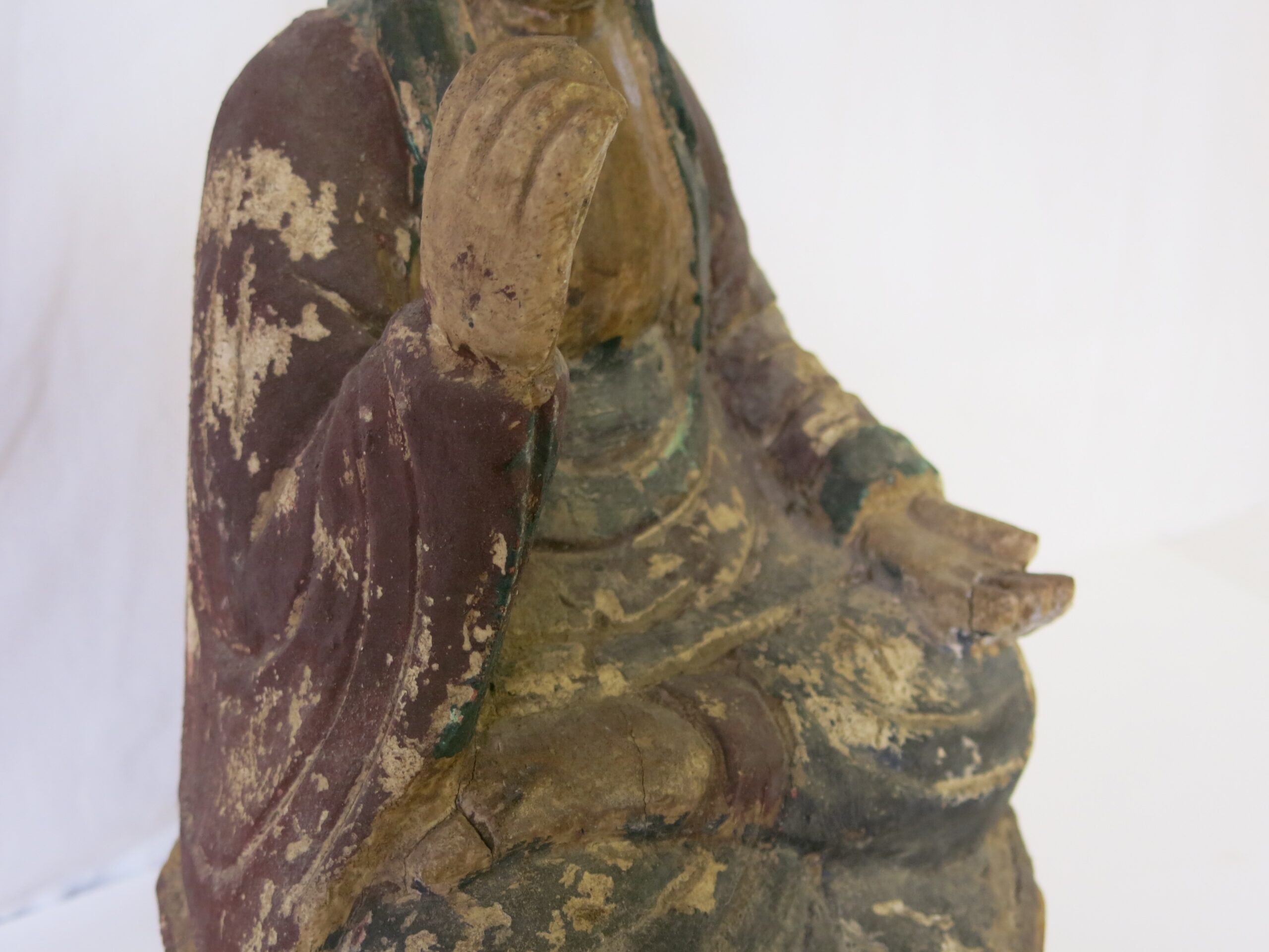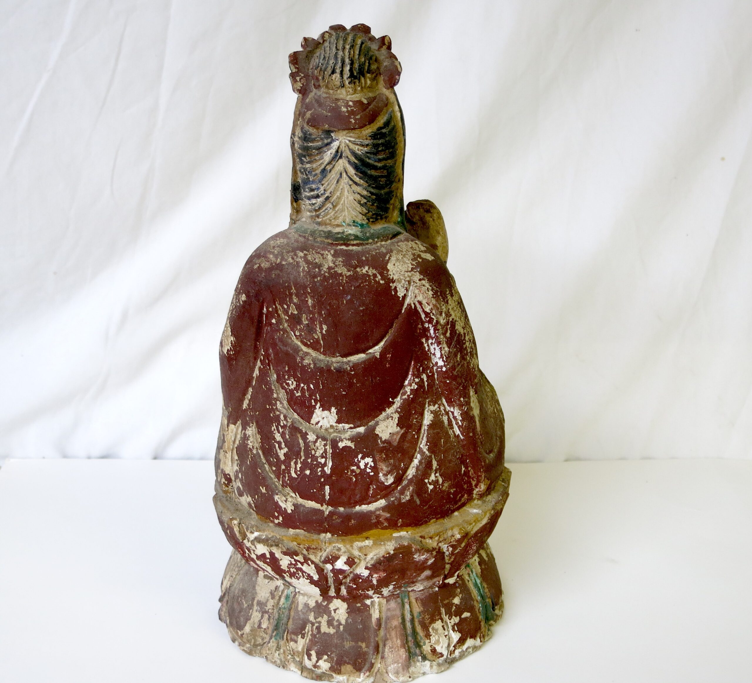 Description: This Guanyi (Kwan-yin) is carved from wood and was originally polychromed, based on the wear and the style it is probably late Ming dynasty and dates from the 16th or 17th century. Some paint chipping and a couple of cracks, but in really good condition for its age. Repaired left hand fingers. Guan Yin frequently appears standing or sitting, as in this case, on a lotus flower, a ubiquitous Buddhist symbol of enlightenment and spiritual awakening. The lotus grows from the muddy waters of samsara, yet remains unstained by impurities, representing the transcendence of suffering and the attainment of enlightenment.