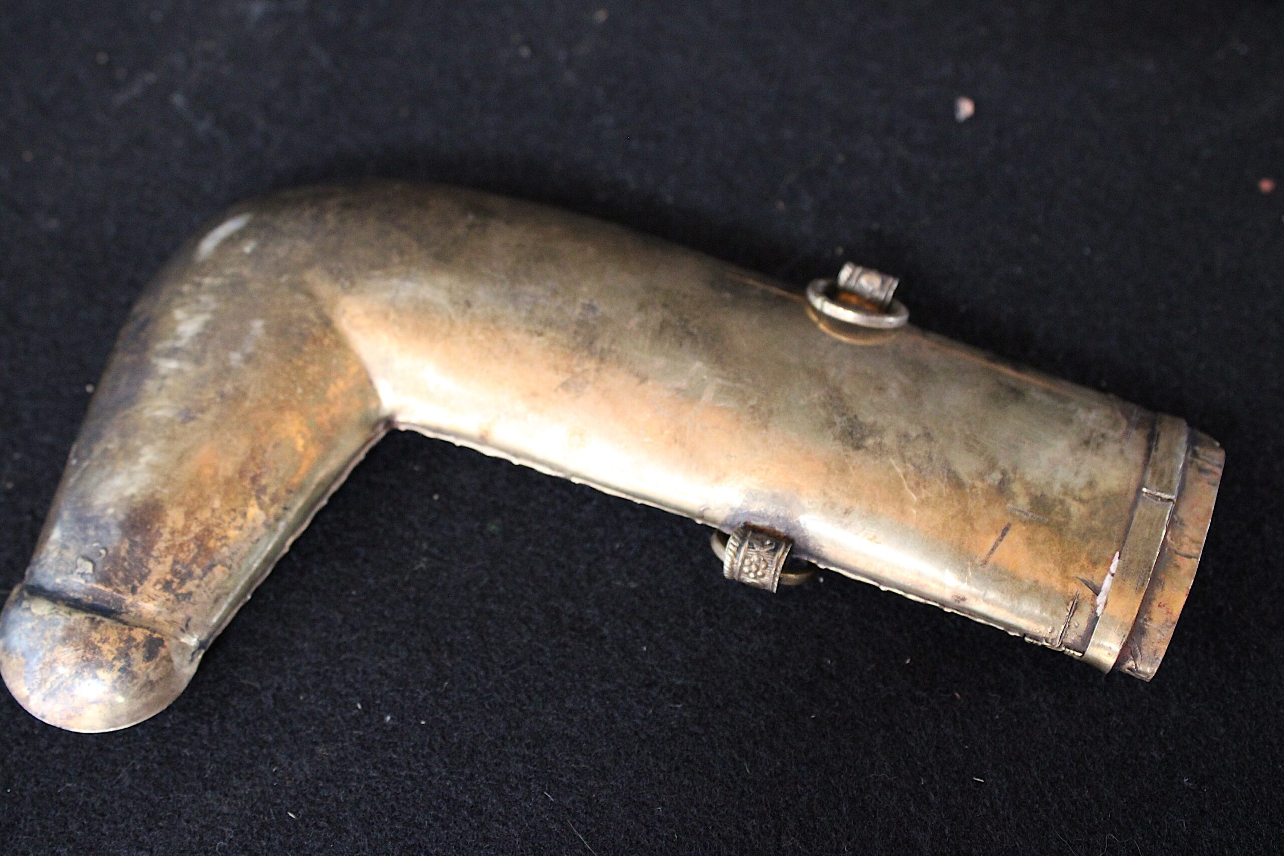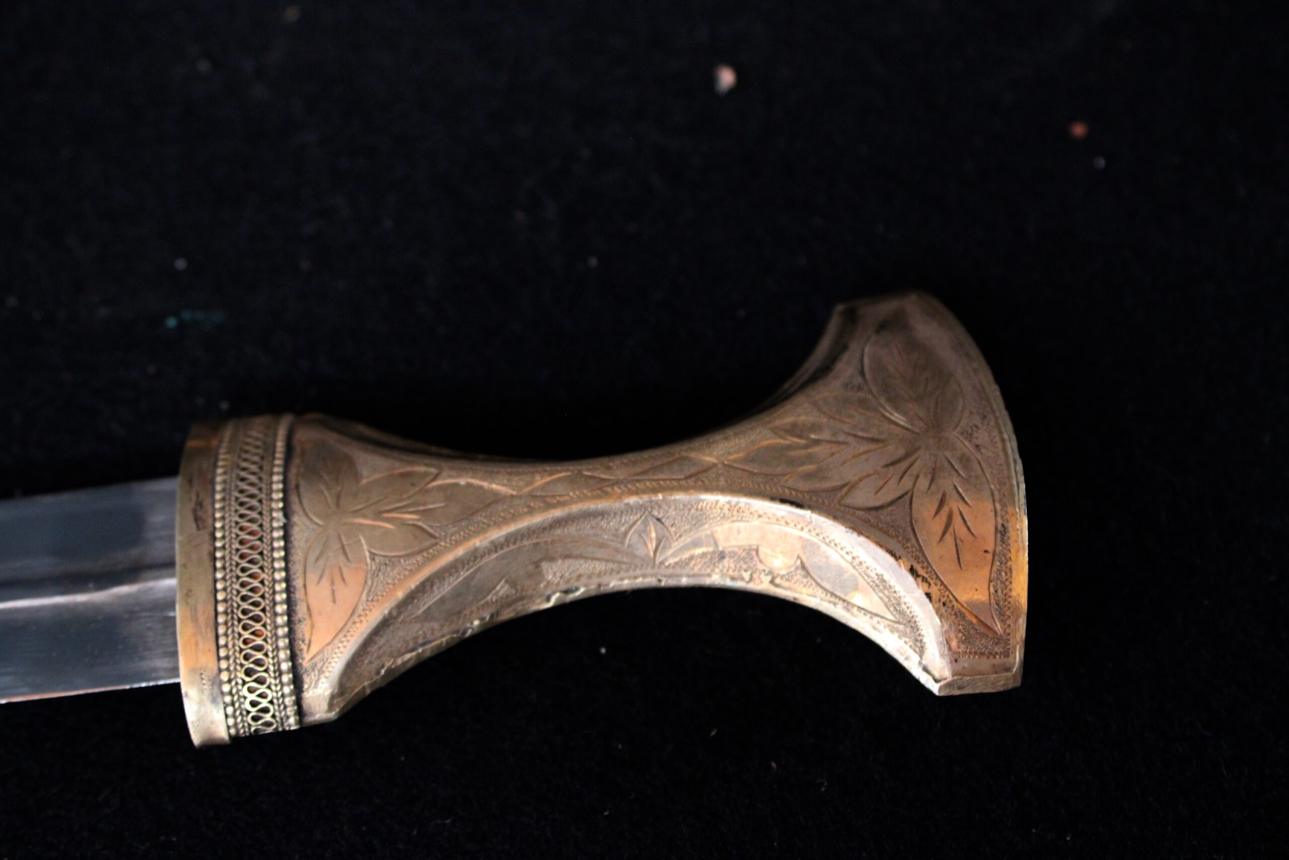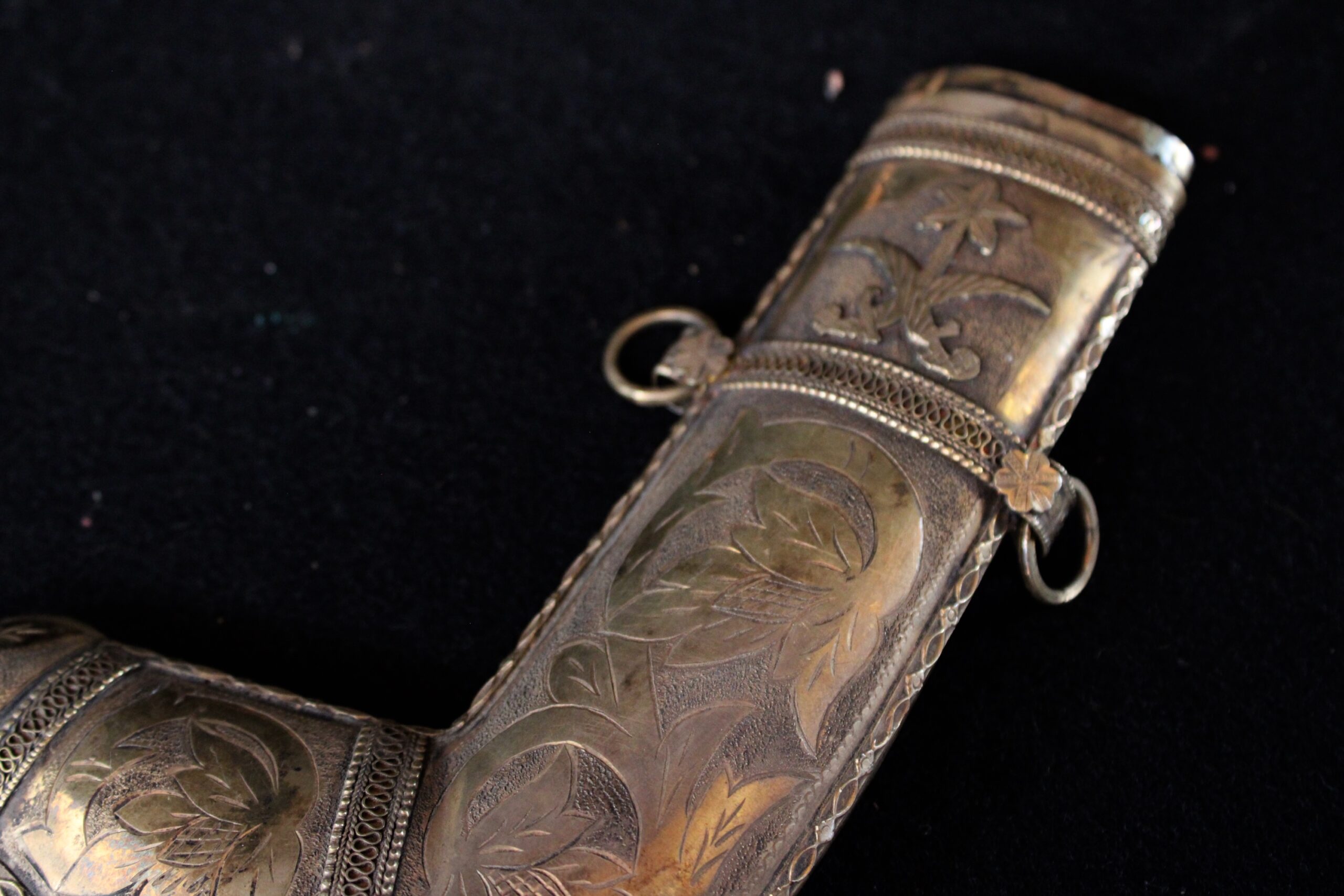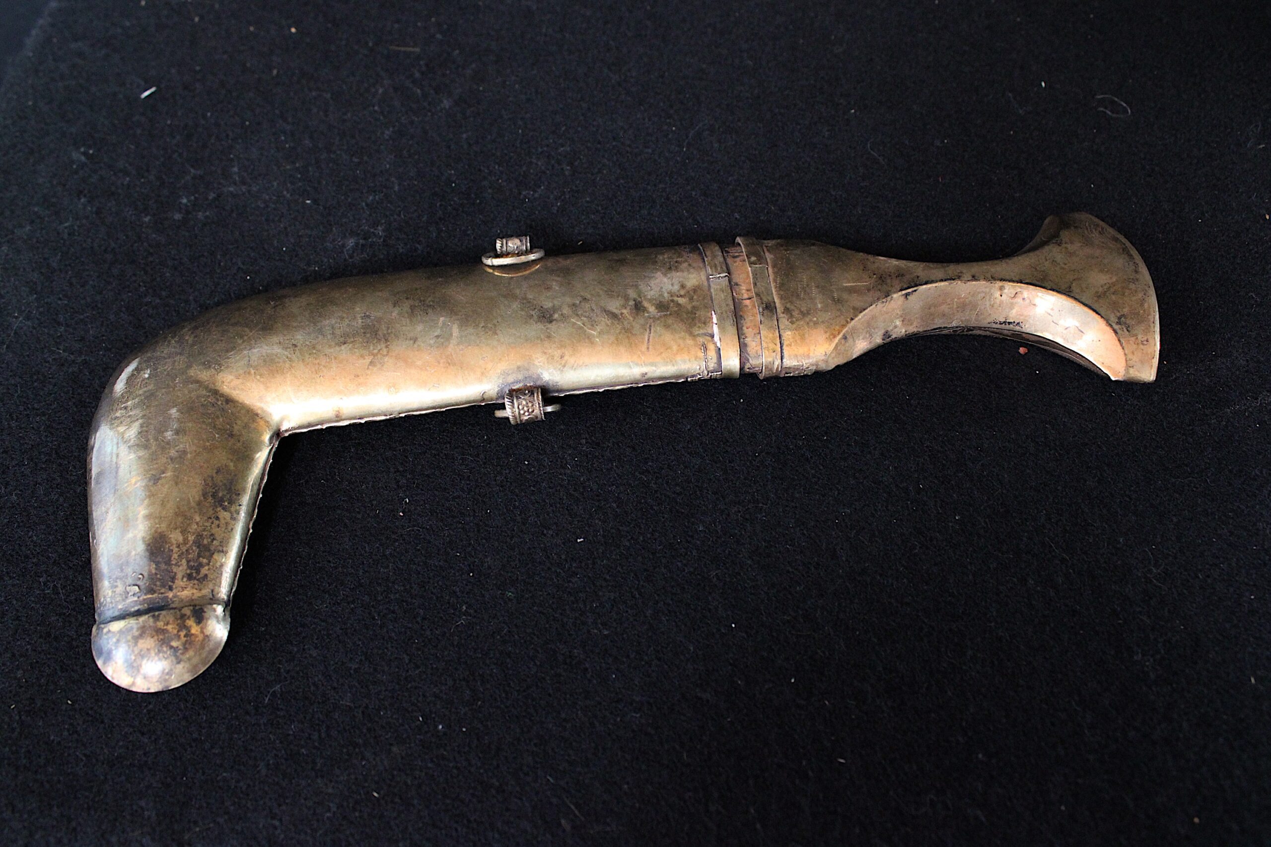 Adult men traditionally wear the Janbiya dagger. The quality of the materials, fabrication and decoration are an indication of status. Janbiyas originated in Yemen and are usually associated with the people of Yemen and Najran in Saudi Arabia. 10.75″x4″x.75″ Please see pictures for condition details as the photos are considered part of the description.