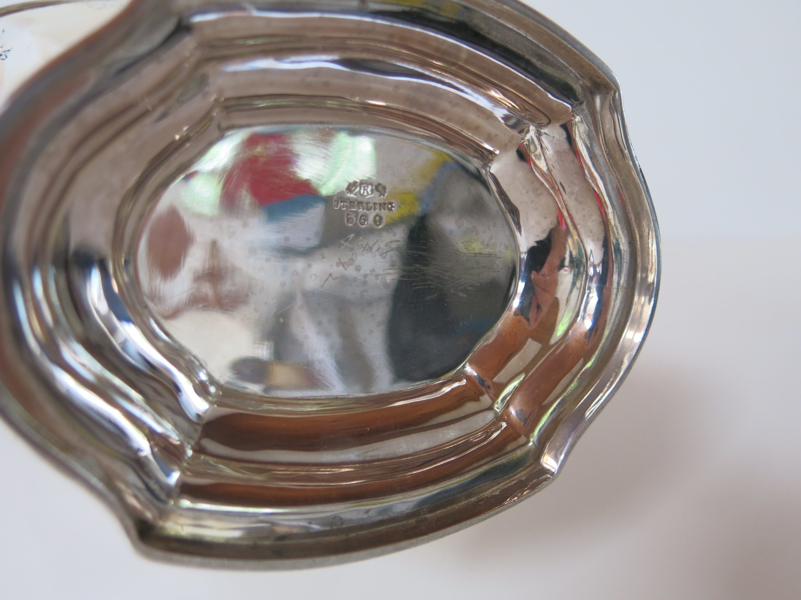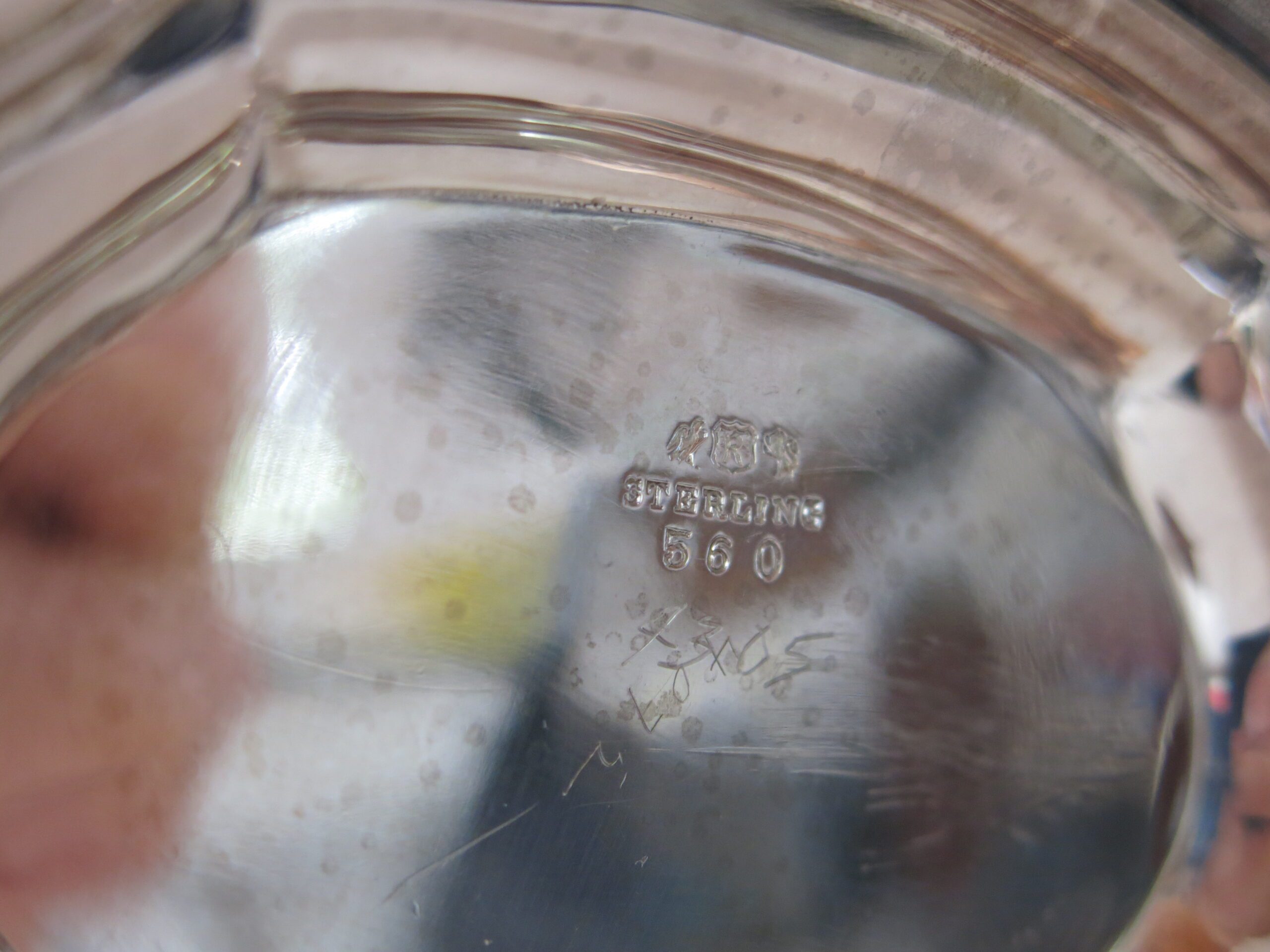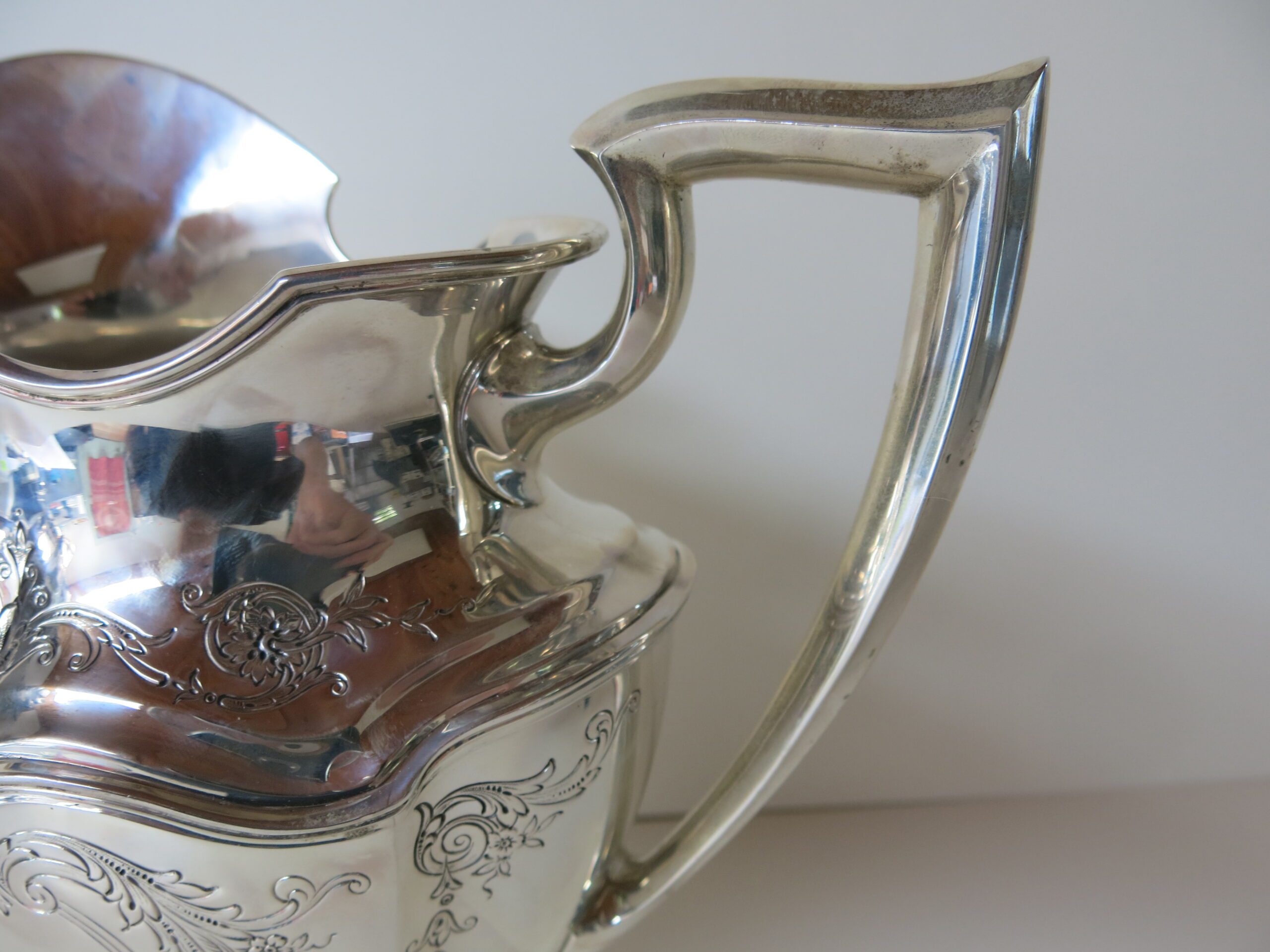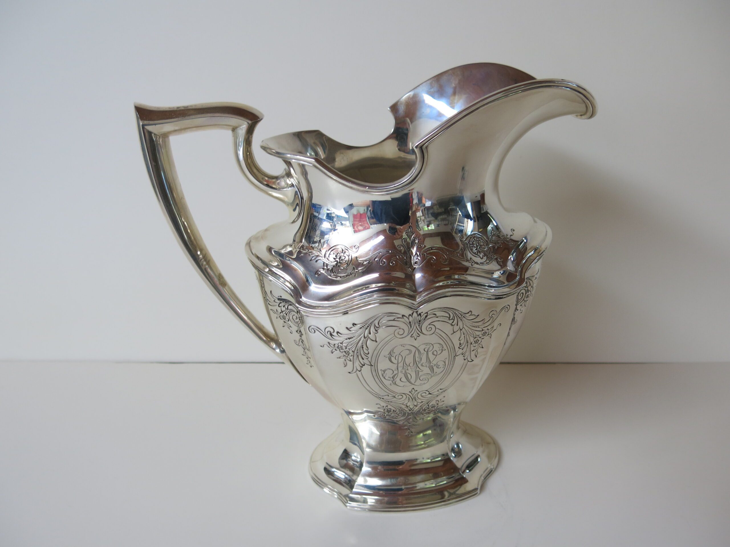 Description: In the Federalist style with garland and foliate etching on the shoulders and body. Deeply scalloped rim that tapers to a narrow pouring spout. Cartouche on one side empty, other has ASL monogram. Triple step base. Marked Reed & Barton Sterling 560 on bottom. 950g. Please see pictures for condition details as the photos are considered part of the description.