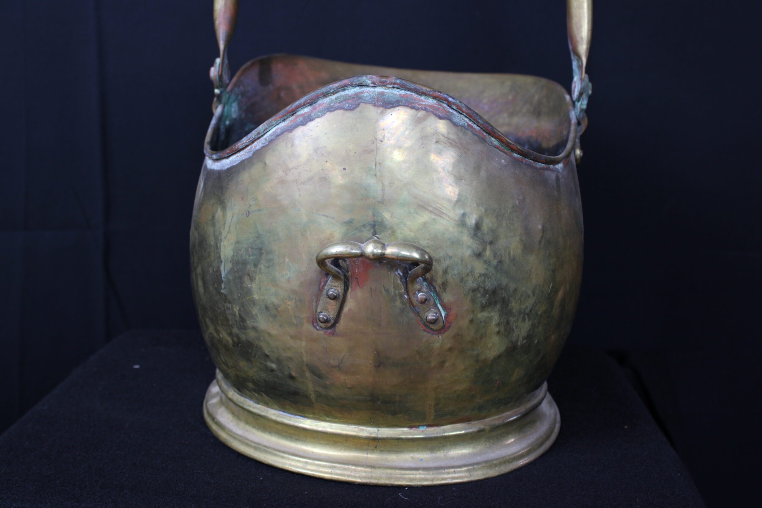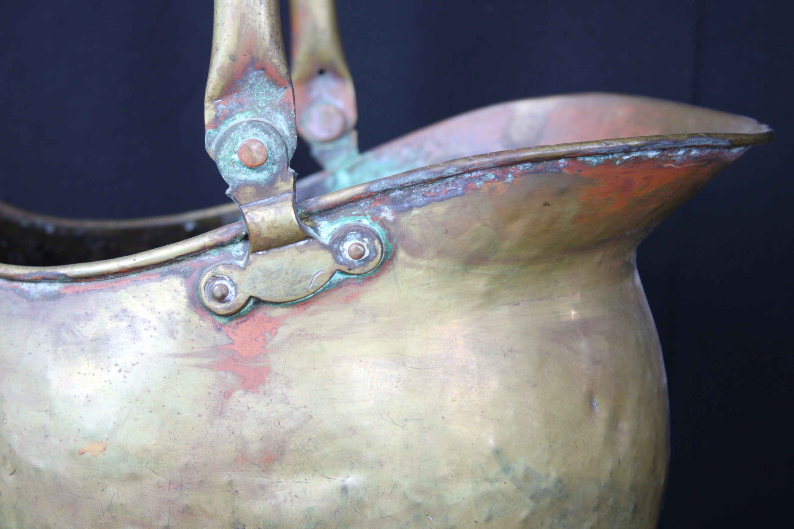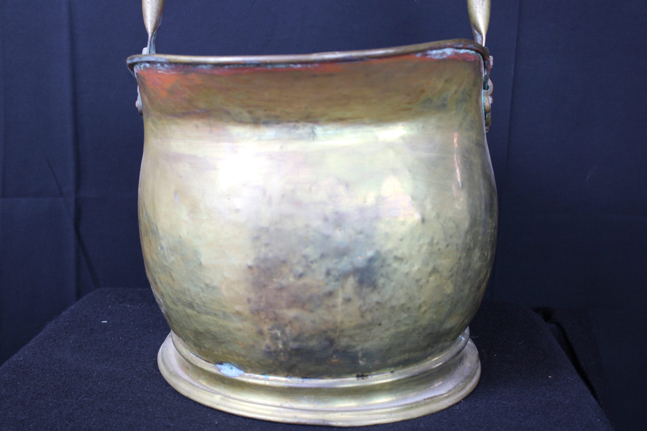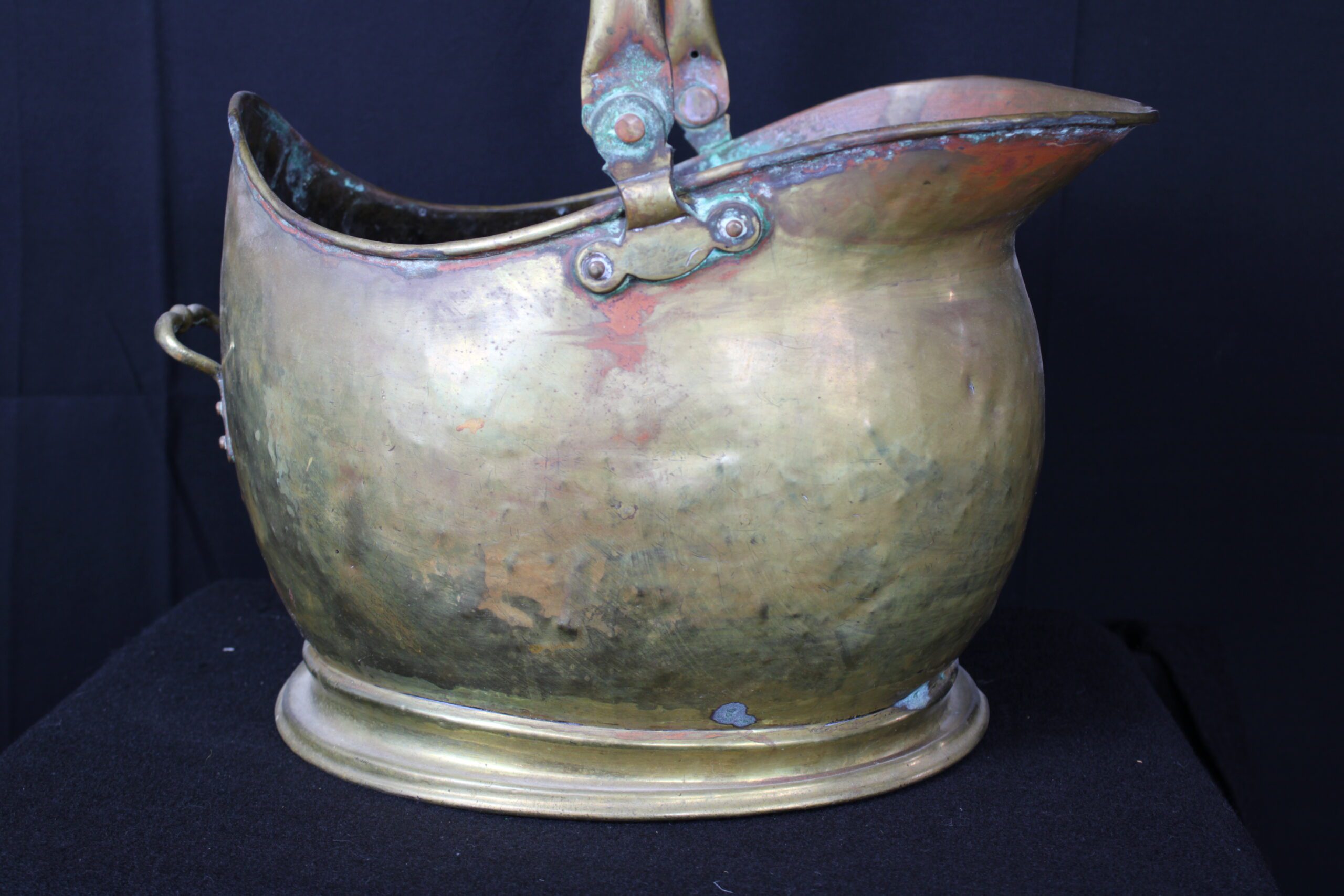 This object is an antique brass coal scuttle, also known as a coal bucket or hod. These were essential household items in the 18th and 19th centuries, used to carry and store a small supply of coal near an indoor fireplace or stove. Originally designed for utility, they allowed for easy pouring of coal onto a fire due to their slanted open tops. By the mid-19th century, many were used to hold logs as well. The distinctive “helmet” design seen in your image became especially popular during the Victorian era (mid-to-late 1800s), adding a decorative touch to a functional item. Please see pictures for condition details as the photos are considered a part of the description.