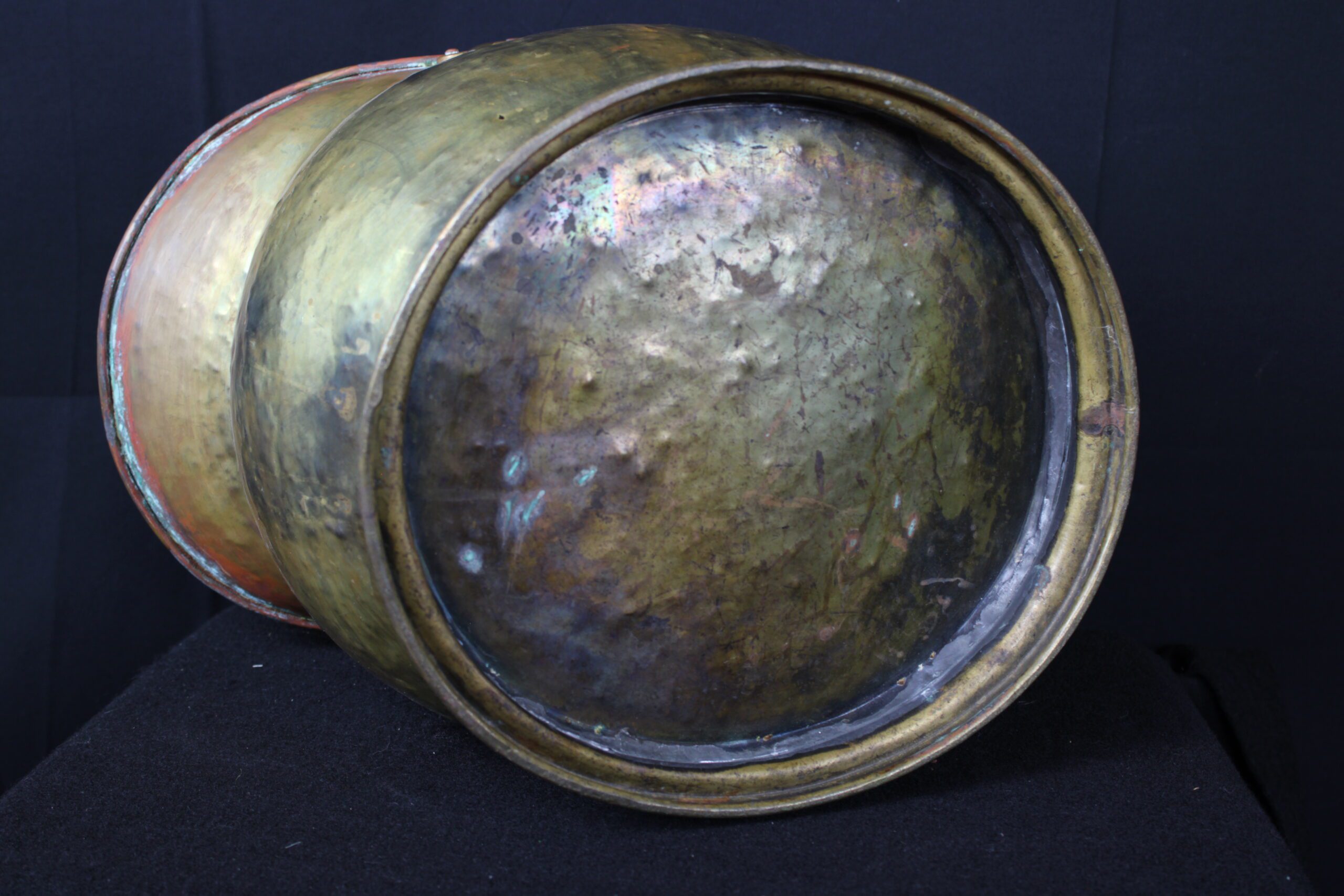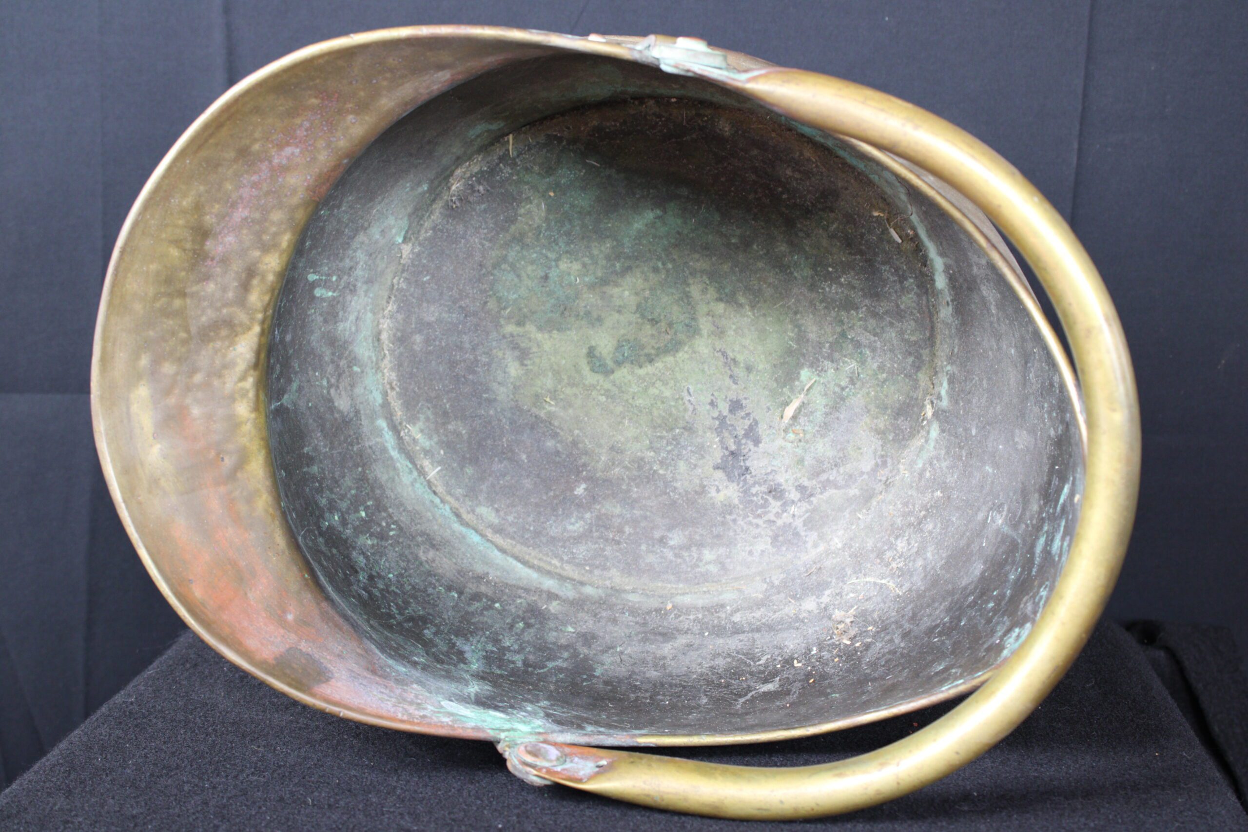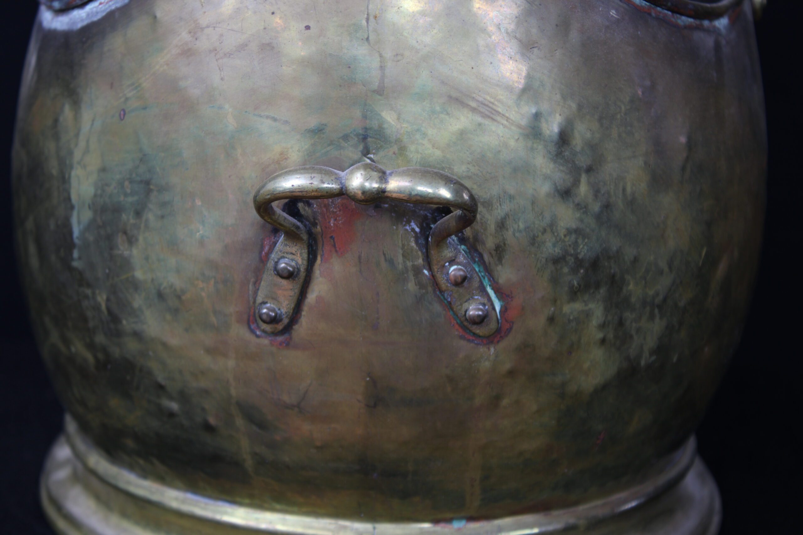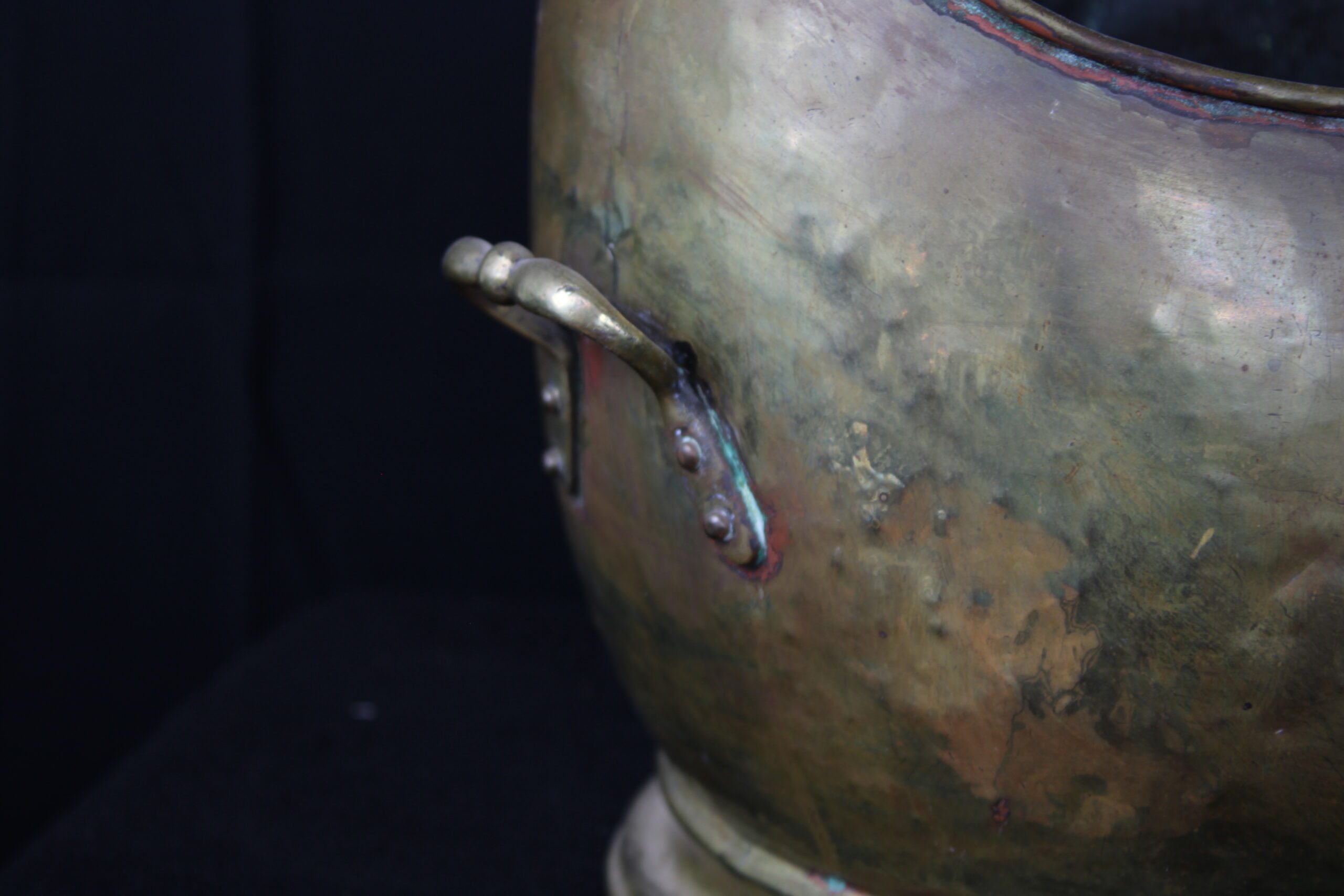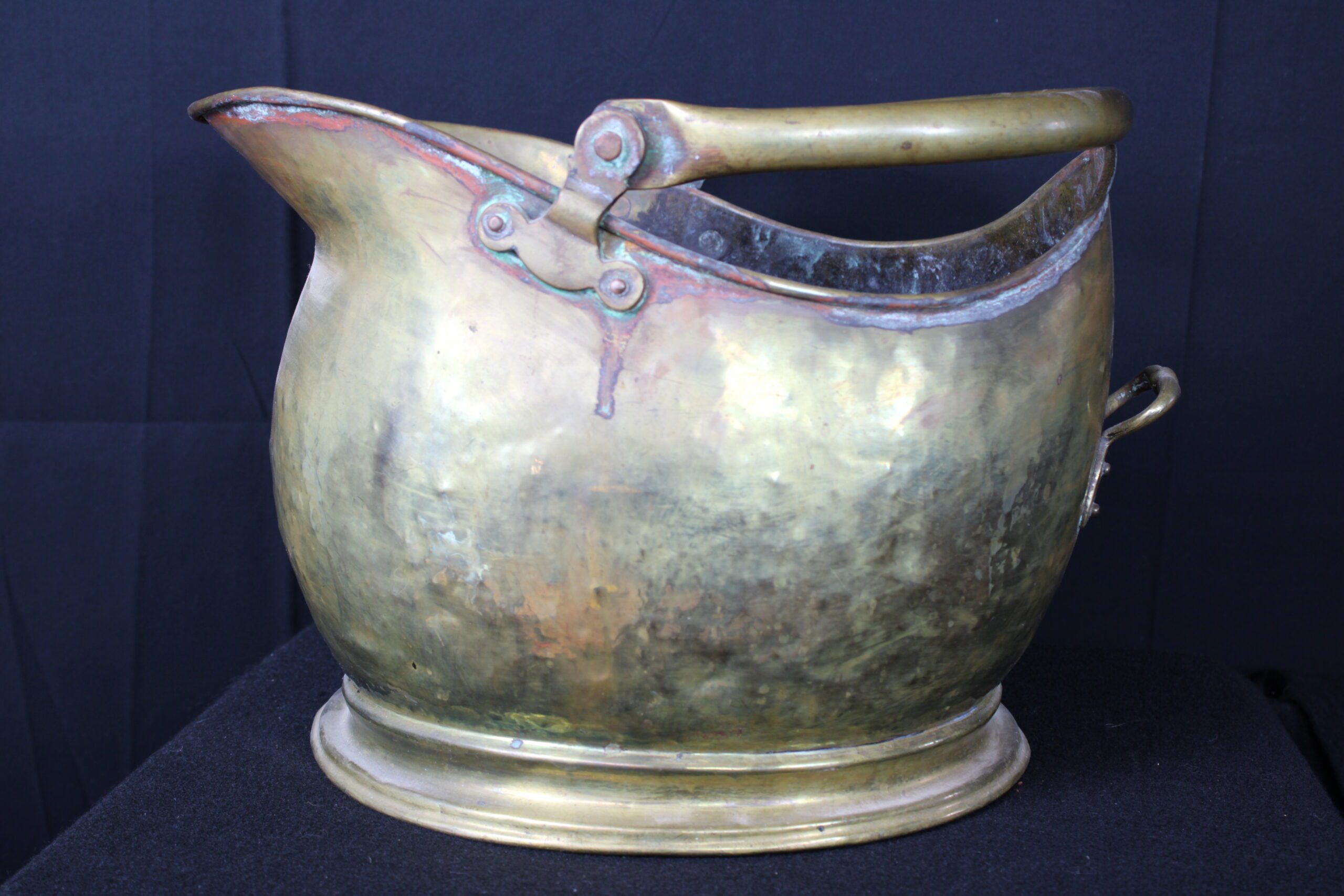 This object is an antique brass coal scuttle, also known as a coal bucket or hod. These were essential household items in the 18th and 19th centuries, used to carry and store a small supply of coal near an indoor fireplace or stove. Originally designed for utility, they allowed for easy pouring of coal onto a fire due to their slanted open tops. By the mid-19th century, many were used to hold logs as well. The distinctive “helmet” design seen in your image became especially popular during the Victorian era (mid-to-late 1800s), adding a decorative touch to a functional item. Please see pictures for condition details as the photos are considered a part of the description.