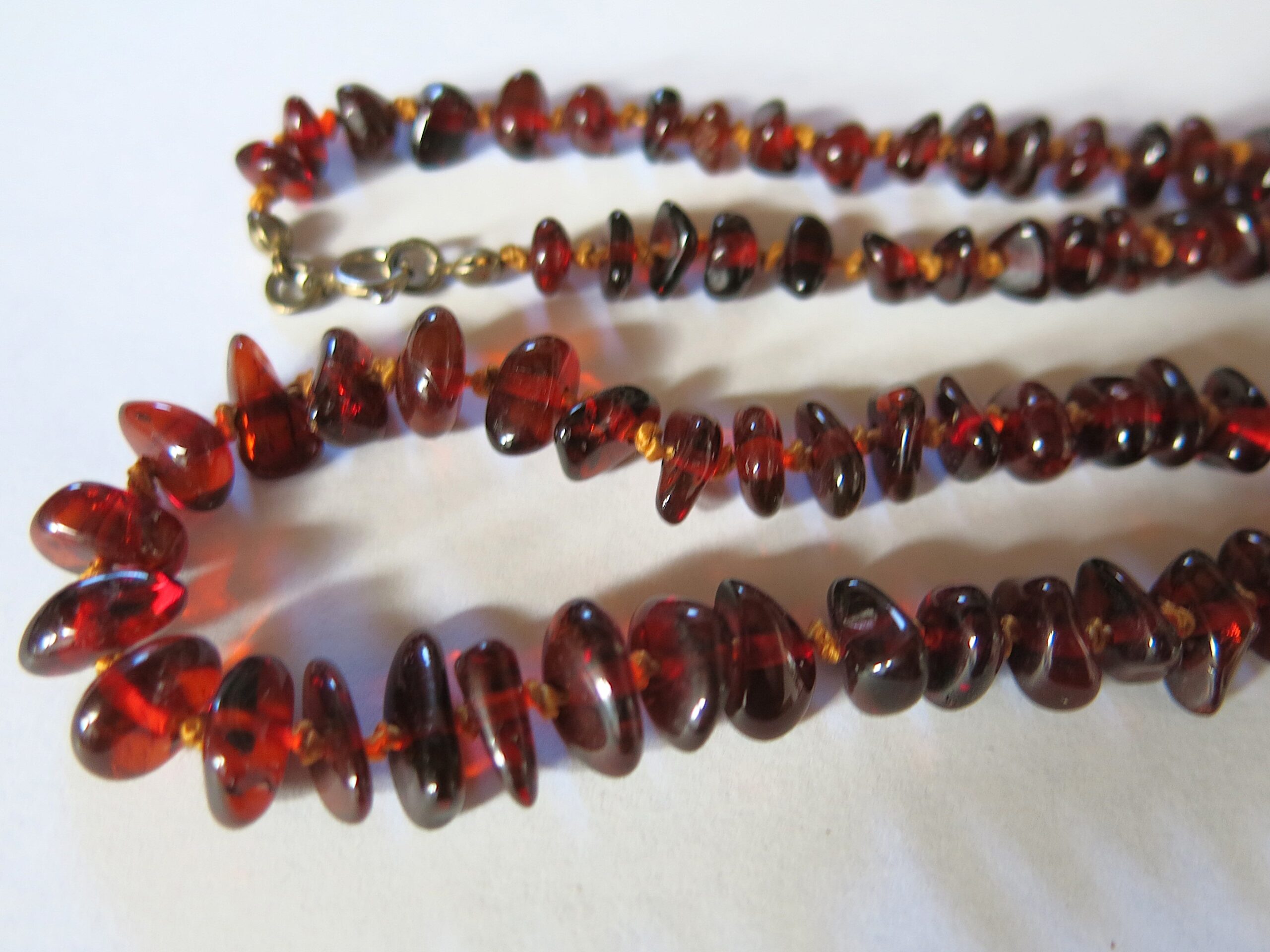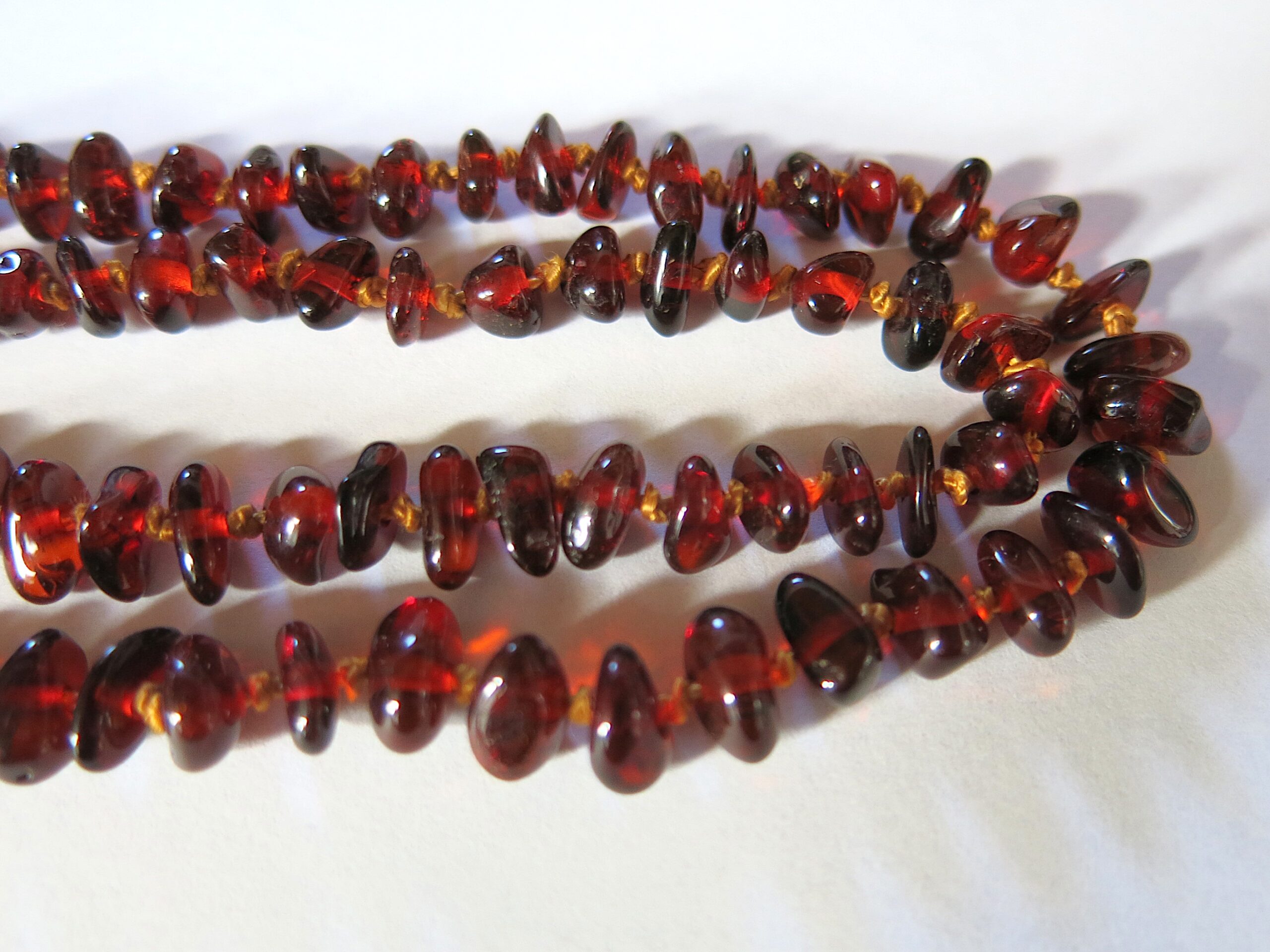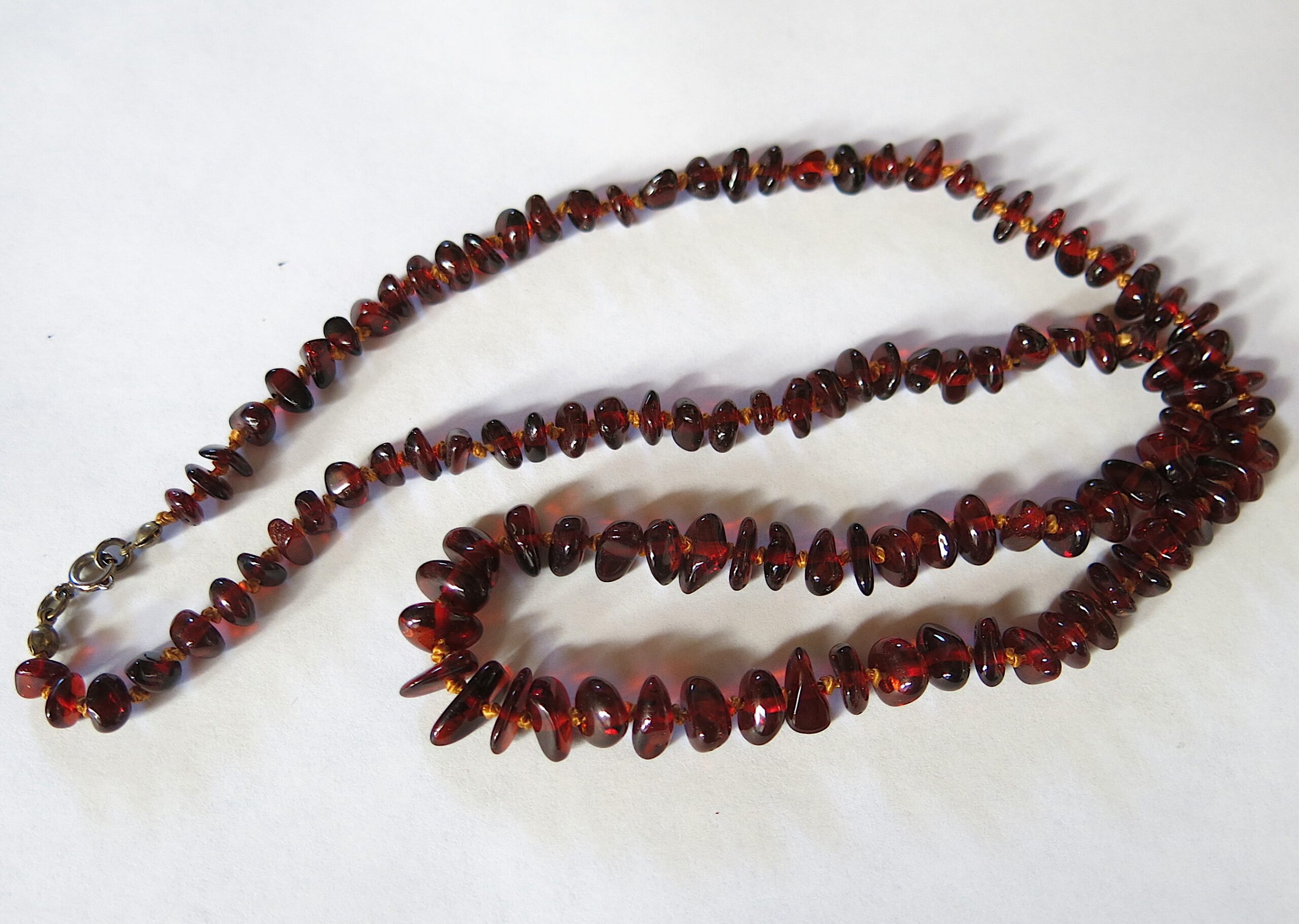 Necklace of graduated deep reddish brown amber nuggets. Beads range in size from 1/4″ to 1/2″ inches wide. The necklace is hand-knotted on silk cord to prevent the beads from rubbing against each other and to ensure security if the strand breaks. 28″