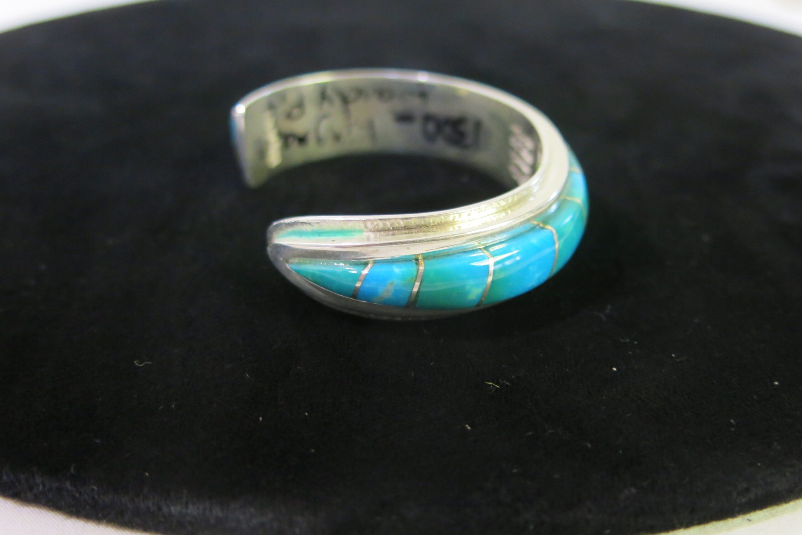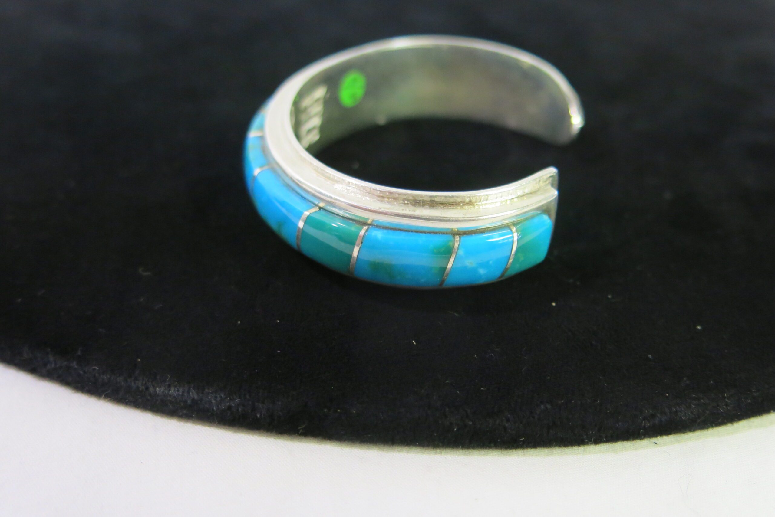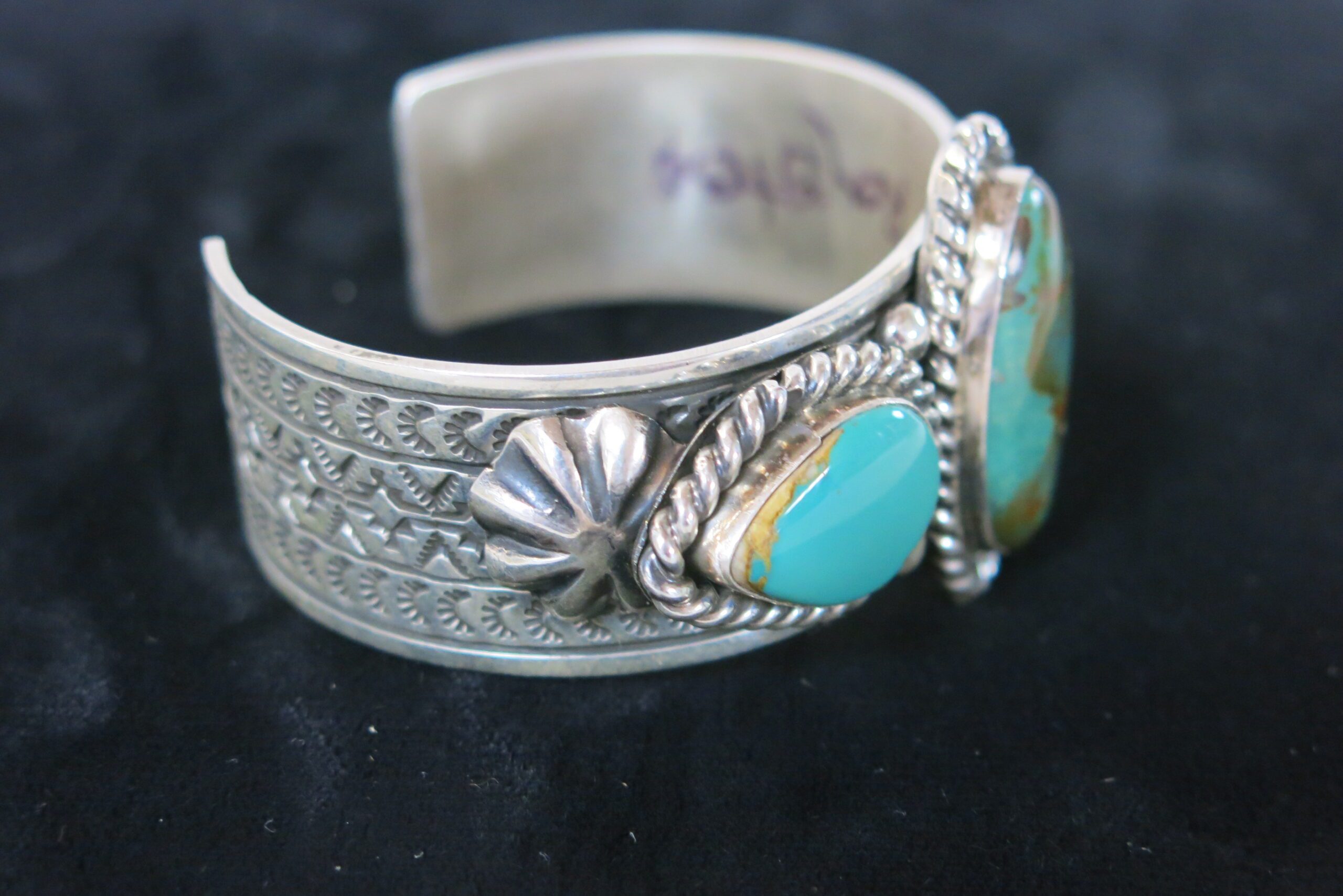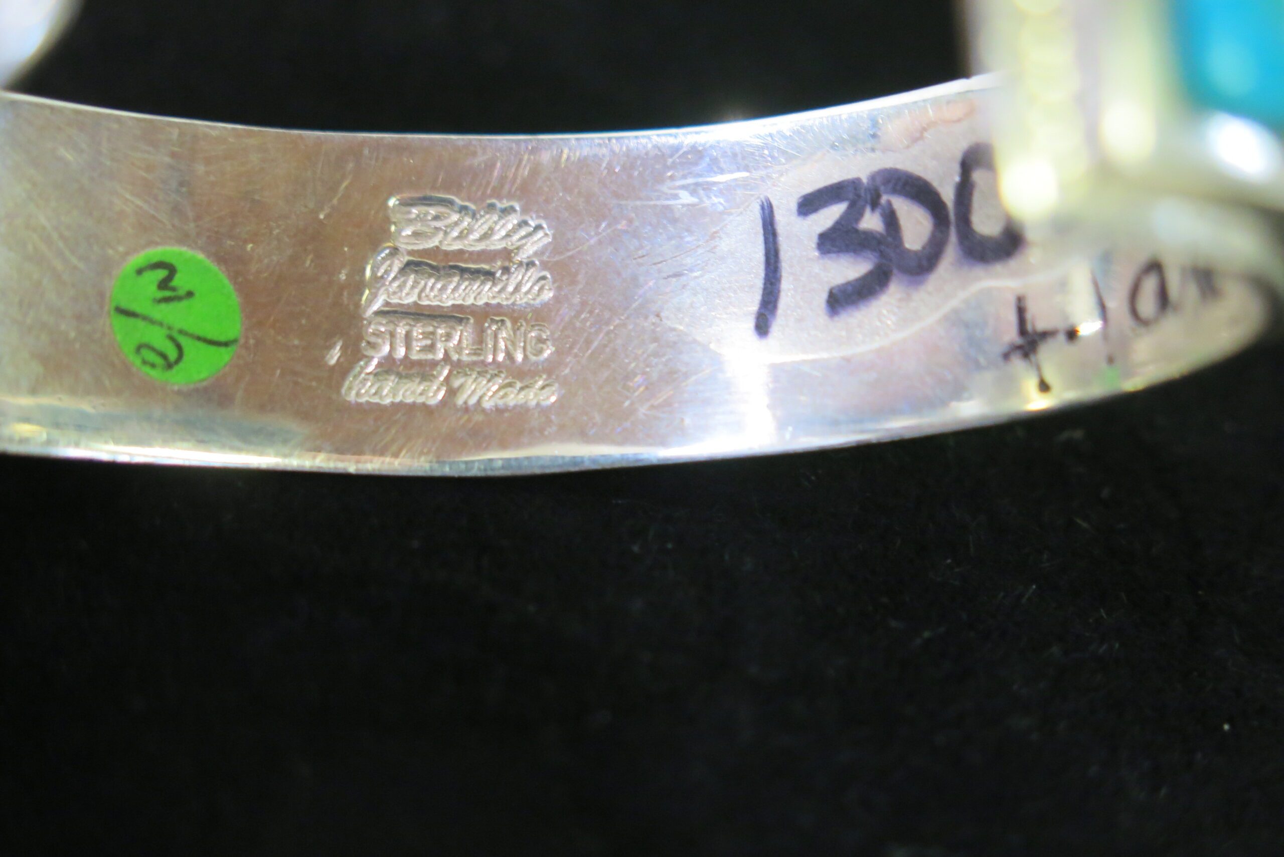 Signed Billy Jaramillo. Sterling Handmade on reverse. Made of sterling silver with Kingman Mine turquoise stones displaying a range of matrix and color variations from light sky blue to darker teal green. Billy Jaramillo, is known for bold designs which incorporate colorful high quality stones and substantial, chunky silver-work. 70g 5.25″ circumference with a 1.25″ opening.