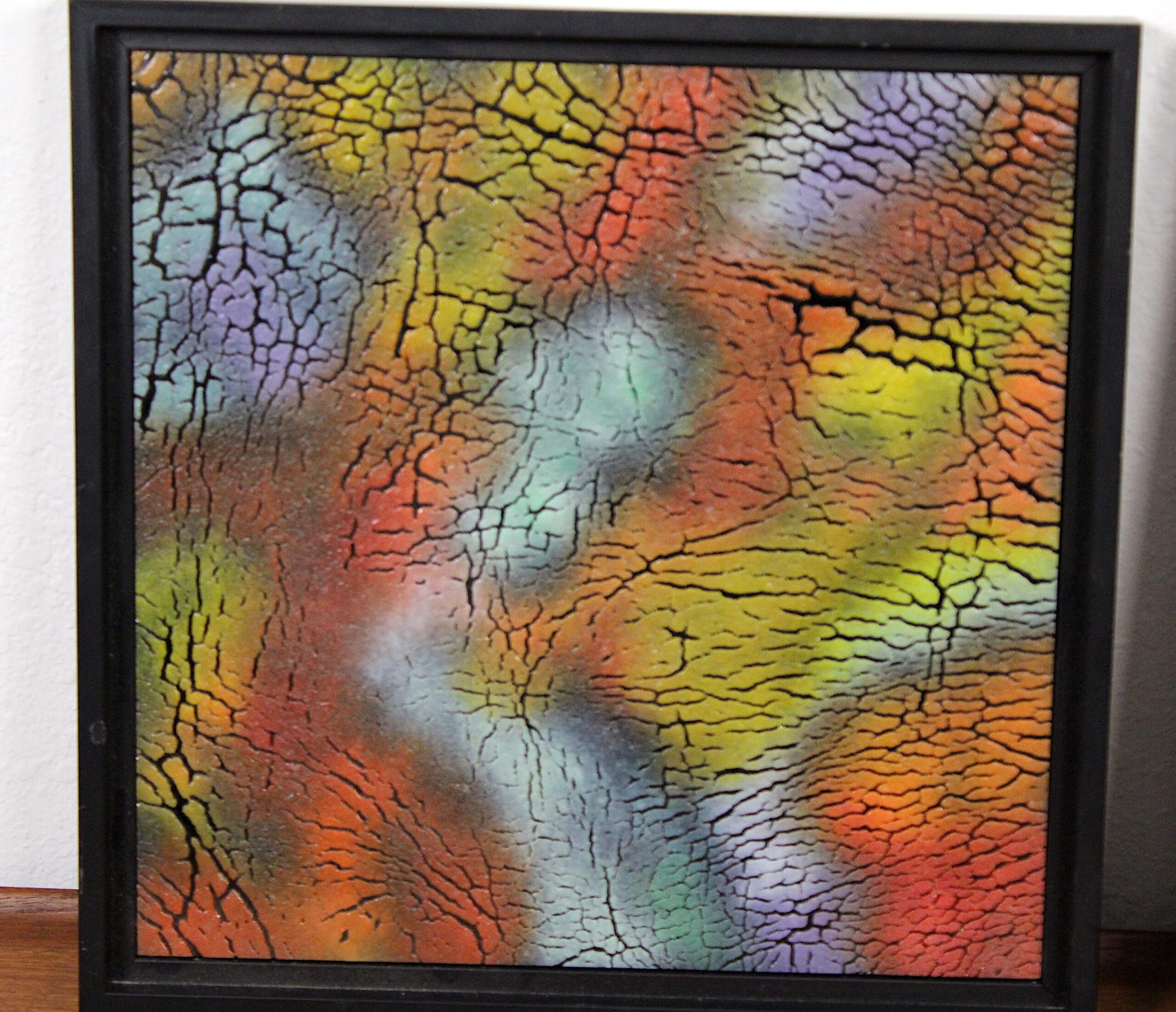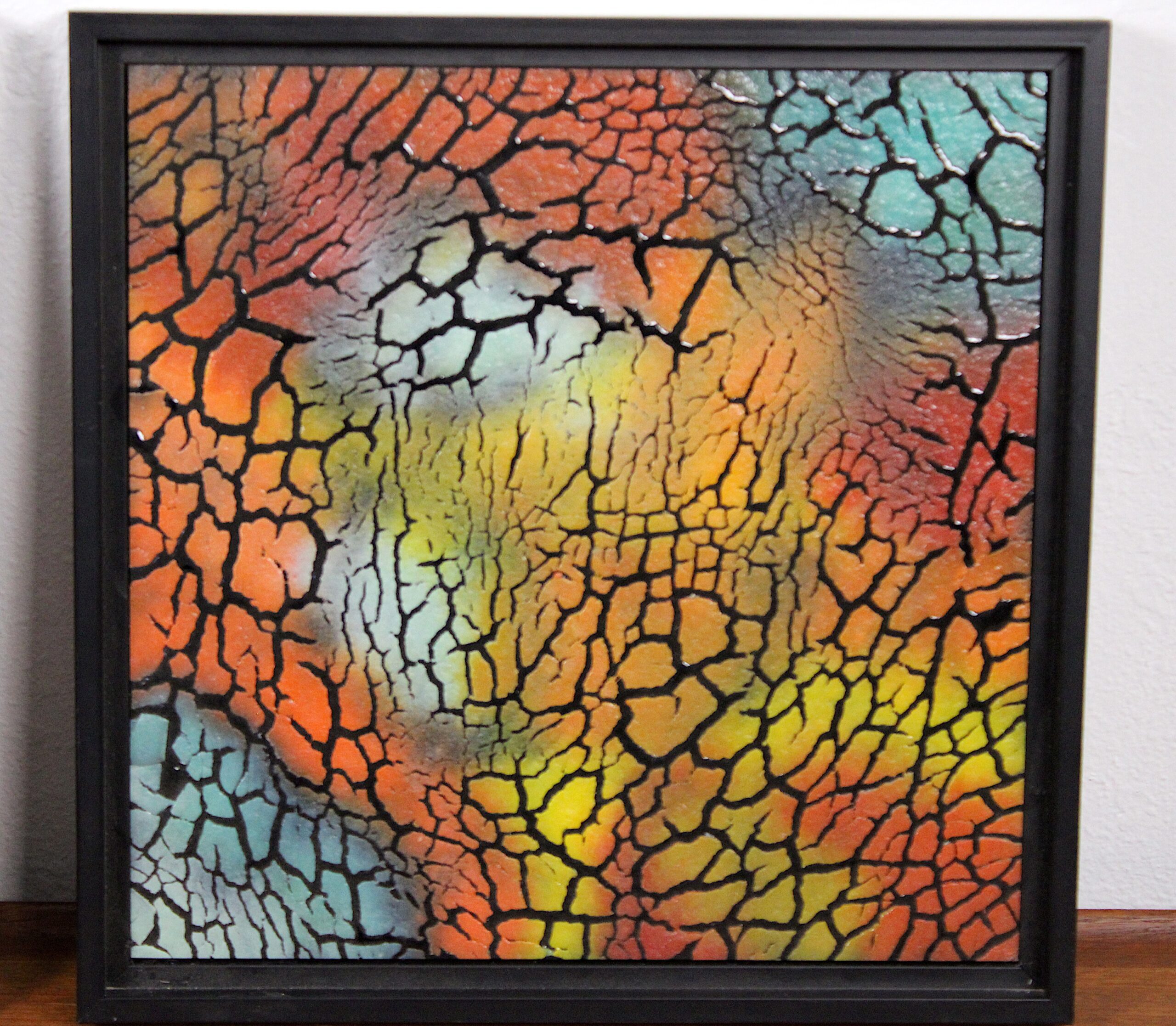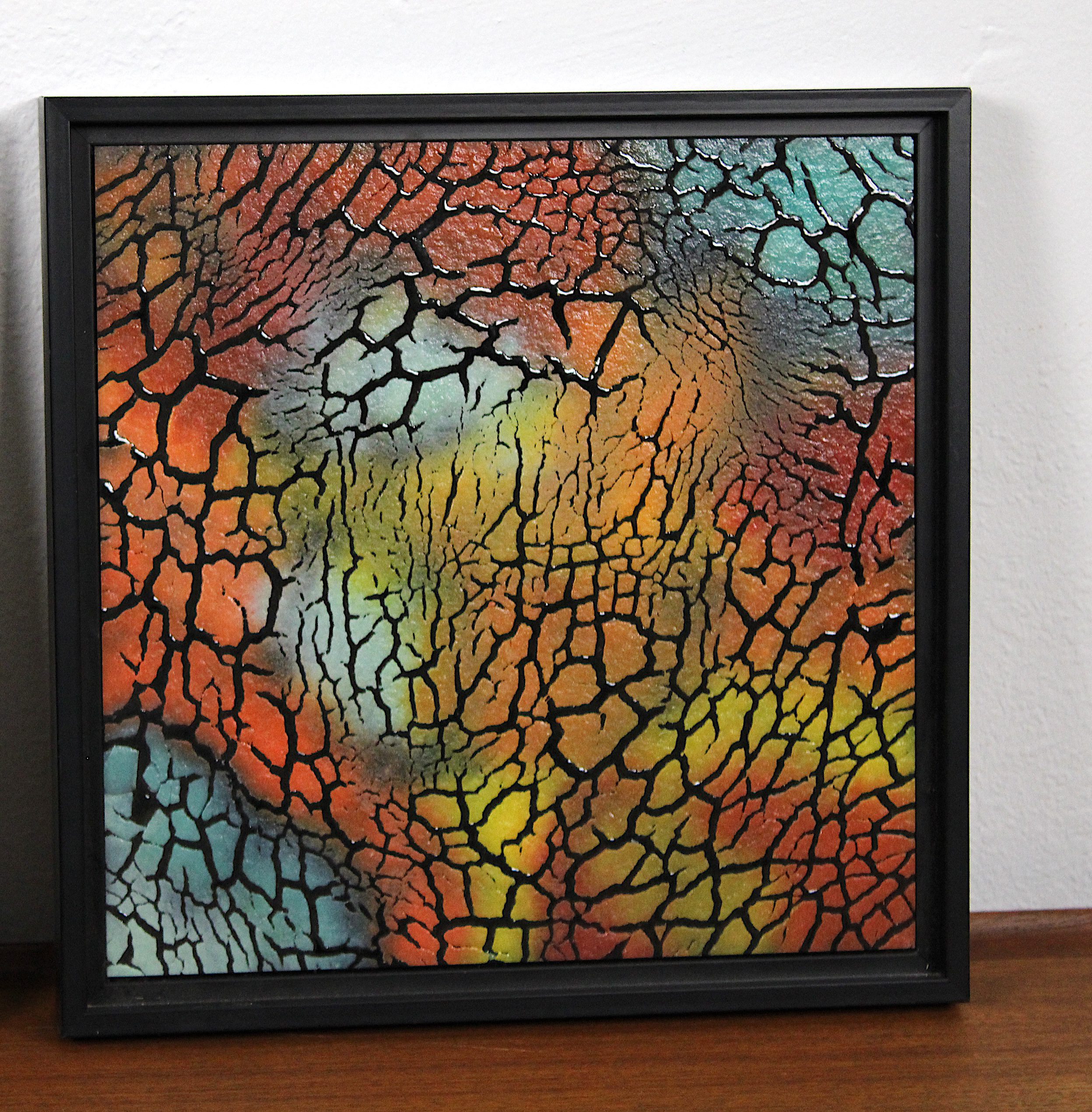 Framed Lichen Series Each panel features a richly colored abstract composition beneath a dramatic all-over crackle surface texture — an organic network of fine black lines creating a cellular, cracked-earth, or neural map effect across the luminous color field beneath. The left panel moves through purple, teal, chartreuse, orange, and red; the right through teal, orange, red, gold, and warm yellow. The glass glows with an inner luminosity that changes with the light source and viewing angle. Charlotte Miller moved to Taos after a 23-year practice attending classes at the Corning Glass Studio, Pilchuck, and other artists’ studios, participating in local and regional exhibitions — and after moving to Taos, she continued her glass art and explored fiber arts. Please see pictures for condition details as the photos are considered part of the description.