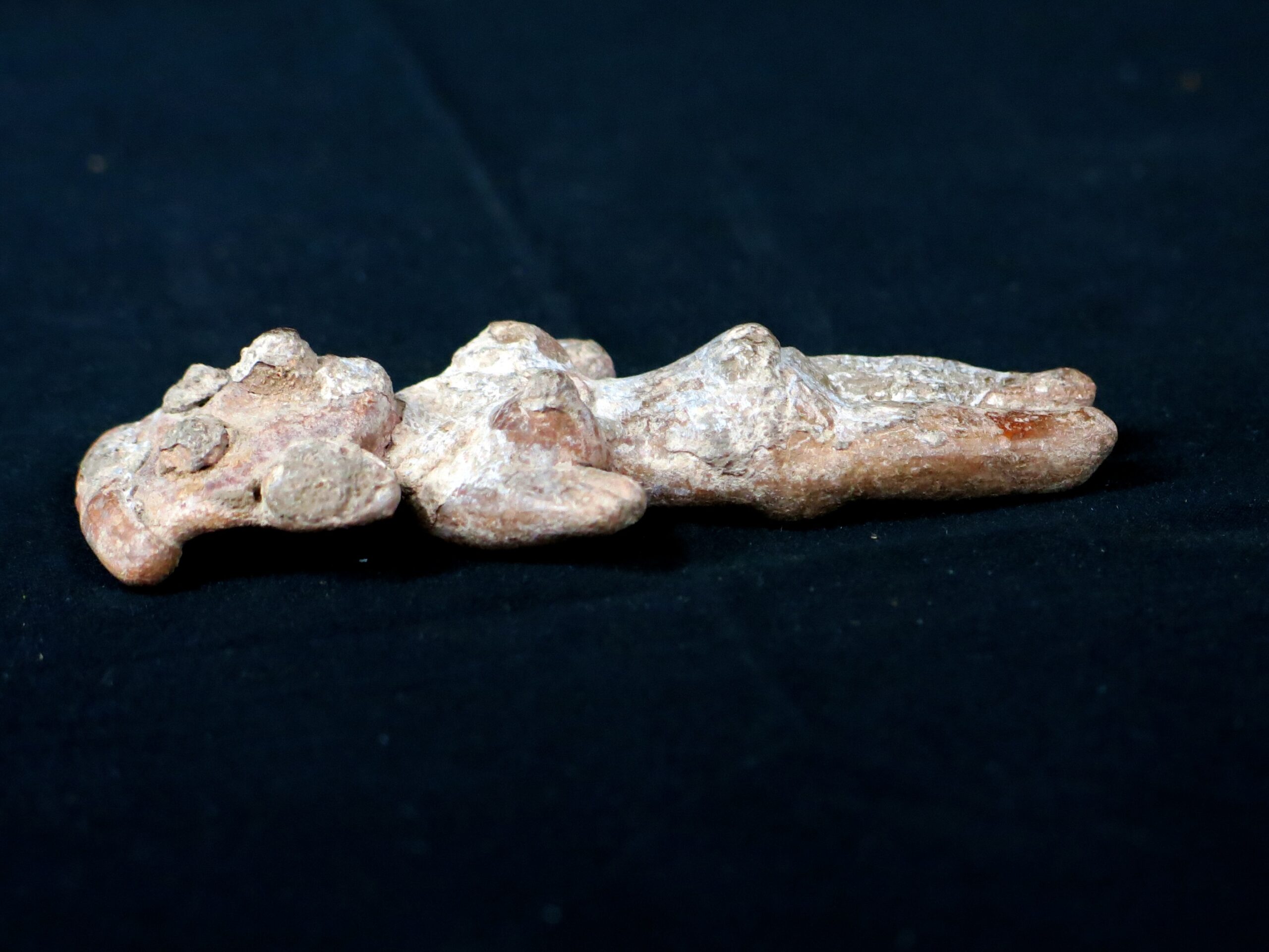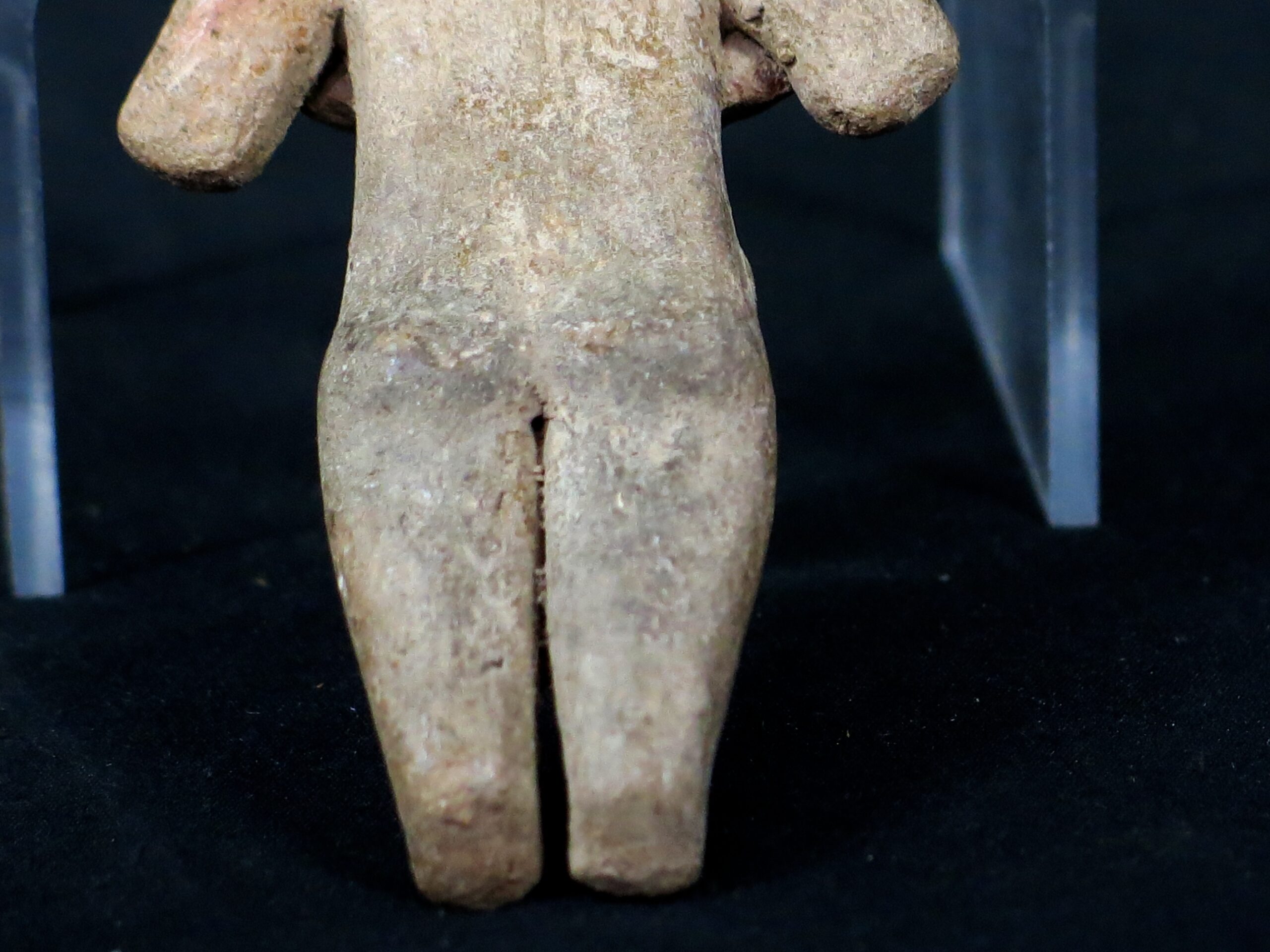Beautifully rendered terra cotta figure with distinct female characteristics. Used as religious talisman and fertility. Tan terra cotta with remnants of pigment on front – well worn reverse. 3.75″ height. Michoaca, Western Mexico. Little is known of the Chupícuaro. They migrated from San Luis Potosi between 800 and 500BC settling north of modern Mexico City. The sites, known only since 1926 include over a dozen pyramids, tombs, altars and other structures, the vast majority of which are, to date, unexplored. Please see pictures for condition details as the photos are considered part of the description.