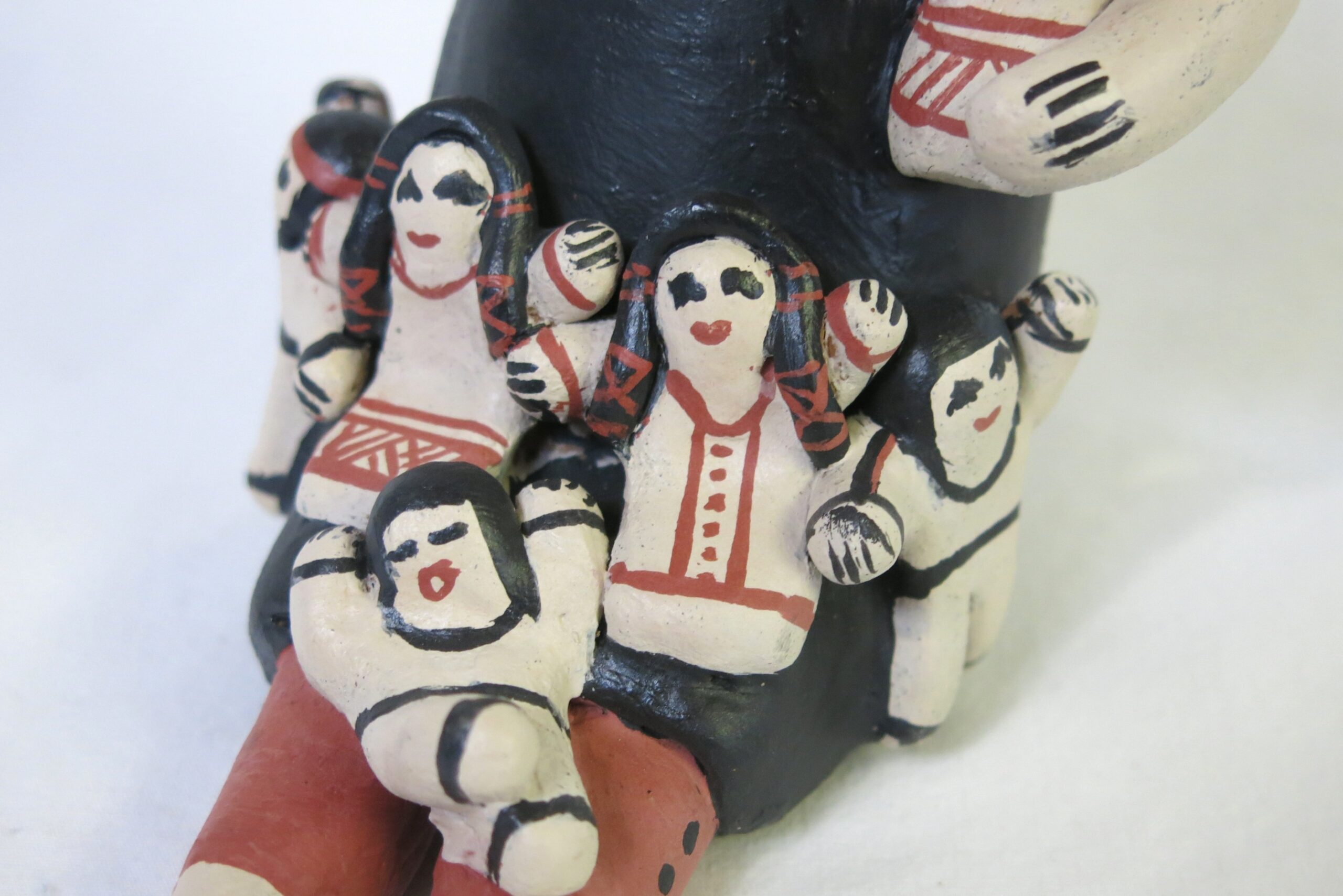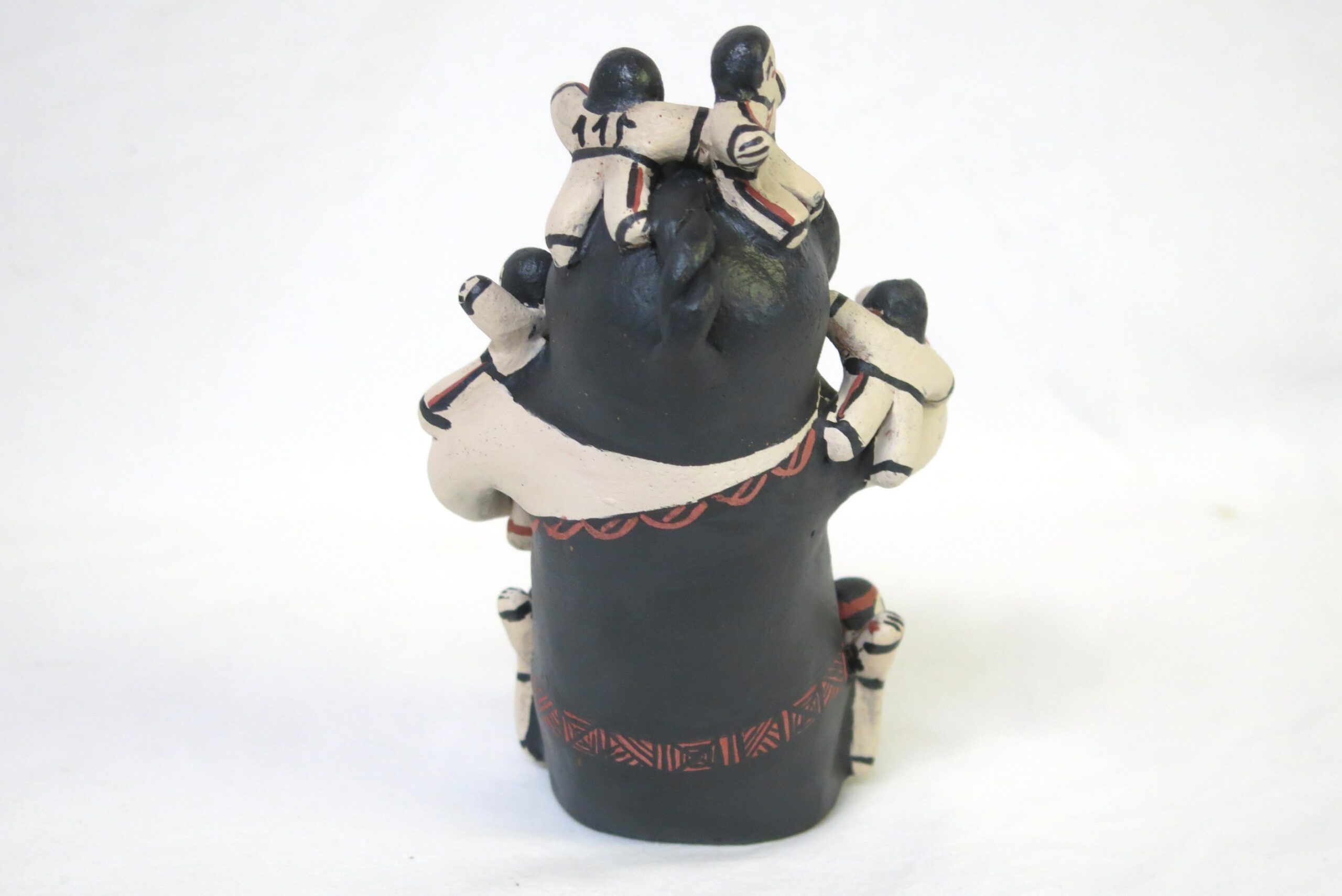 Signed Denise Eustace on the bottom. Denise Eustace comes from a family of jewelers and potters, with her father from Zuni Pueblo and her mother from Cochiti Pueblo. The central grandmother figure is depicted in traditional Pueblo dress with an open mouth, symbolizing the oral tradition of passing down stories. 6″x4″x5.5″ Please see pictures for condition details as the photos are considered part of the description.
