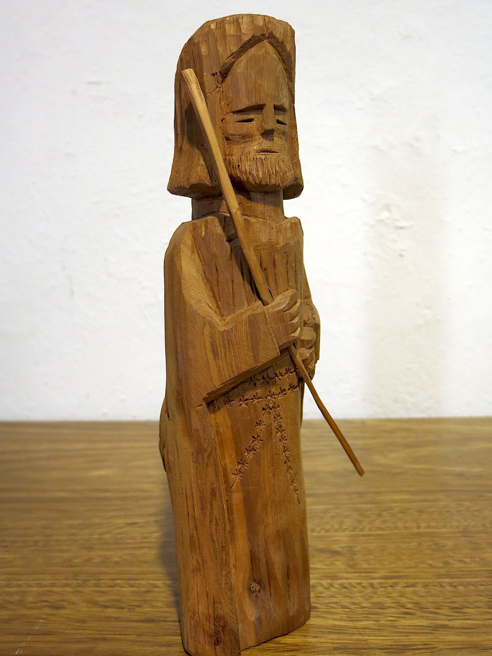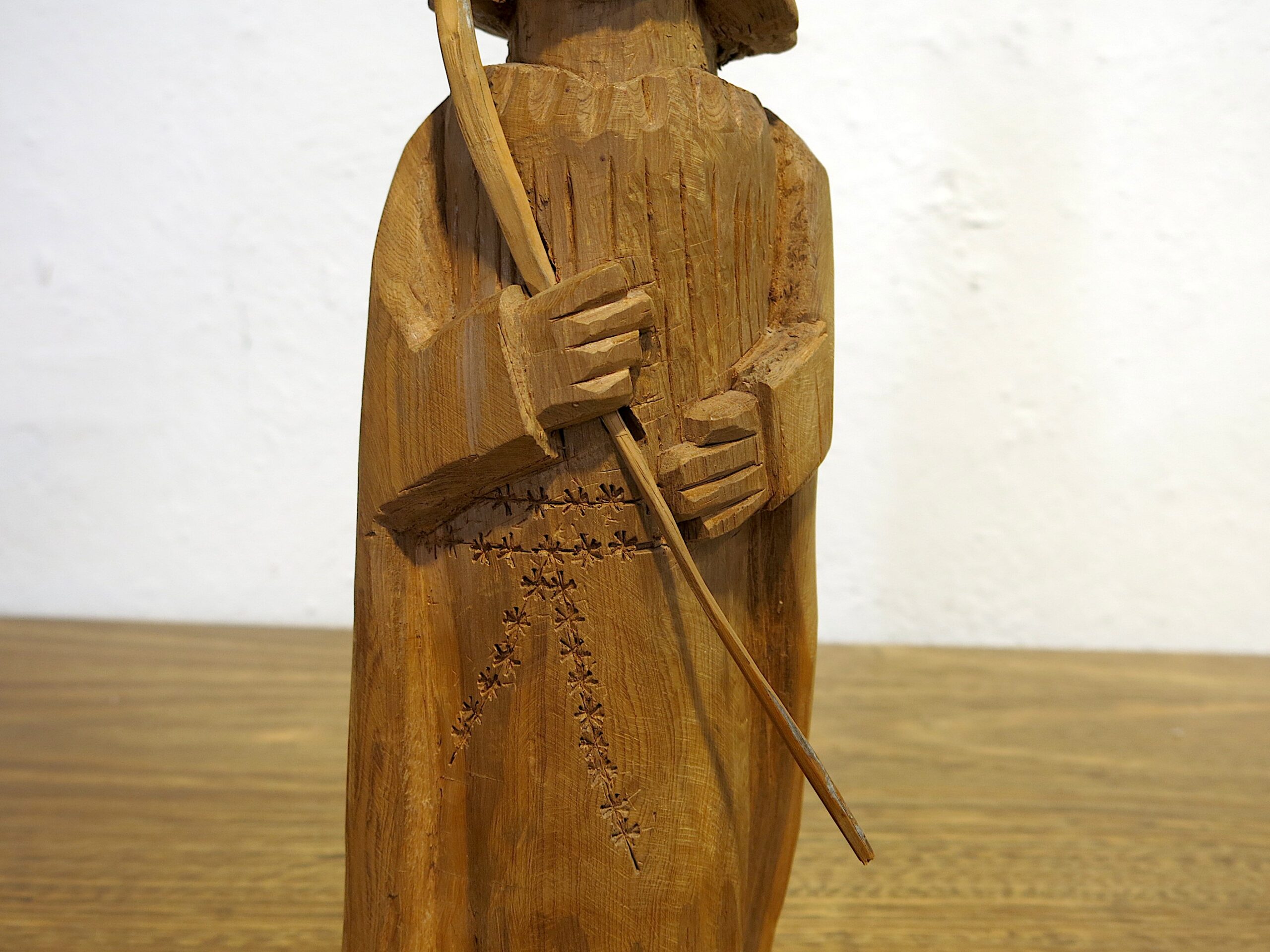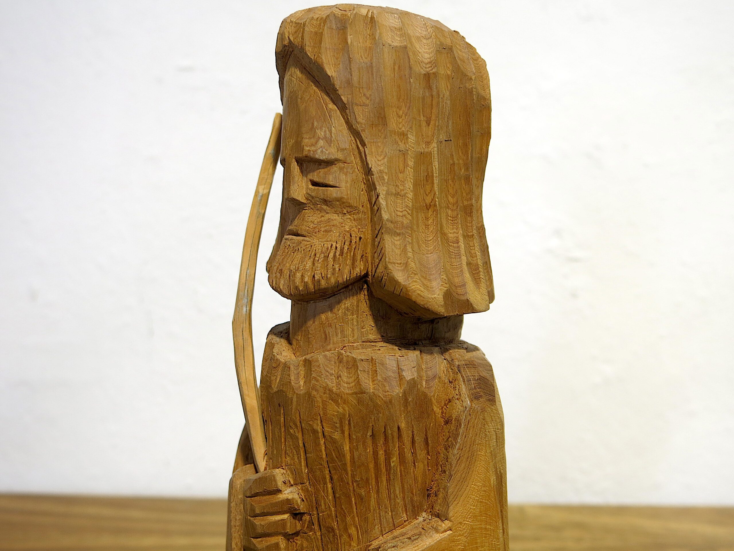 A signed and dated 1976 hand-carved cedar bulto by Ernesto “Ernie” Salazar of Taos, New Mexico — an early and rare example from one of the Salazar family’s most accomplished second-generation santeros. Dated just a few years after Ernesto learned to carve directly from his father, legendary santero Leo G. Salazar, this piece reflects the raw, direct carving energy of his formative period. The bearded, hooded figure holds a staff or farming implement diagonally across the body. A rosary is carved in relief on the robe using an asterisk/star-punch pattern. Natural, unfinished cedar throughout with visible tool marks adding to the handmade authenticity. 11.75″x4.25″x3.5″ 1.5 lbs Please see pictures for condition details as the photos are considered part of the description.