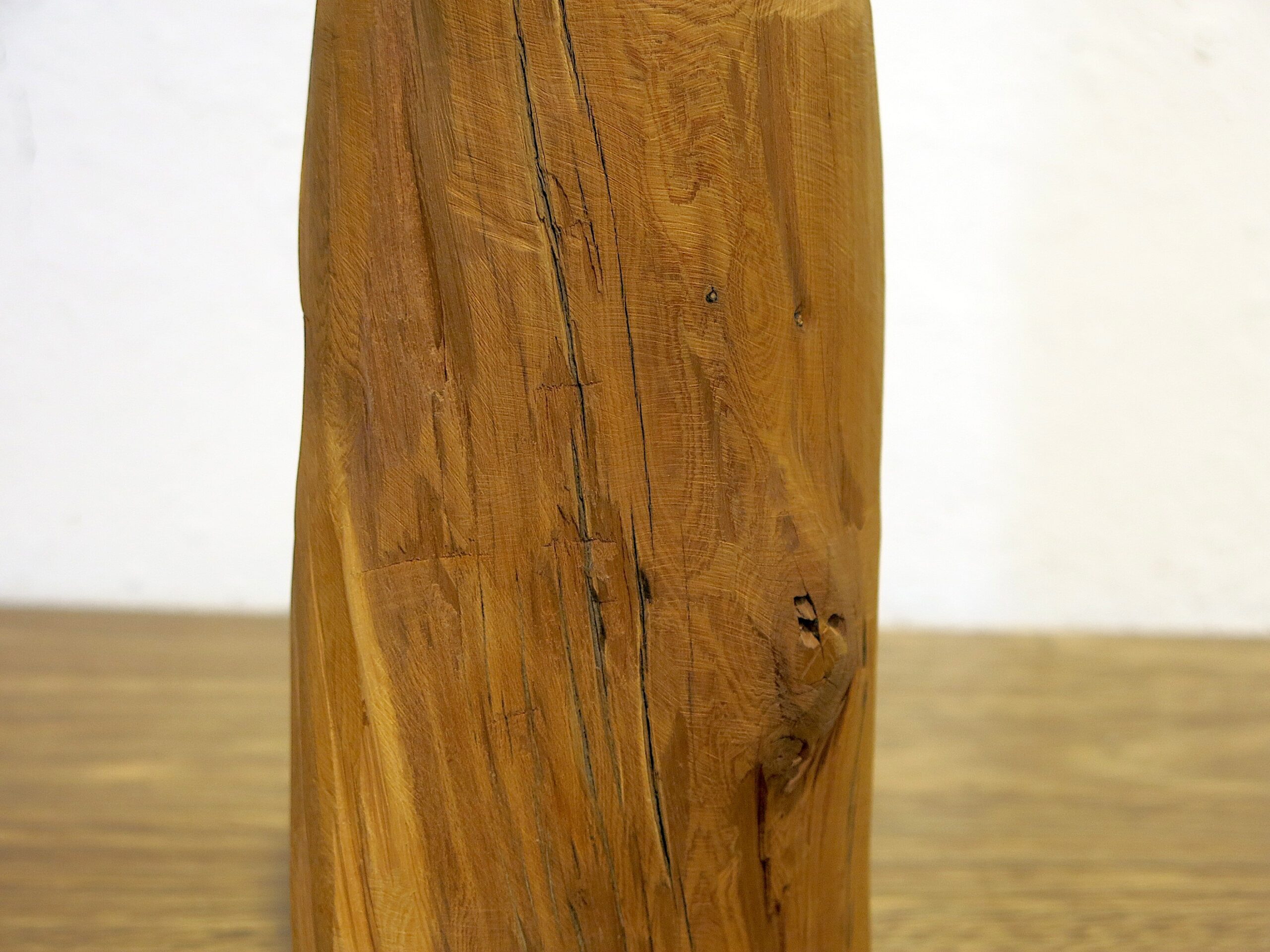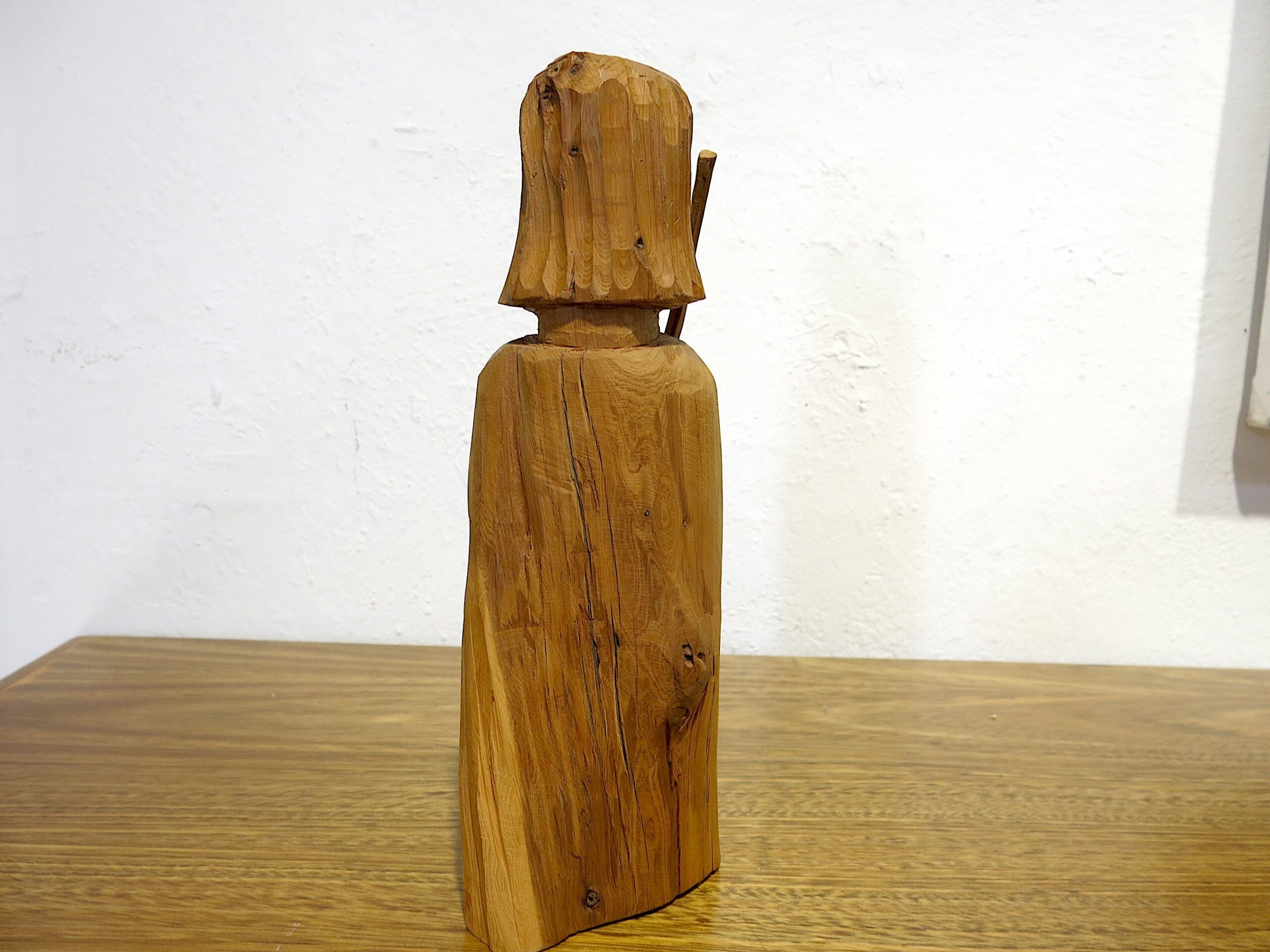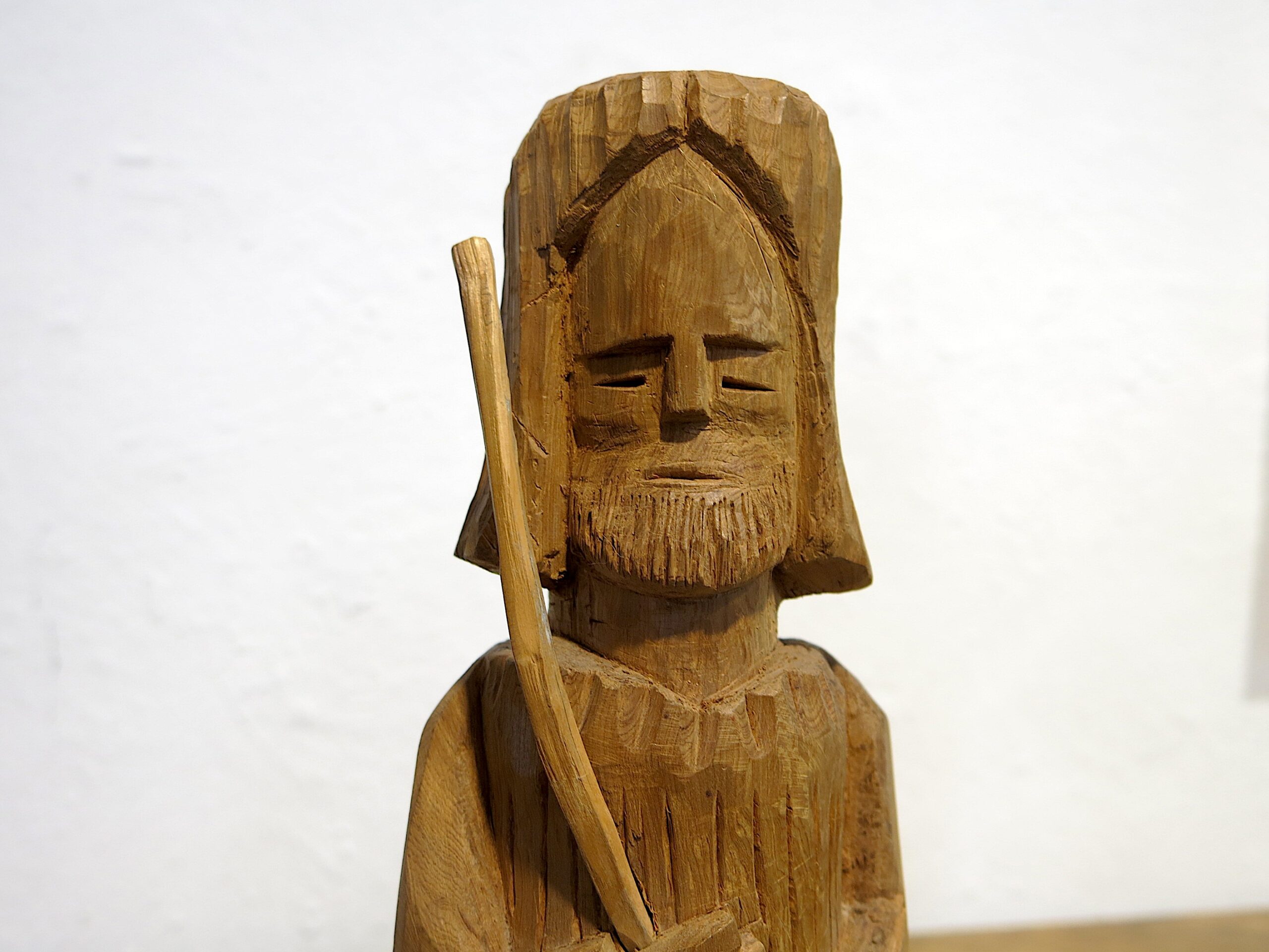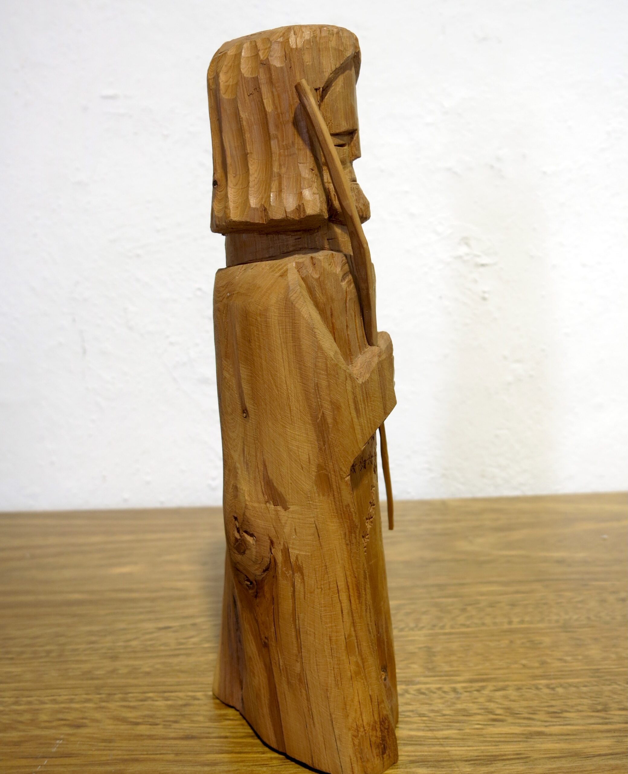 A signed and dated 1976 hand-carved cedar bulto by Ernesto “Ernie” Salazar of Taos, New Mexico — an early and rare example from one of the Salazar family’s most accomplished second-generation santeros. Dated just a few years after Ernesto learned to carve directly from his father, legendary santero Leo G. Salazar, this piece reflects the raw, direct carving energy of his formative period. The bearded, hooded figure holds a staff or farming implement diagonally across the body. A rosary is carved in relief on the robe using an asterisk/star-punch pattern. Natural, unfinished cedar throughout with visible tool marks adding to the handmade authenticity. 11.75″x4.25″x3.5″ 1.5 lbs Please see pictures for condition details as the photos are considered part of the description.