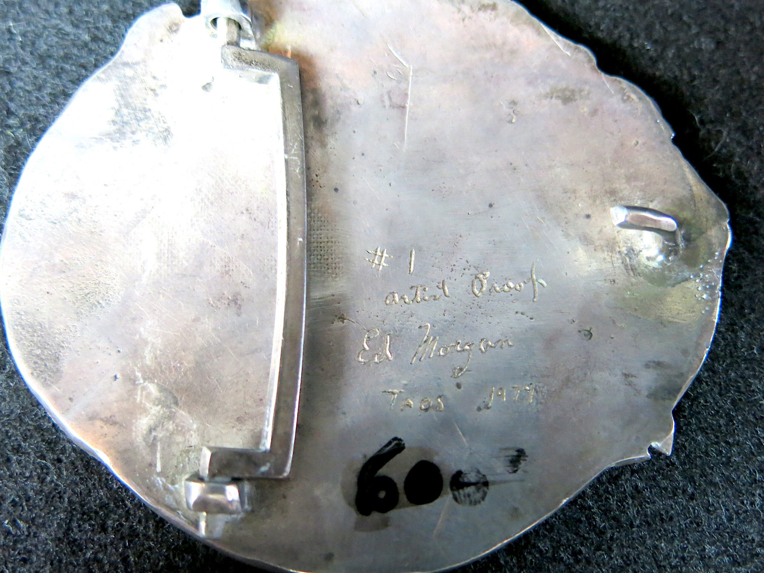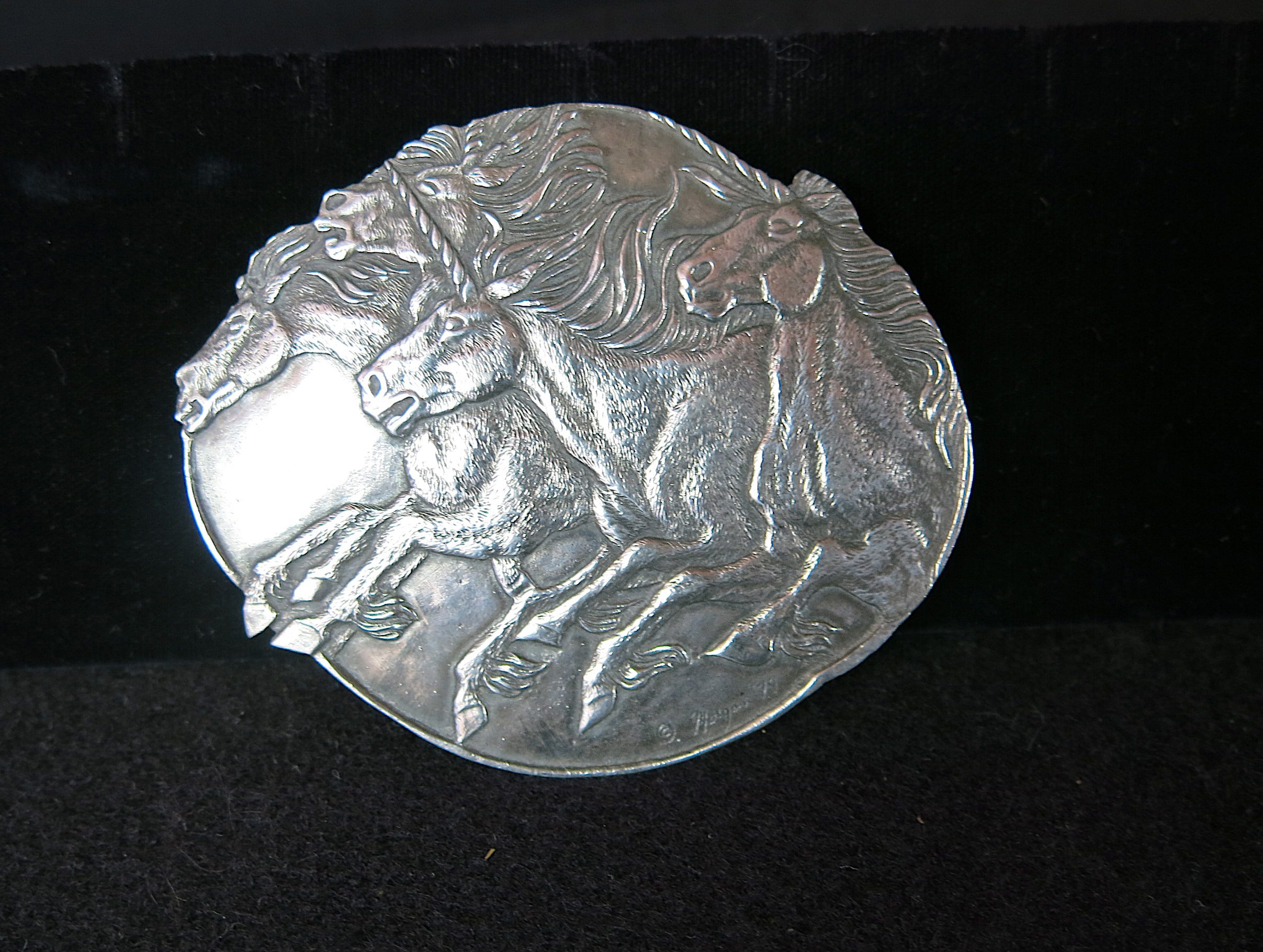 Signed “© Morgan 79” lower center front and etched “#1 Artist Proof Ed Morgan Taos 1979”. This piece depicts four mystical unicorns in a dynamic, overlapping gallop. It is characterized by Morgan’s signature ethereal, windswept manes and fine textural details.  Please see pictures for condition details as the photos are considered part of the description.
