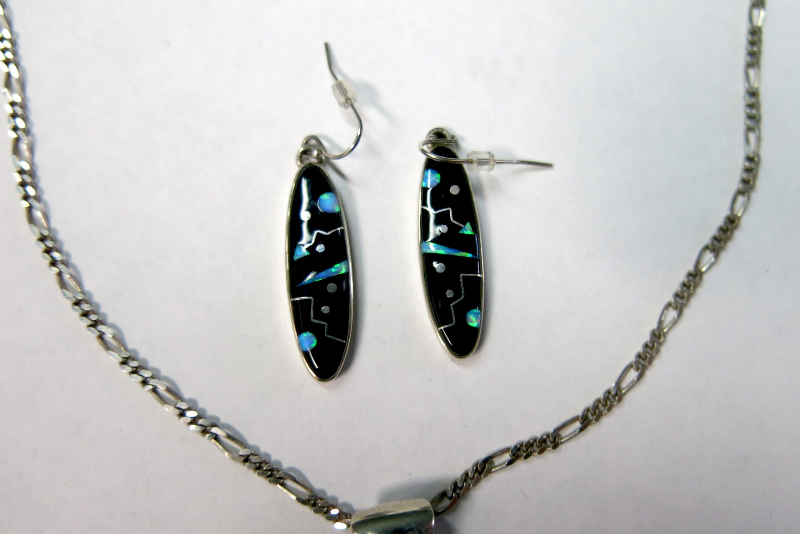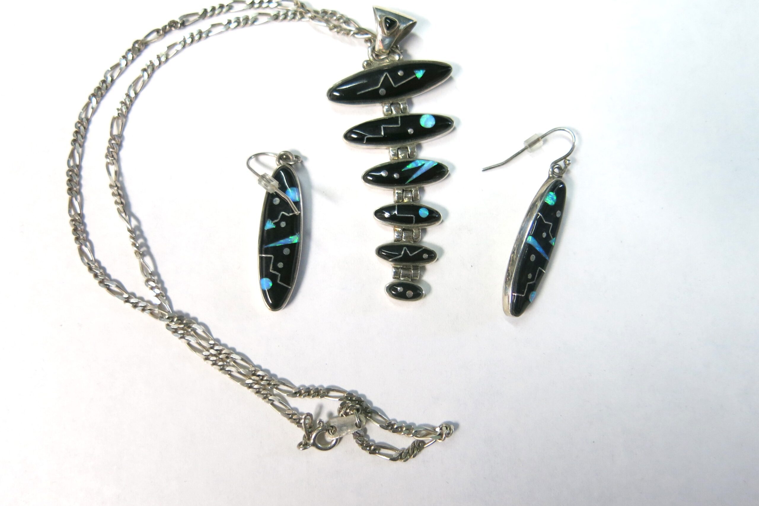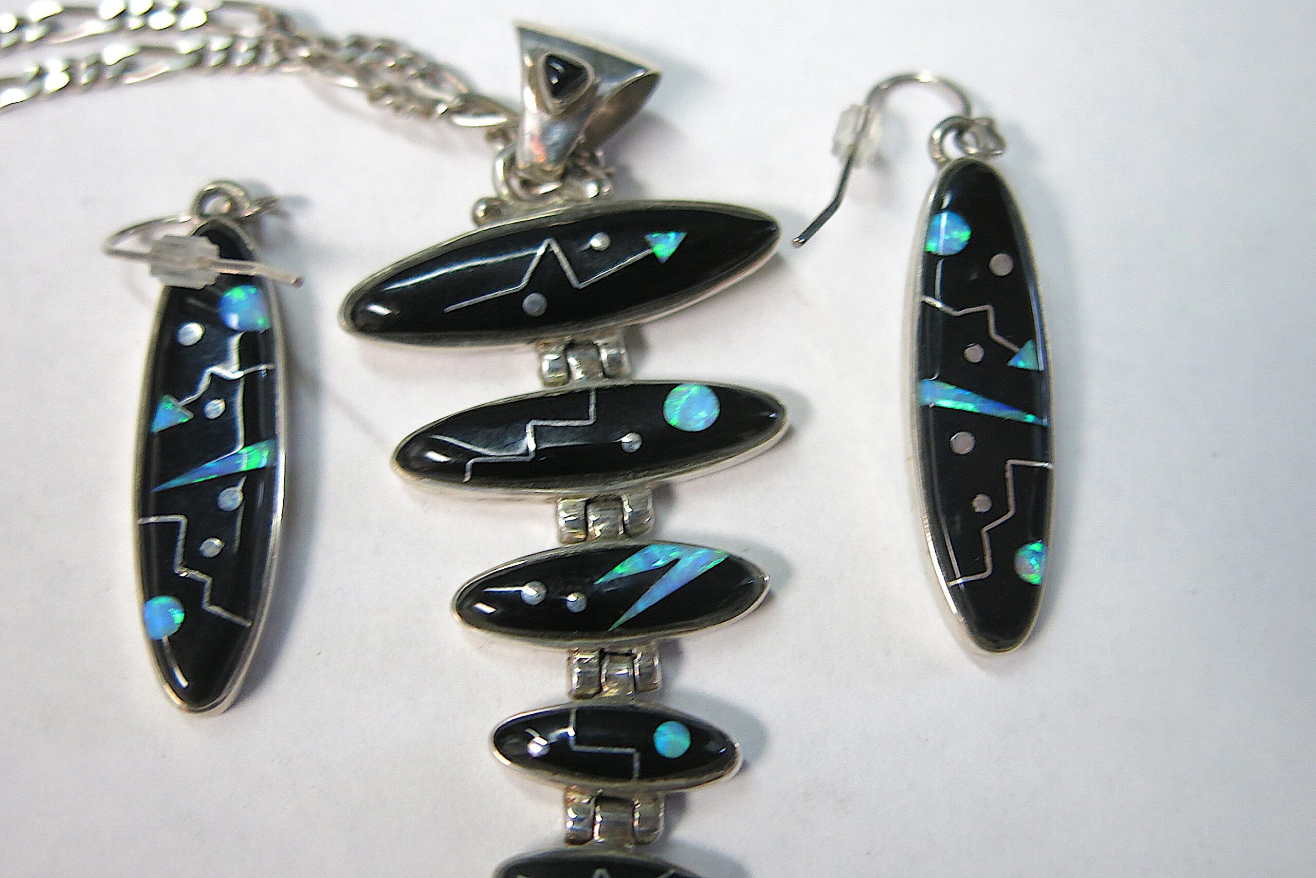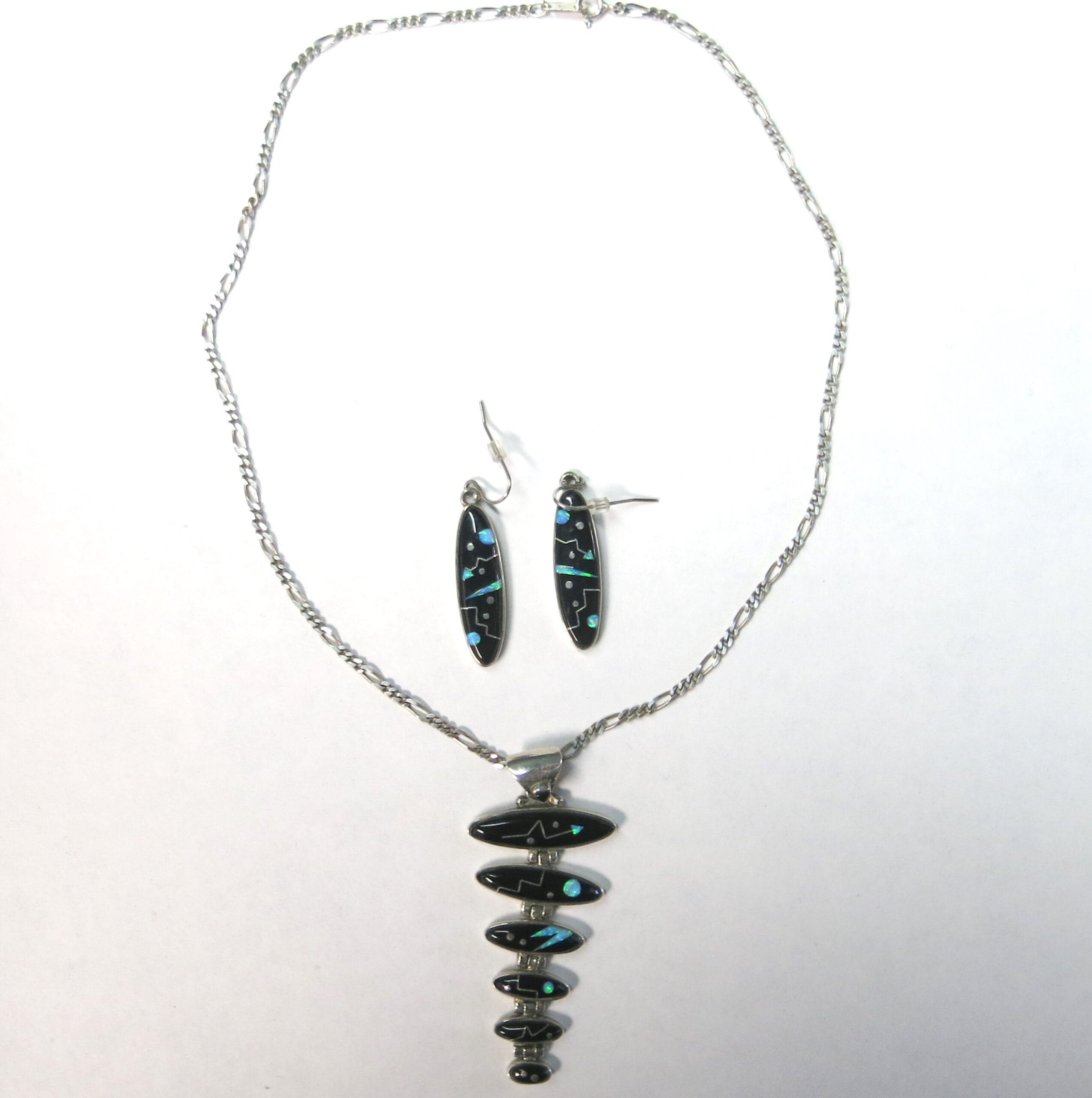 Sterling silver with Acoma jet and opalite mosaic inlay. Ferris jewelry specializes in this technique of precision-cut stones that takes a highly skilled hand, which makes every piece one of a kind. Necklace chain is 16″, pendant length 2.5″, earring length 1.5″
