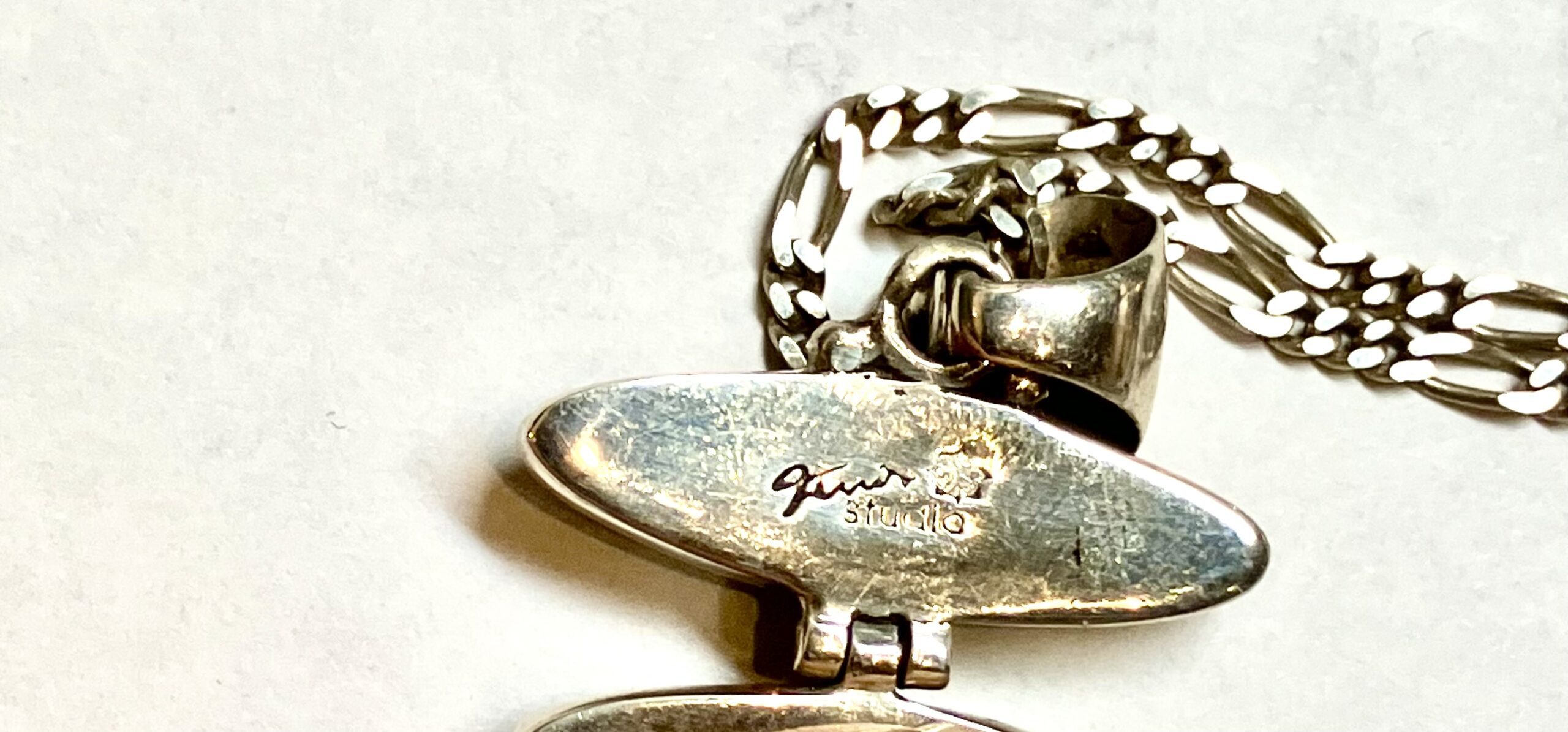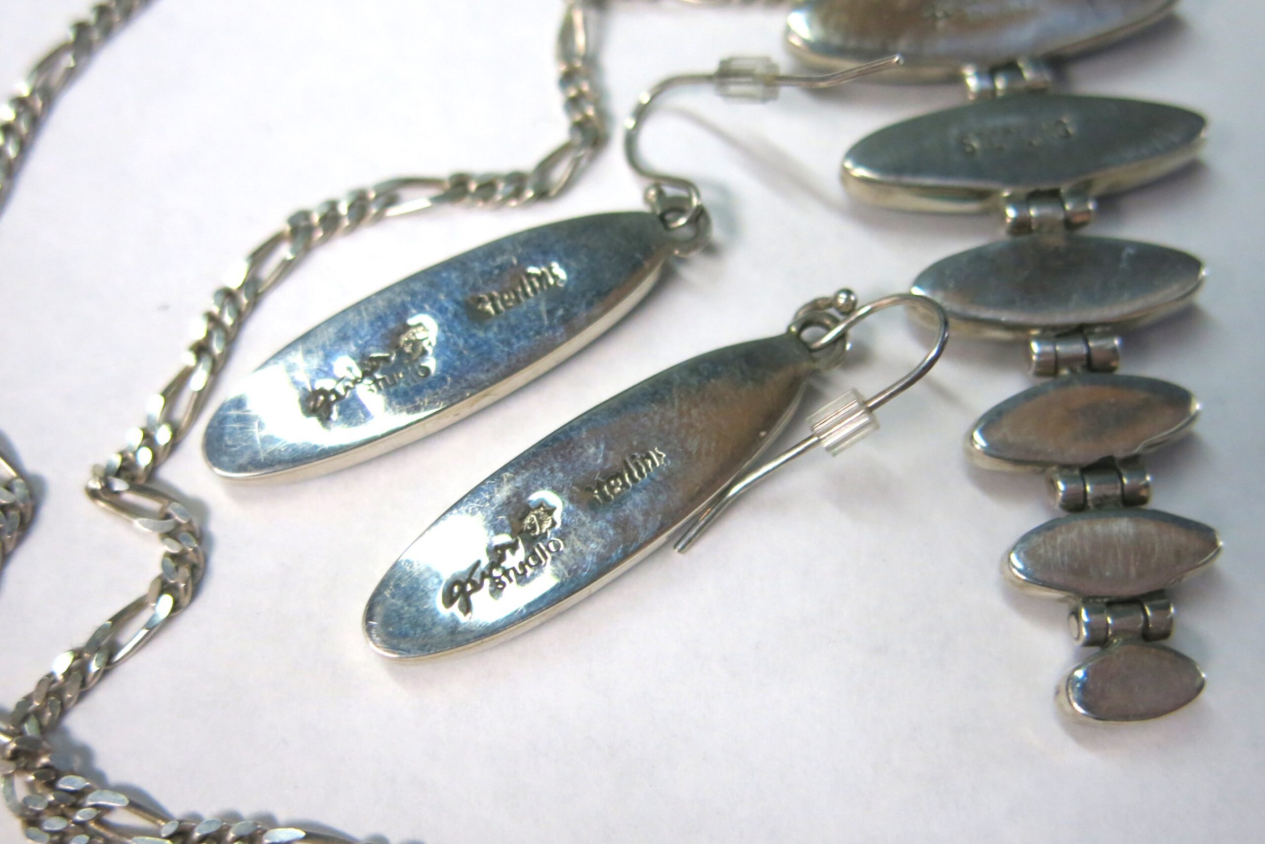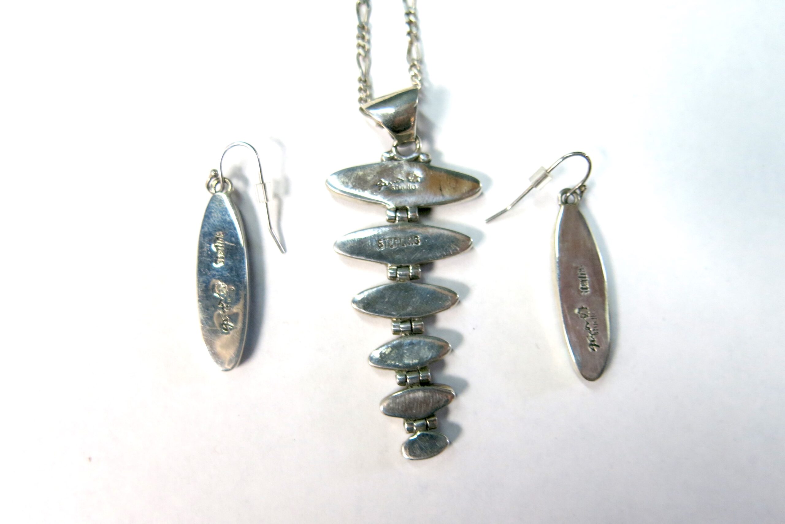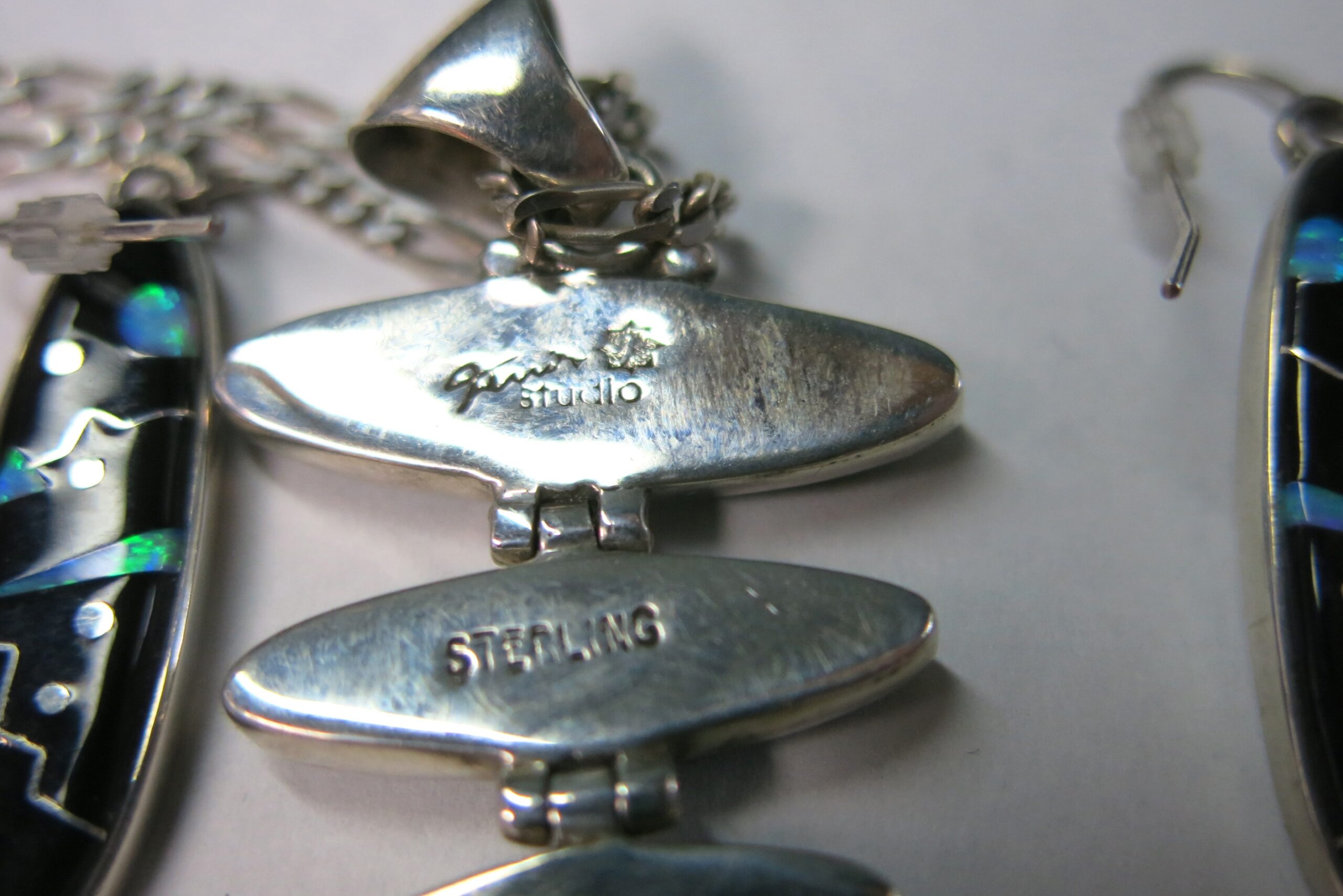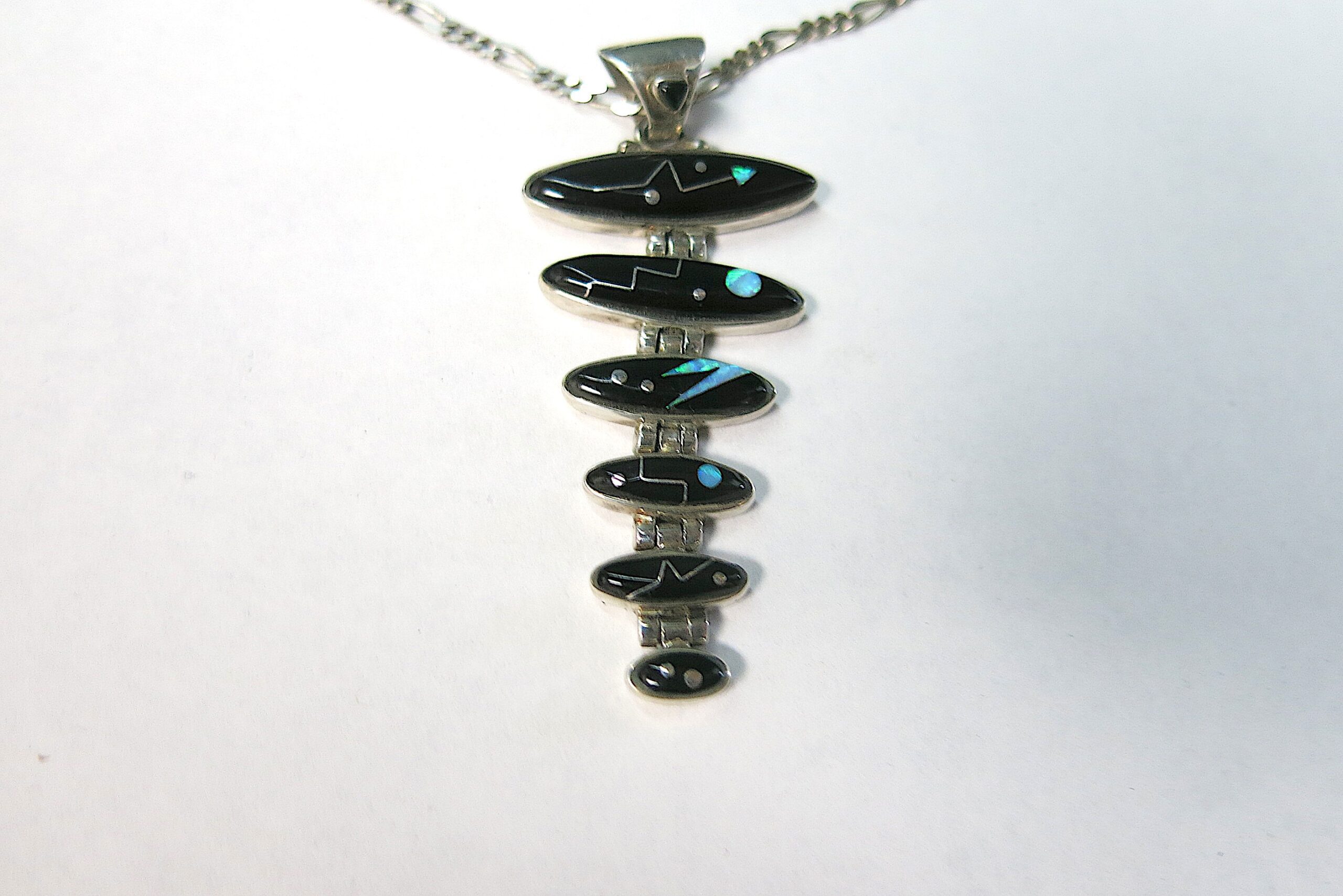 Sterling silver with Acoma jet and opalite mosaic inlay. Ferris jewelry specializes in this technique of precision-cut stones that takes a highly skilled hand, which makes every piece one of a kind. Necklace chain is 16″, pendant length 2.5″, earring length 1.5″
