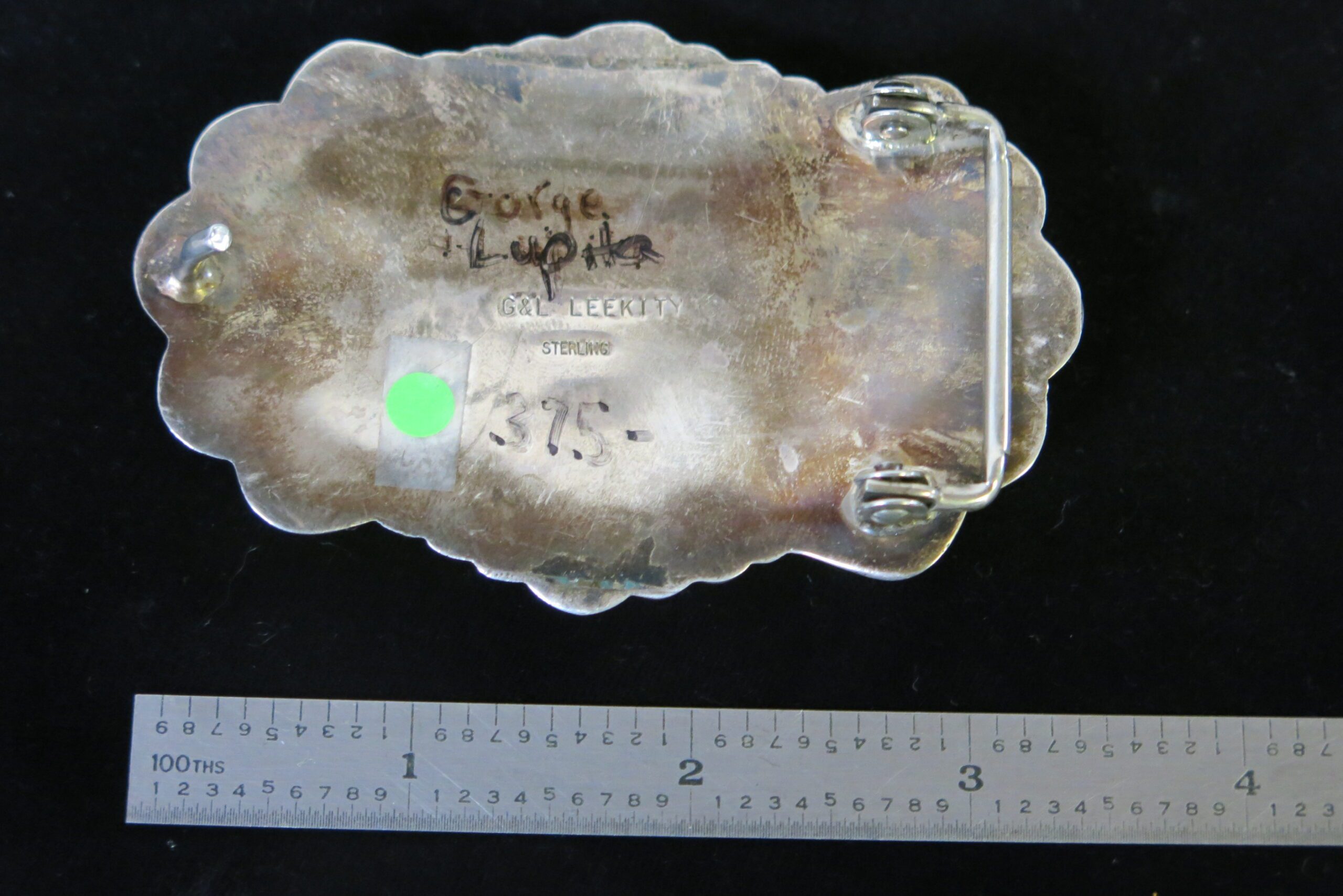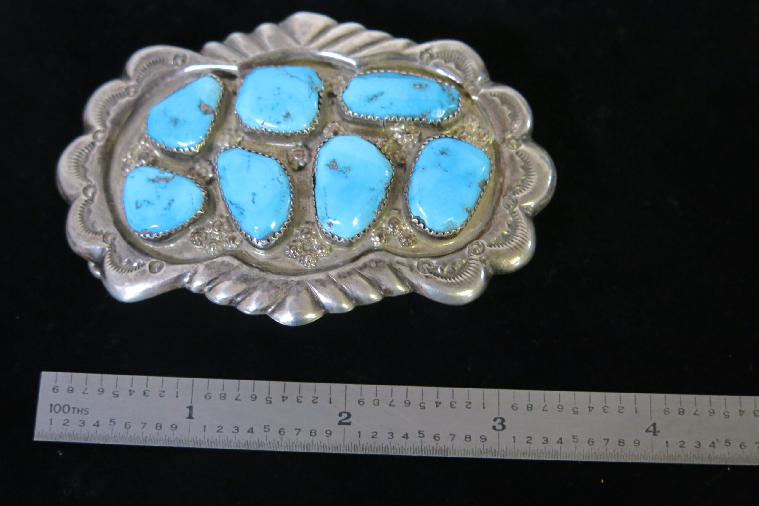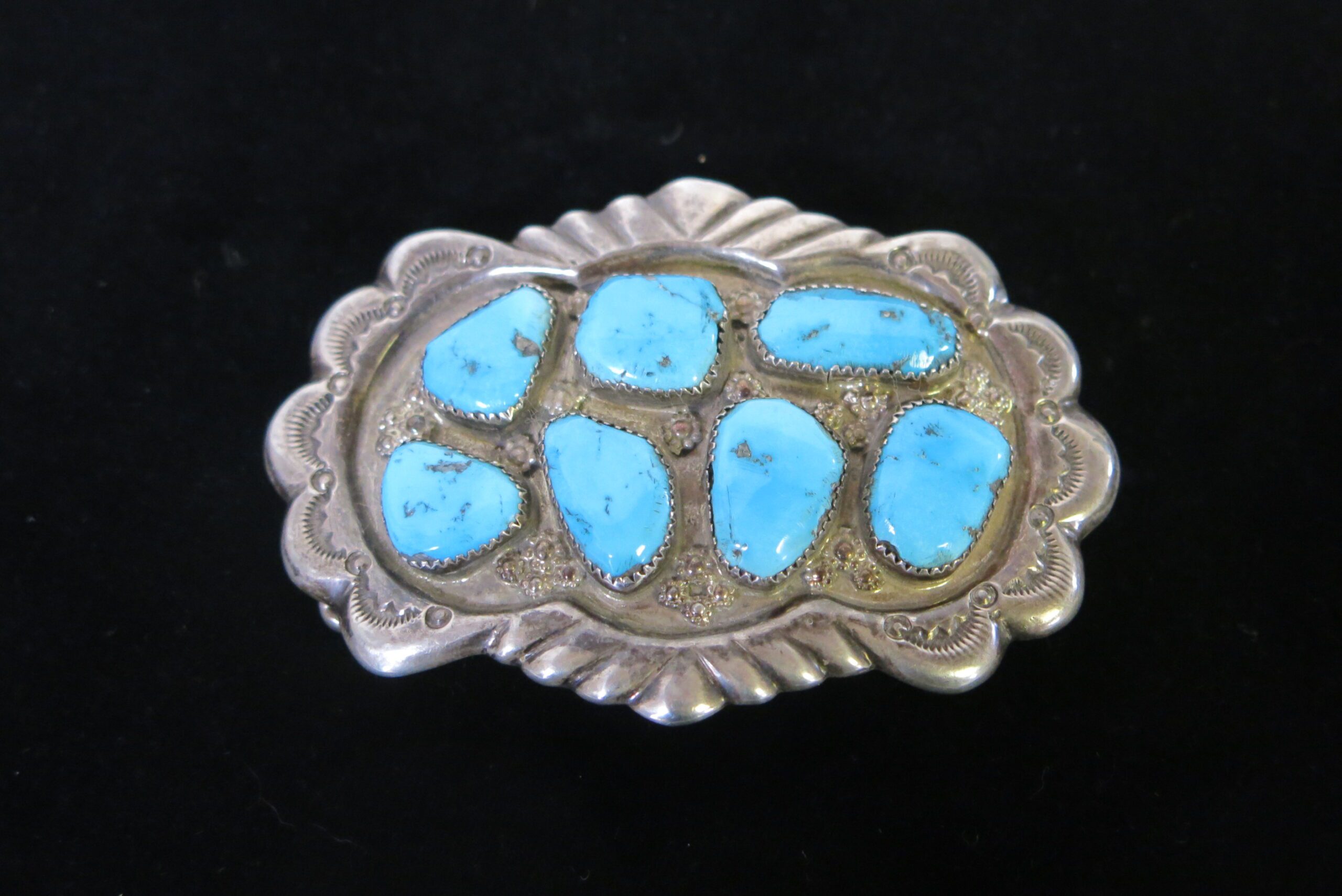 Signed G&L Leekity Sterling on reverse. The piece features seven prominent, bezel-set turquoise stones, likely from the Kingman Mine. The style of this belt buckle, specifically the use of large, individually set stones with decorative stamped silverwork around the bezels and along the scalloped edge of the buckle plate, is typical of traditional Navajo silversmithing. 2.25″ x 3″ x .25″
