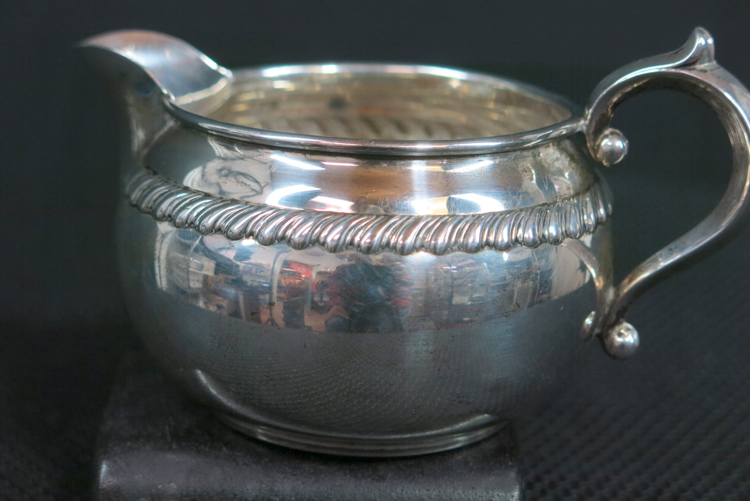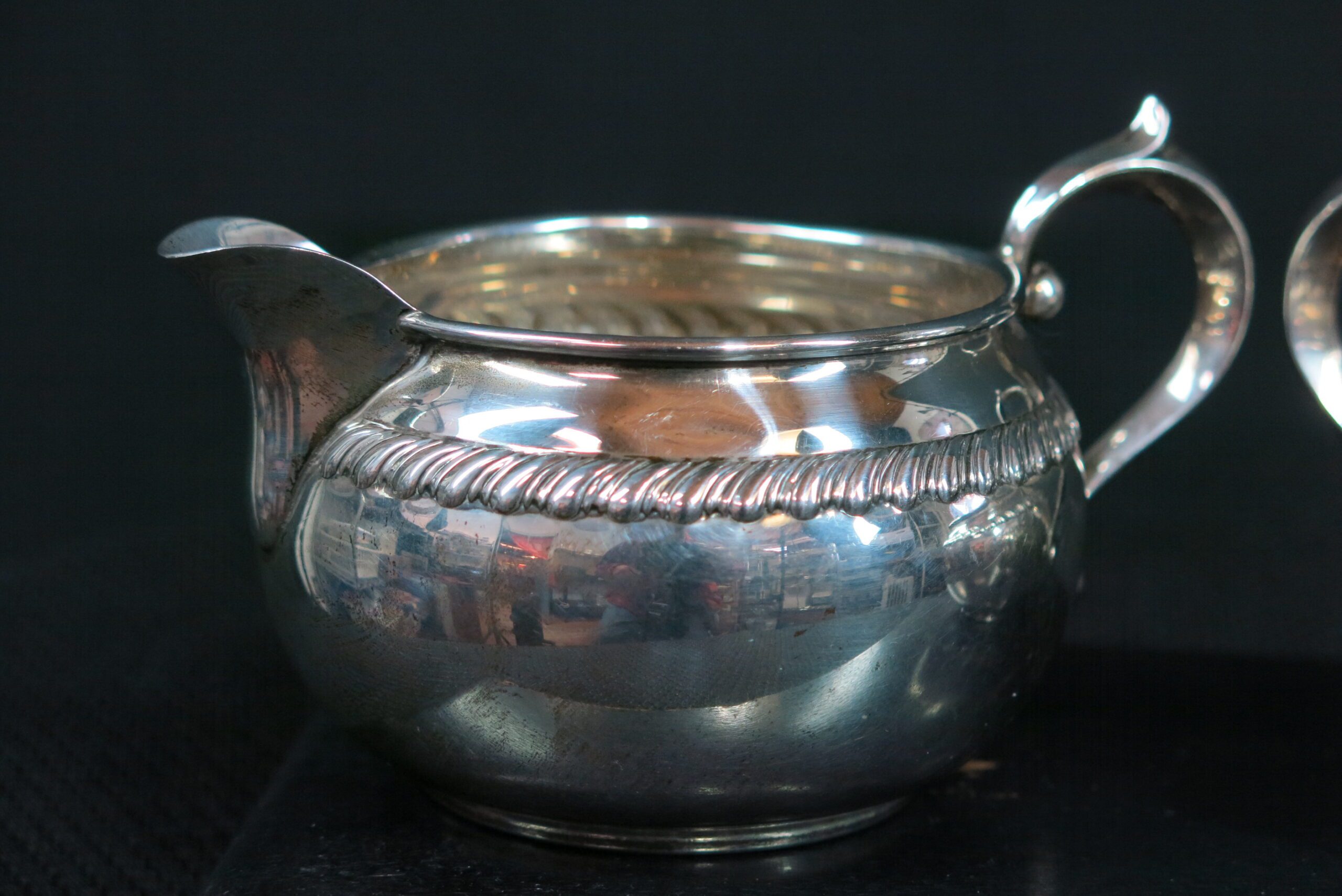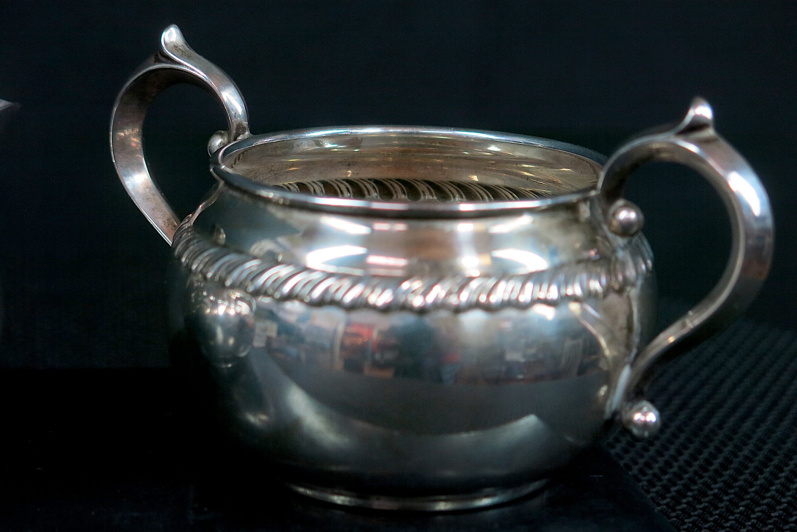 Simple and elegant rope decoration accents the bowl of each vessel and each with lovely curled, foliate handles. Stamped Gorham Serling 912 and 913 respectively. Two dents near handle on creamer. Two dents on sugar. 180g Please see photos for condition details as the pictures are considered part of the description.