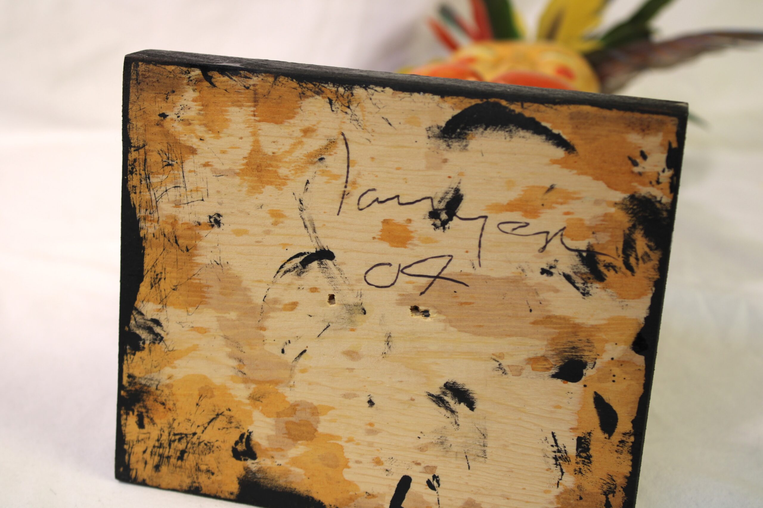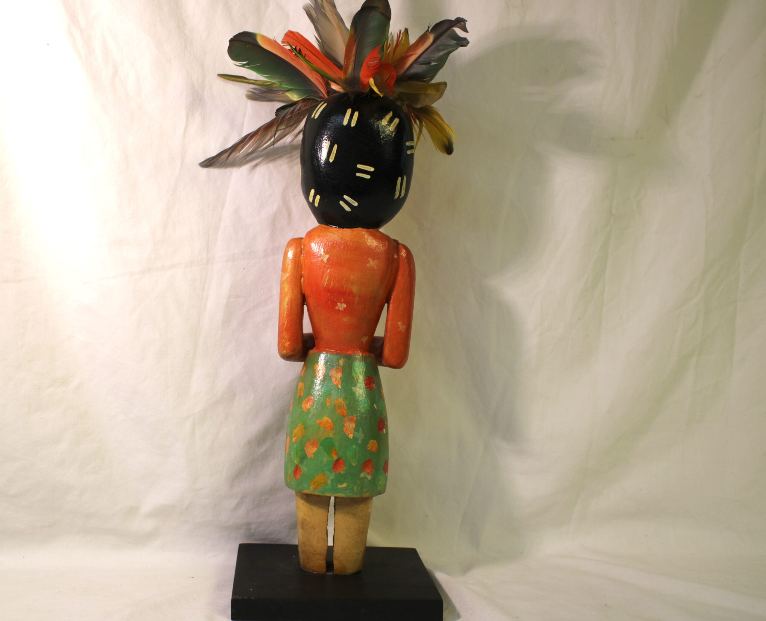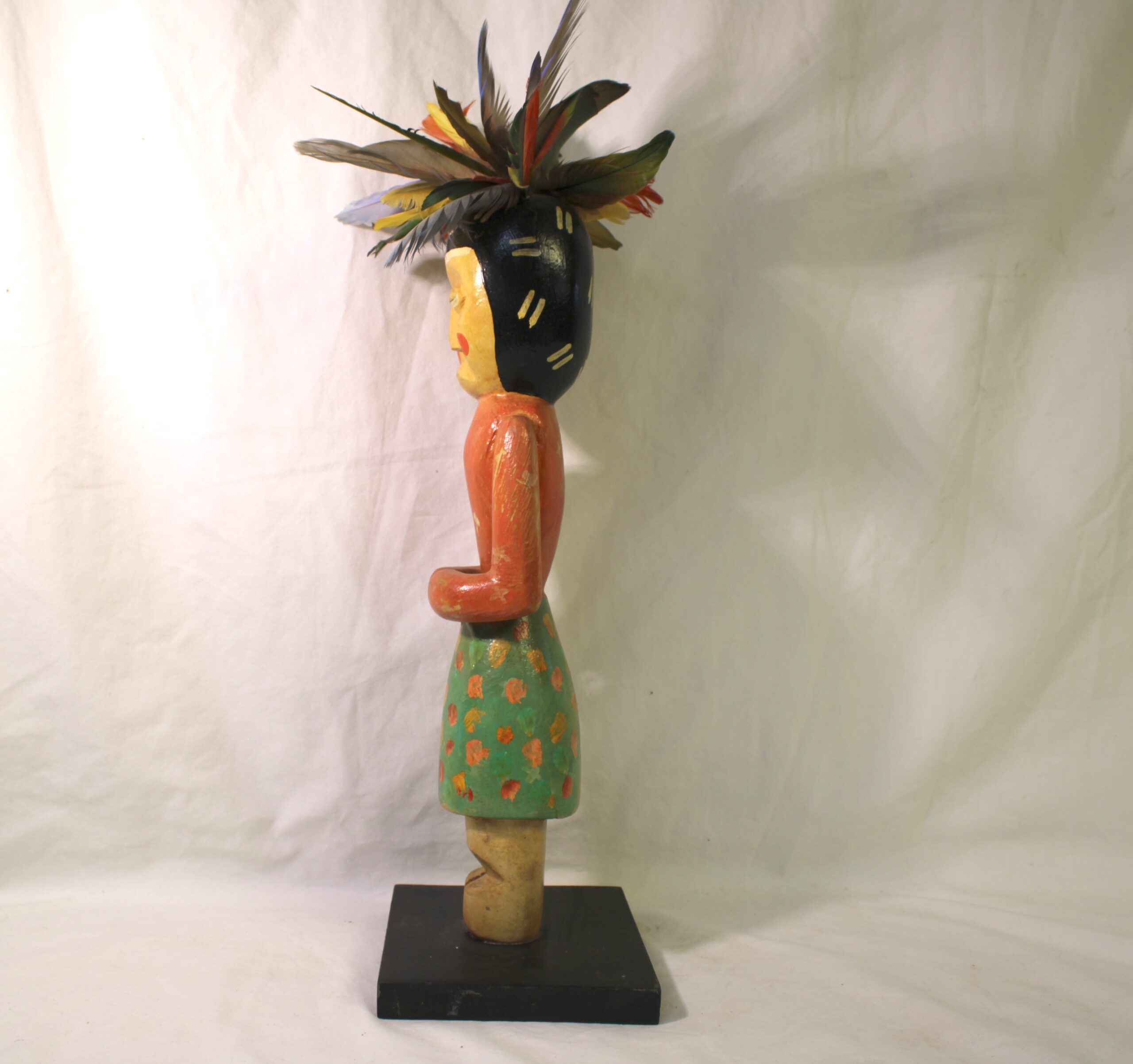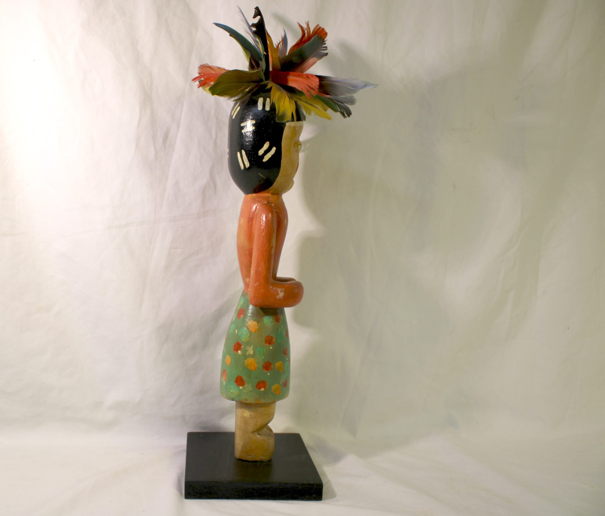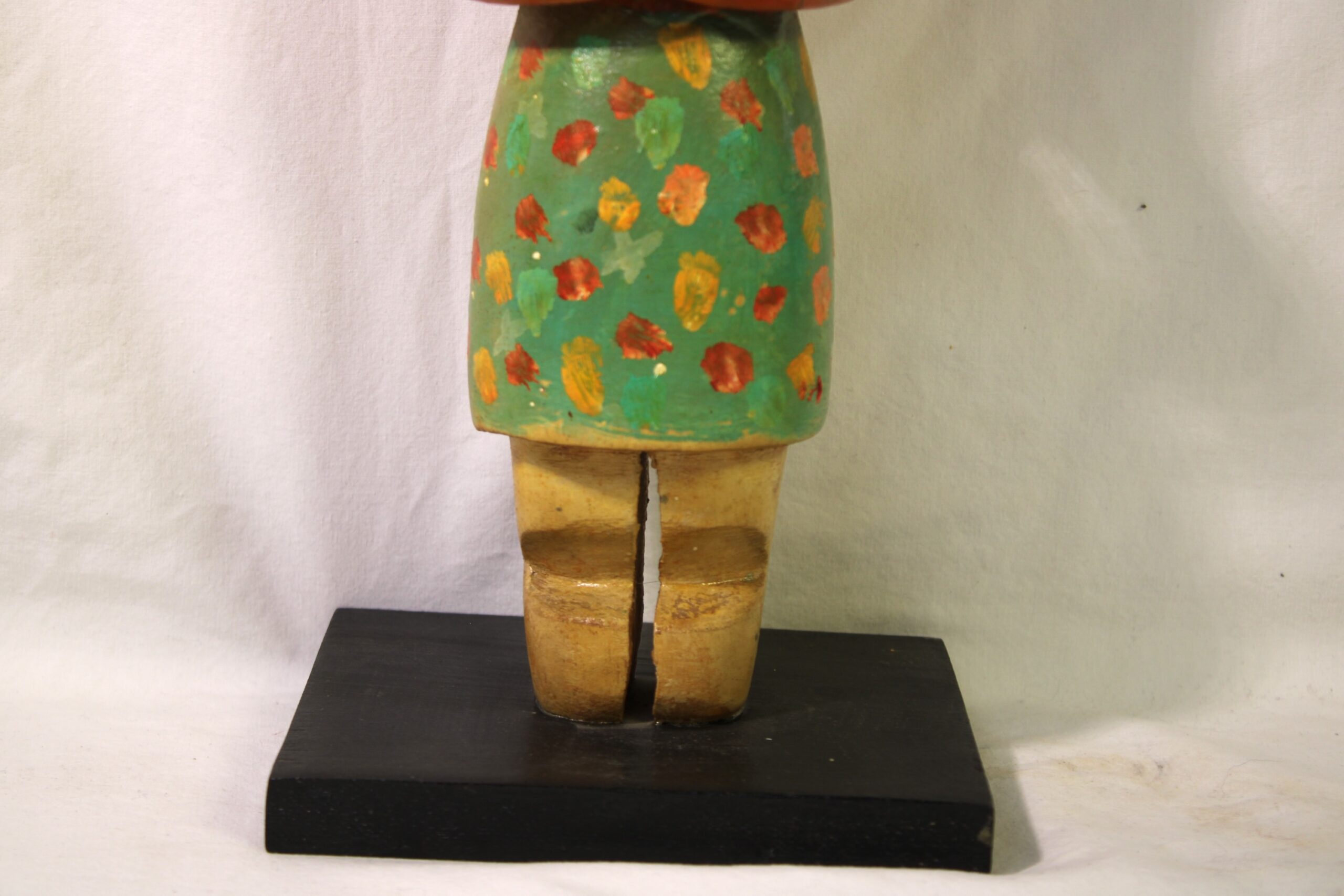 Signed and dated on bottom. The figure is hand-painted with a simple face, an orange torso, and a green skirt with colorful motifs. It stands on a black base for display. It is carved from the root of a cottonwood tree, a traditional material for authentic Katsina figures. The style is a vintage or “old-style” carving, which typically features a more rigid, block-like form compared to modern, highly detailed action carvings. Gregory Lomayesva (born 1971) is an American painter, sculptor, and mixed-media artist who lives and works in Santa Fe, New Mexico. He draws imagery and ideas from his Hopi and Hispanic heritage and American popular culture. 20″x6.5″x5.5″