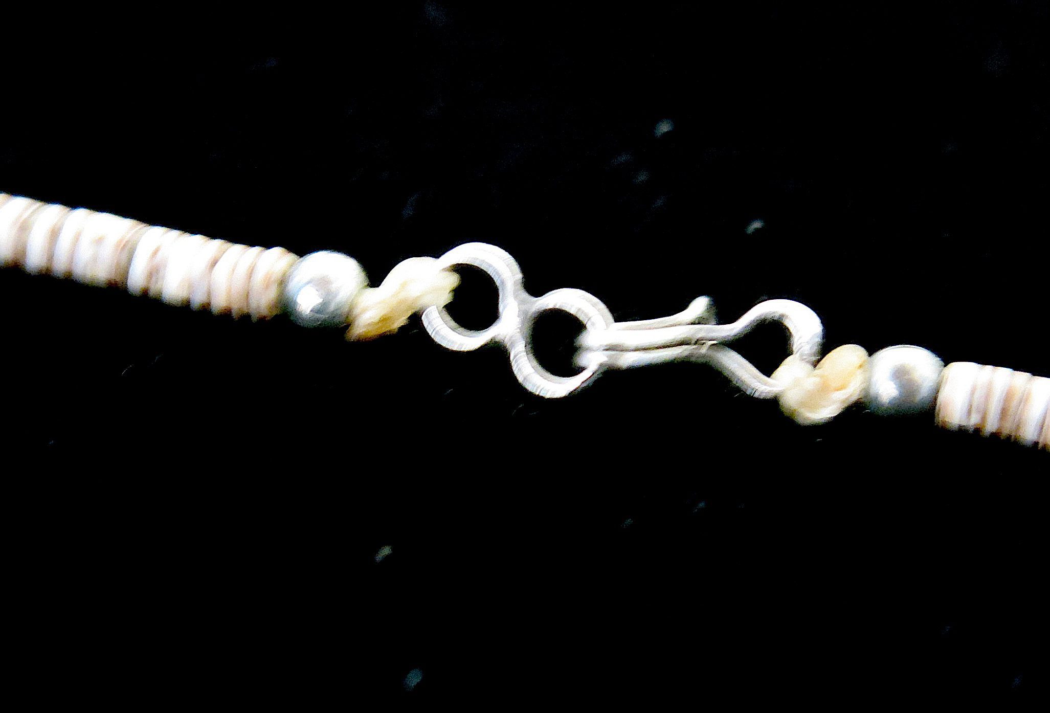Gracefully designed necklace with graduated turquoise heishi beads on either side and a hook closure. 26″