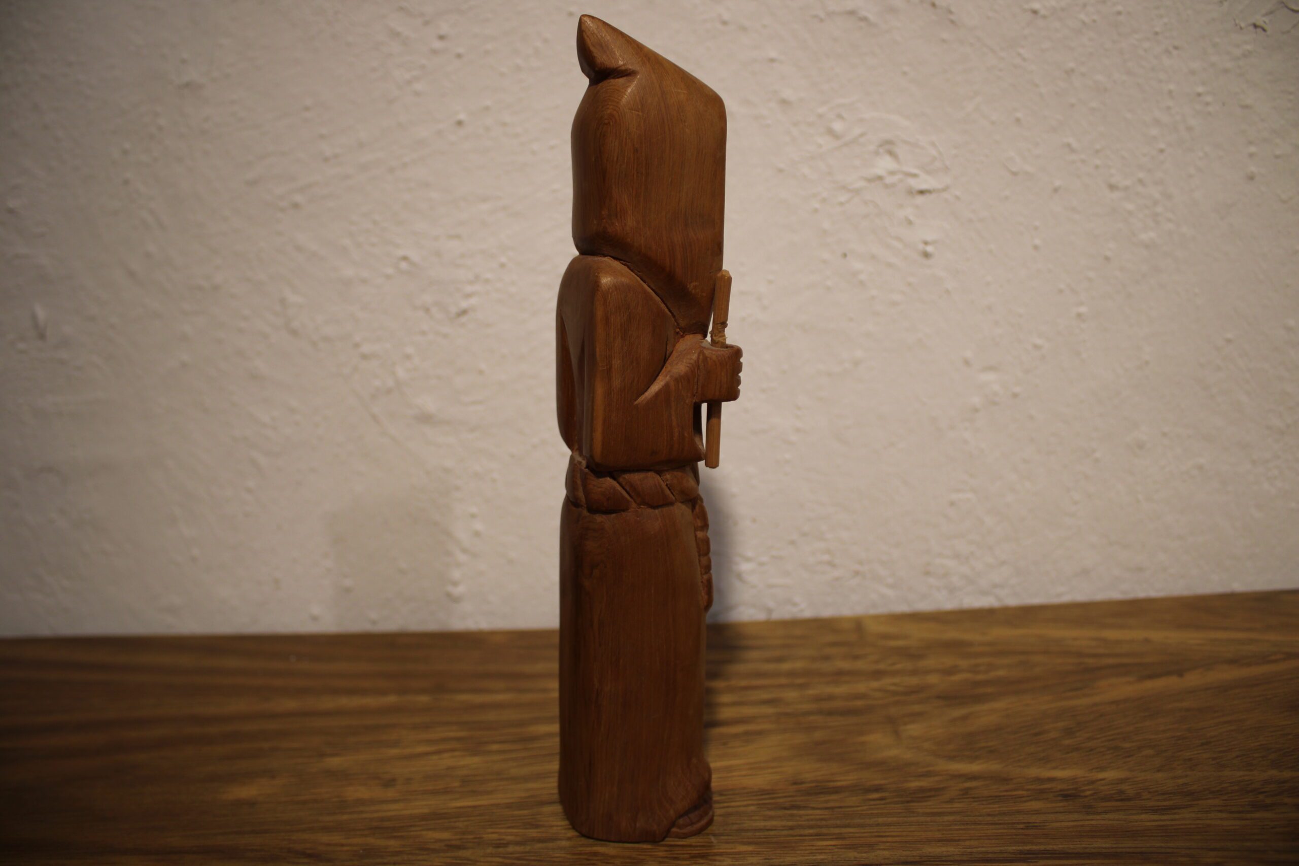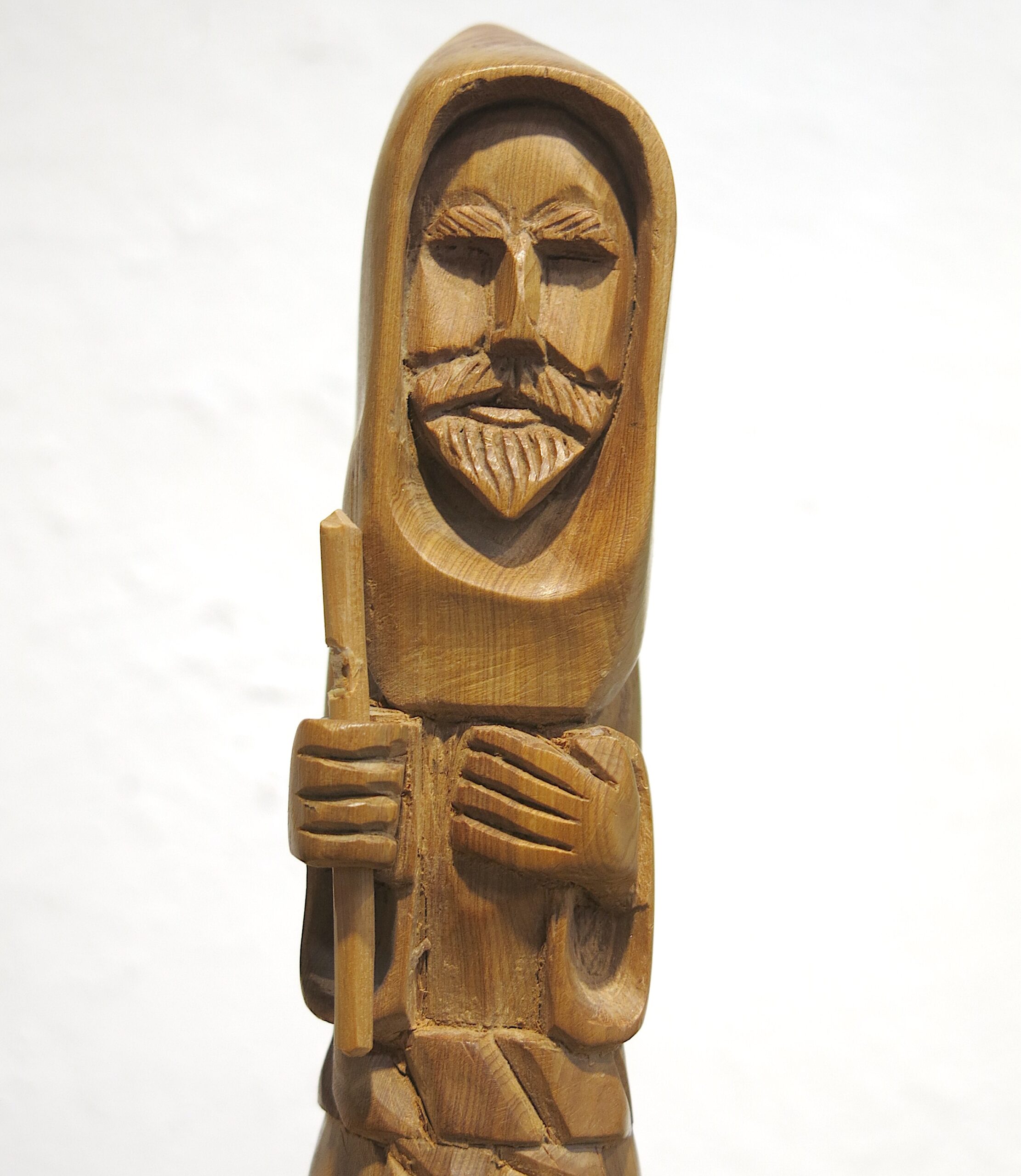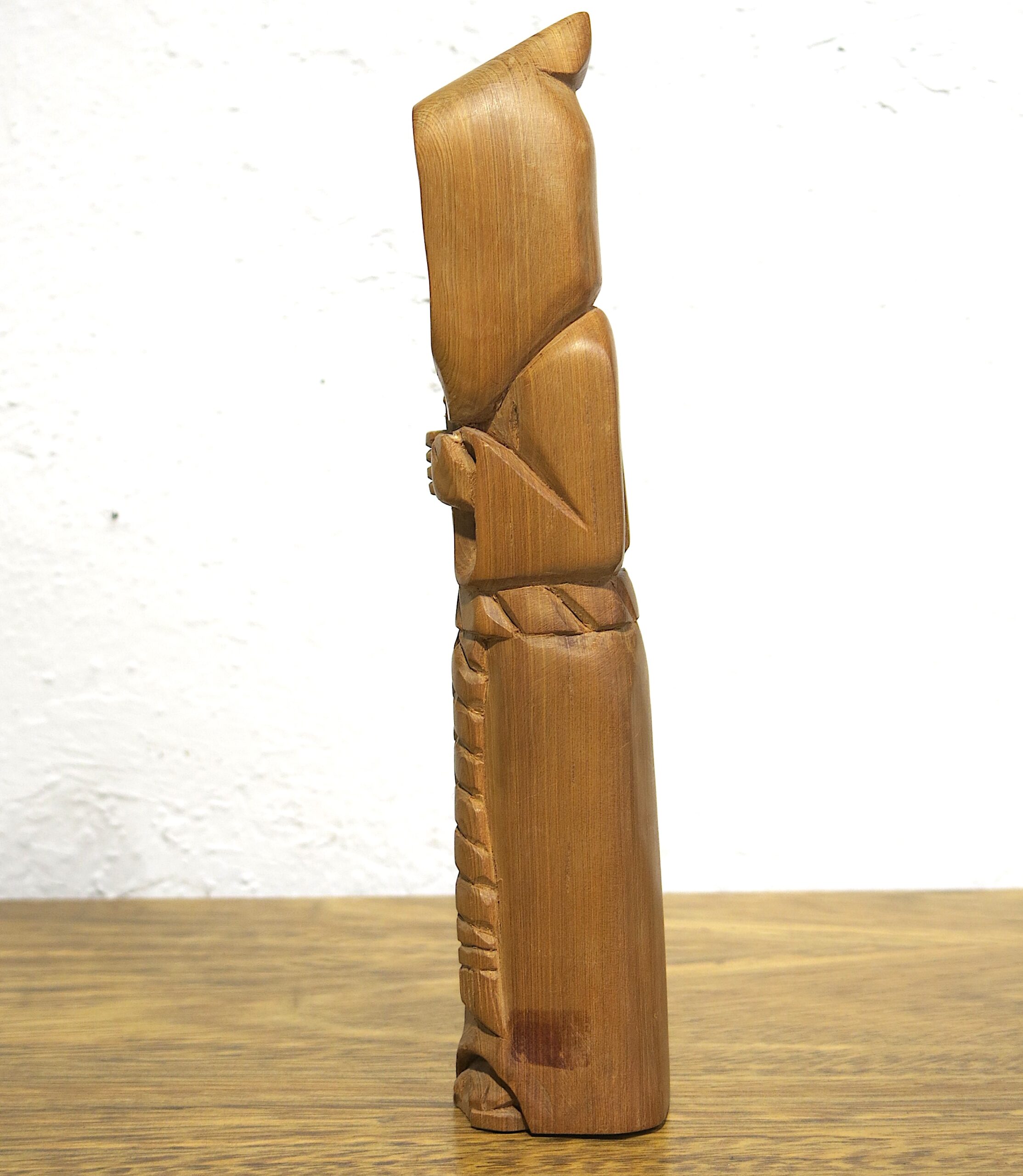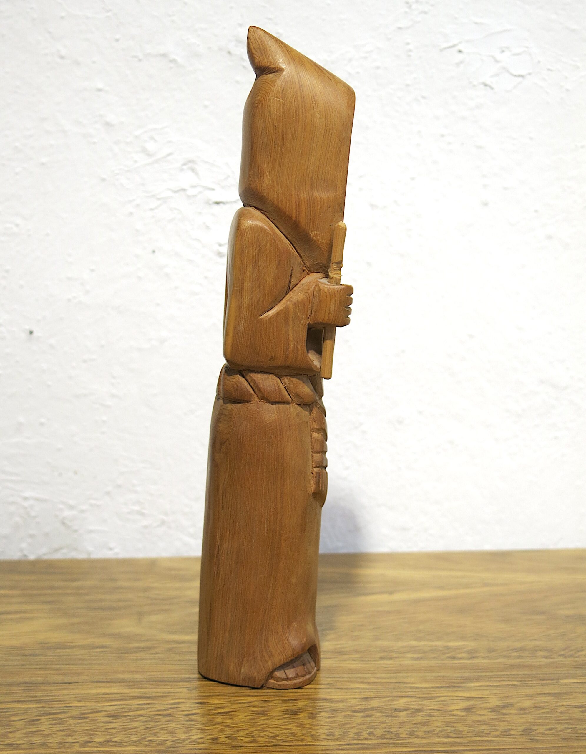 Based in Taos, Garcia is part of the long-standing tradition of New Mexican “santeros” (carvers of saintly figures). His style is characterized by smooth, flowing lines that follow the natural grain of the wood, often cedar or pine. Known as the Patron Saint of Cooks and Kitchens, San Pasqual Baylón is an incredibly popular subject for bultos in the Southwest. He is typically shown in a humble Franciscan robe, often holding a broom or standing near a stove. In your carving, the stylized verticality emphasizes his monk-like asceticism. 10″x2″x2″ .5 lbs Please see pictures for condition details as the photos are considered a part of the description.