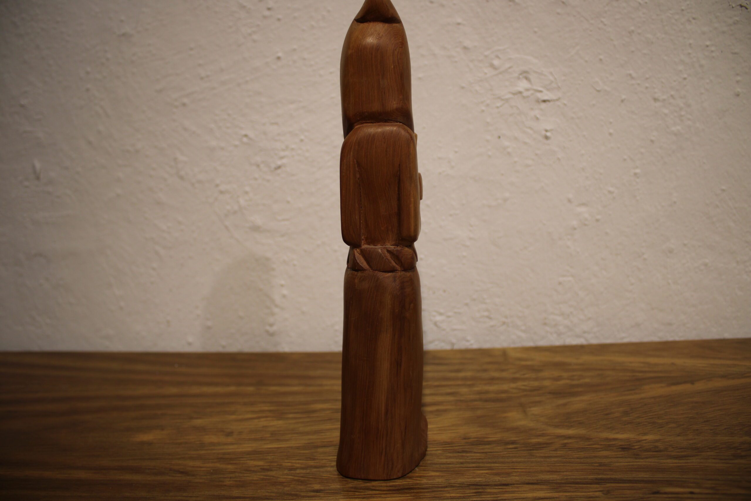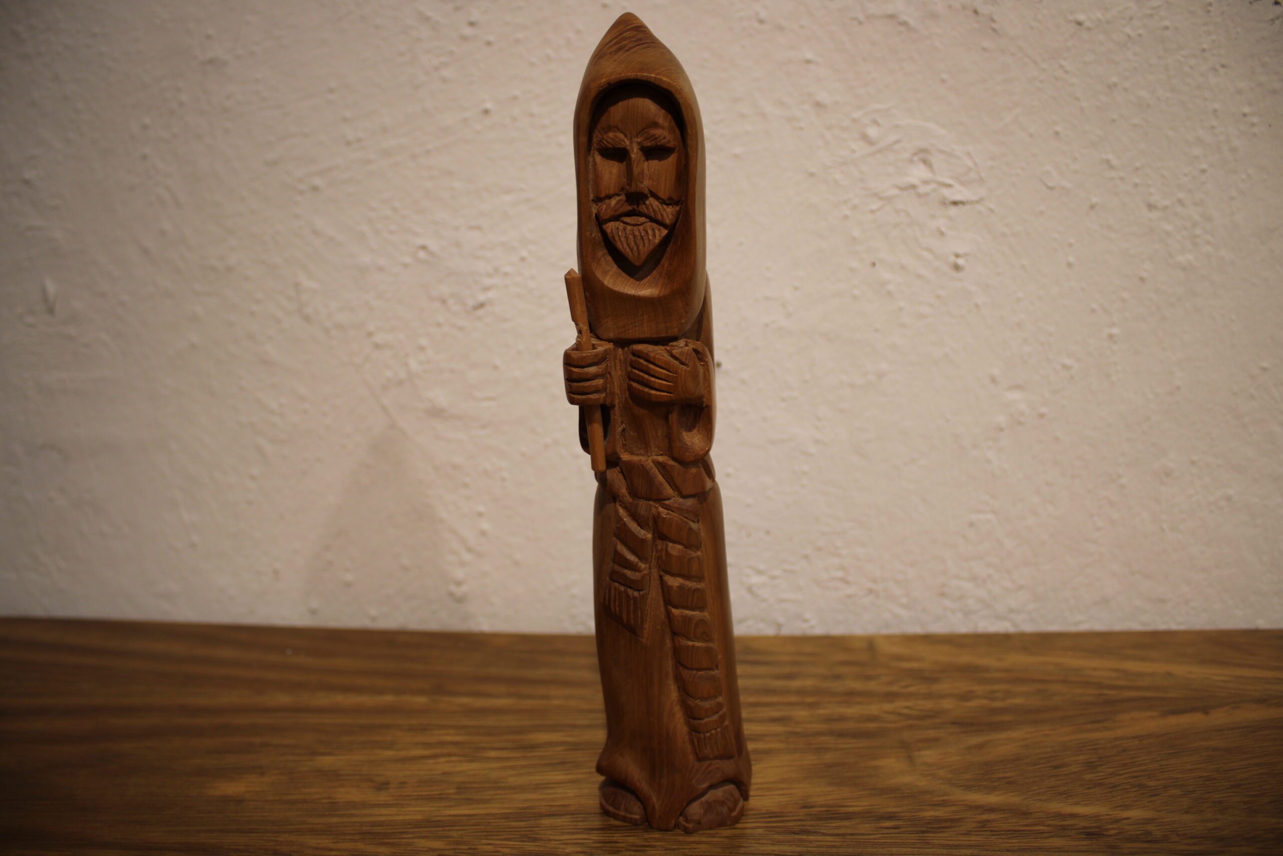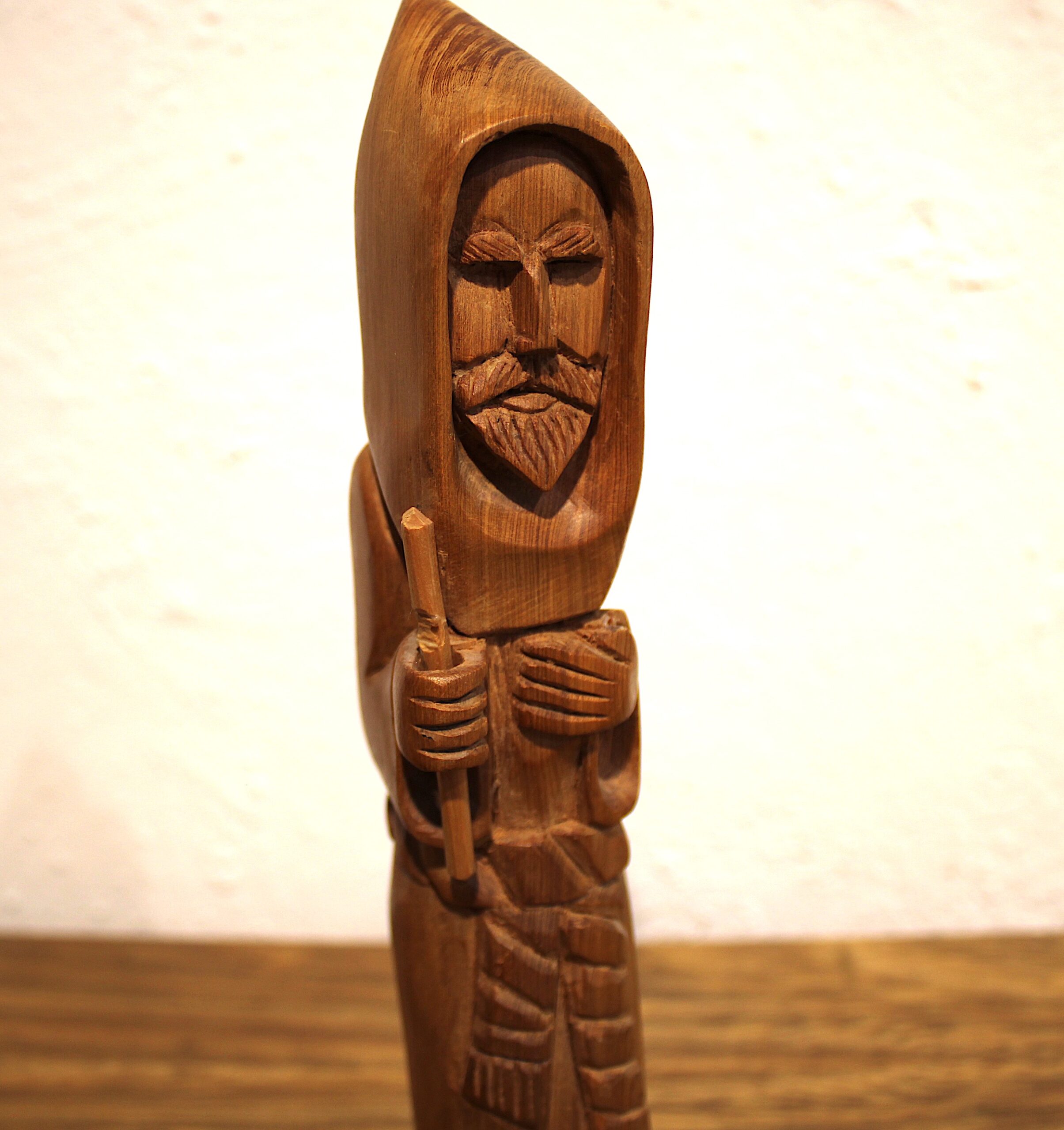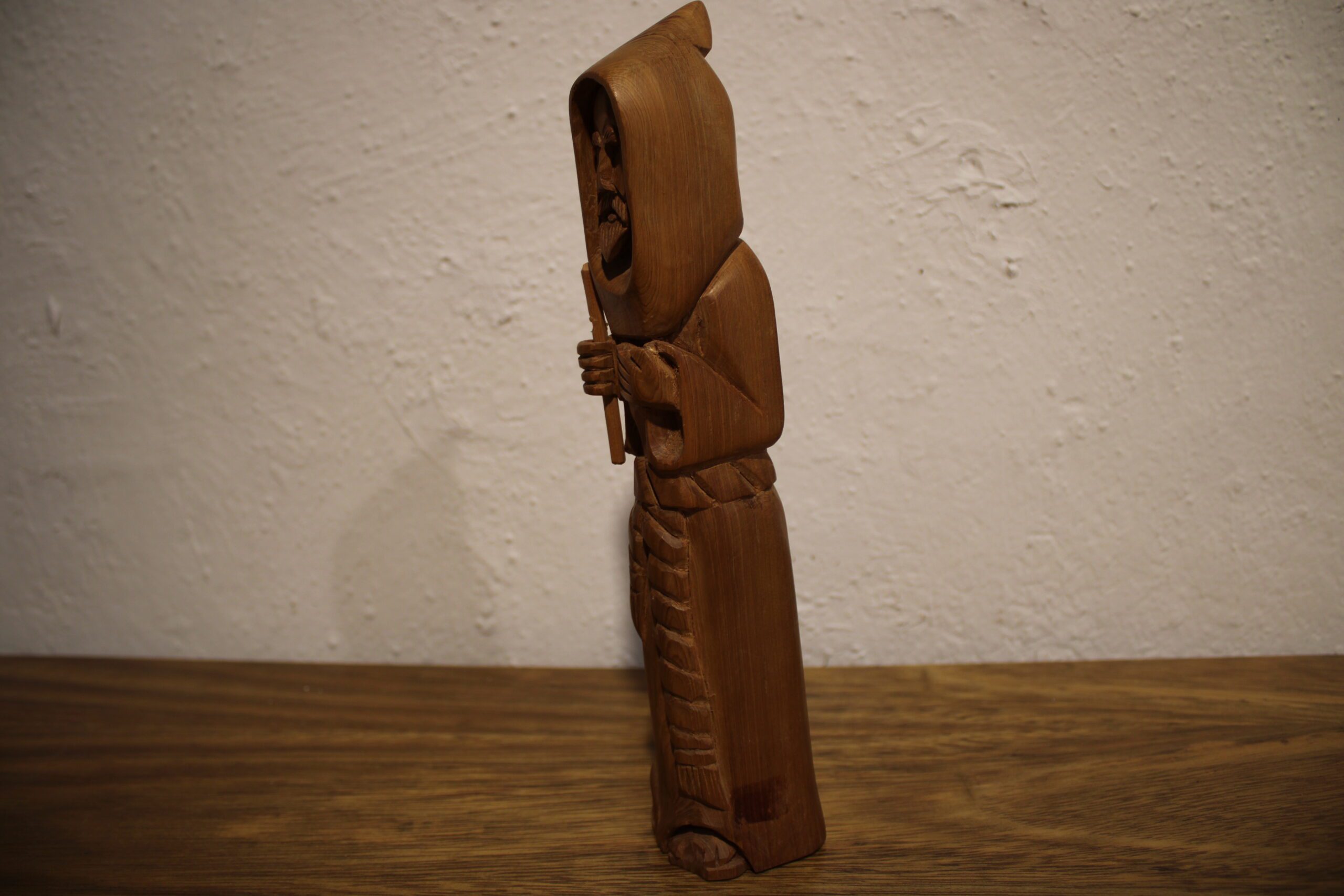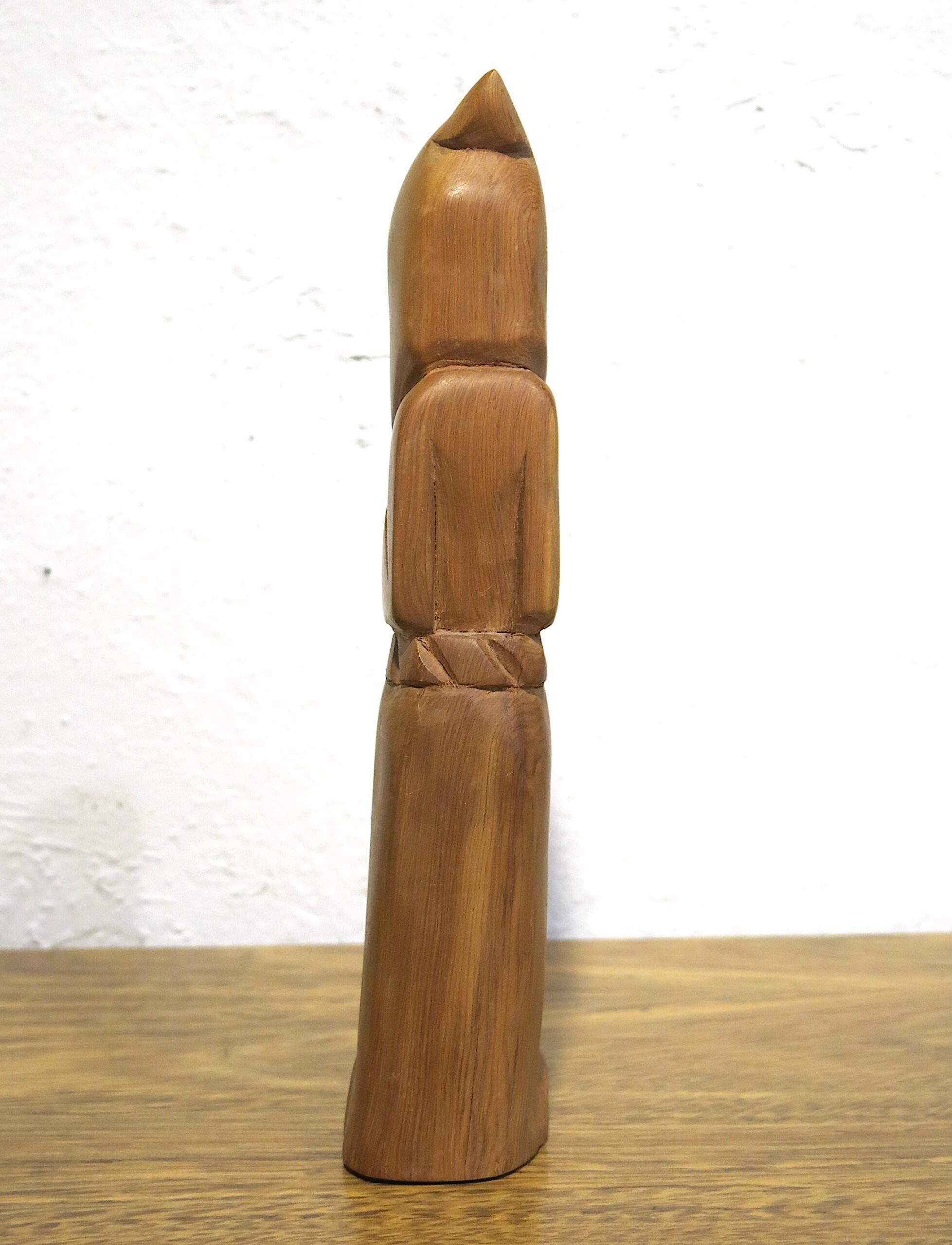 Based in Taos, Garcia is part of the long-standing tradition of New Mexican “santeros” (carvers of saintly figures). His style is characterized by smooth, flowing lines that follow the natural grain of the wood, often cedar or pine. Known as the Patron Saint of Cooks and Kitchens, San Pasqual Baylón is an incredibly popular subject for bultos in the Southwest. He is typically shown in a humble Franciscan robe, often holding a broom or standing near a stove. In your carving, the stylized verticality emphasizes his monk-like asceticism. 10″x2″x2″ .5 lbs Please see pictures for condition details as the photos are considered a part of the description.