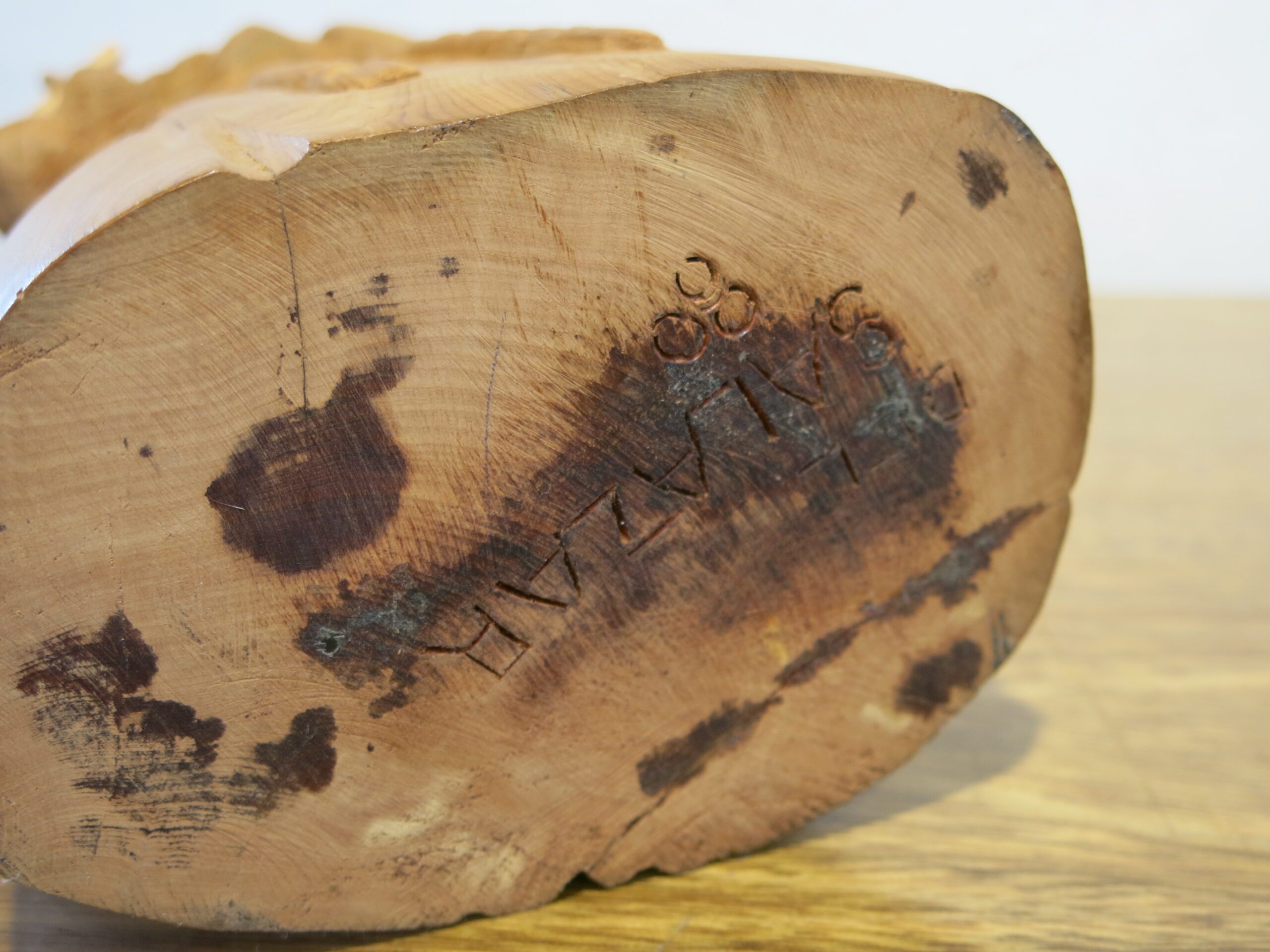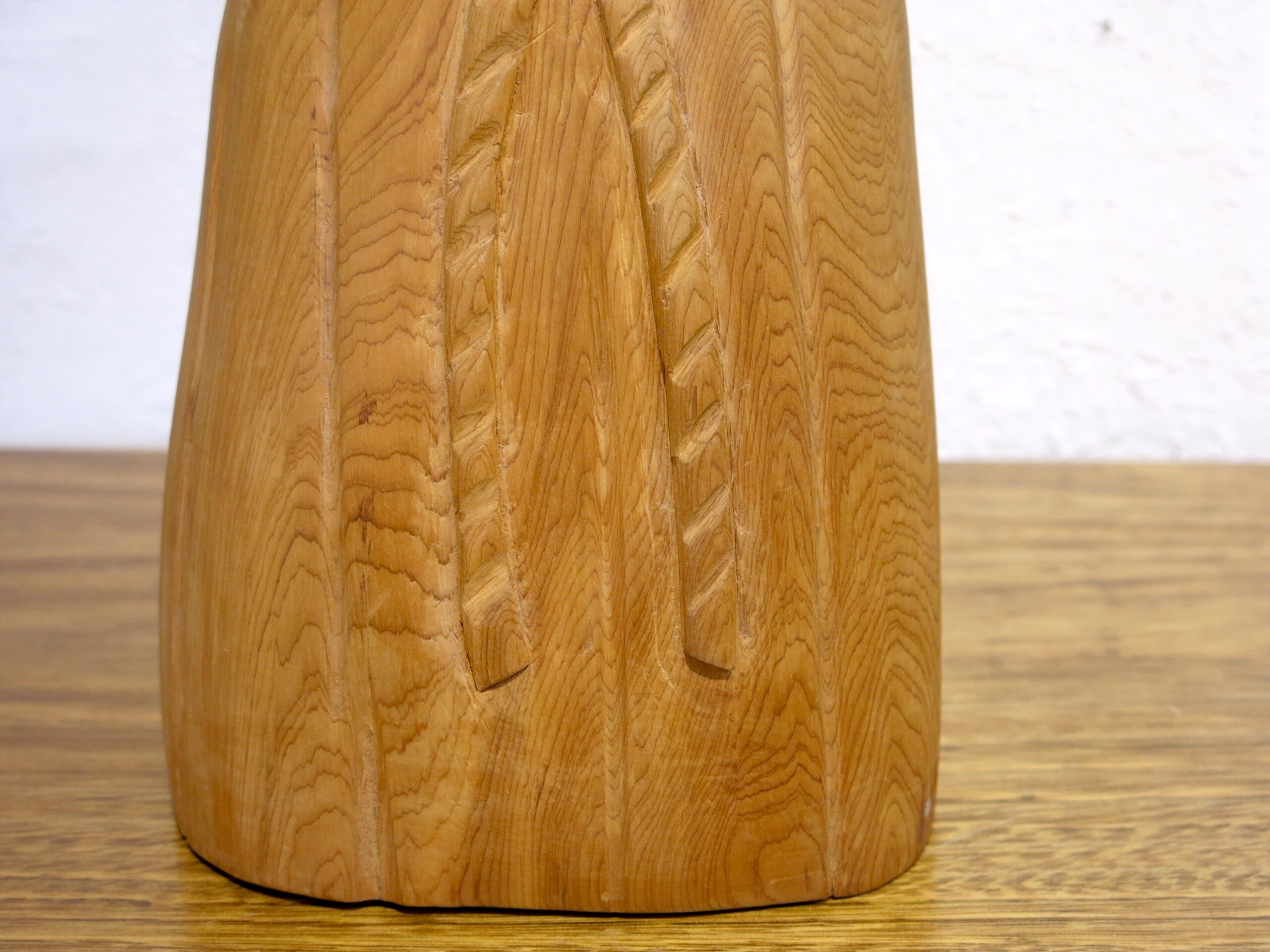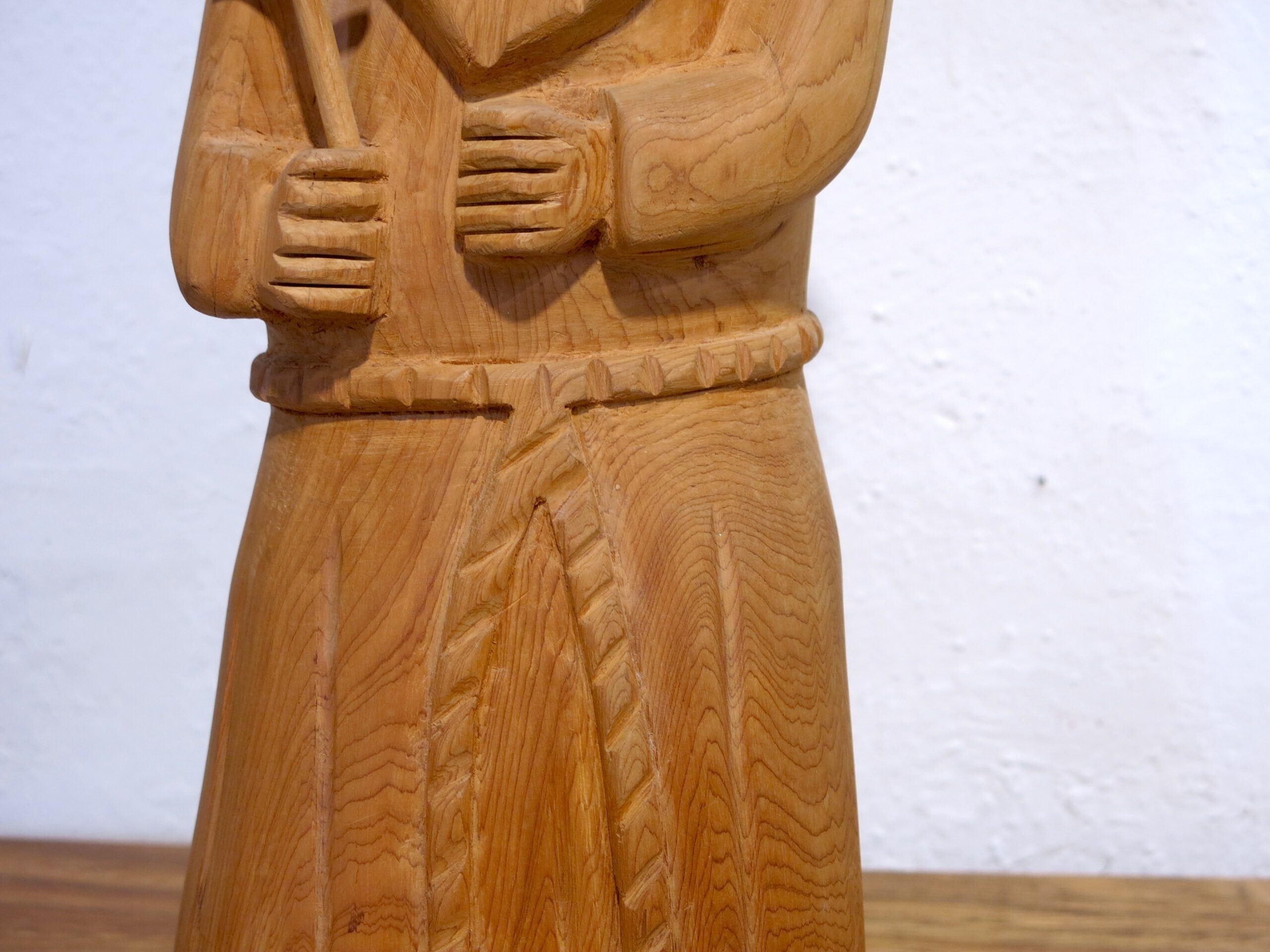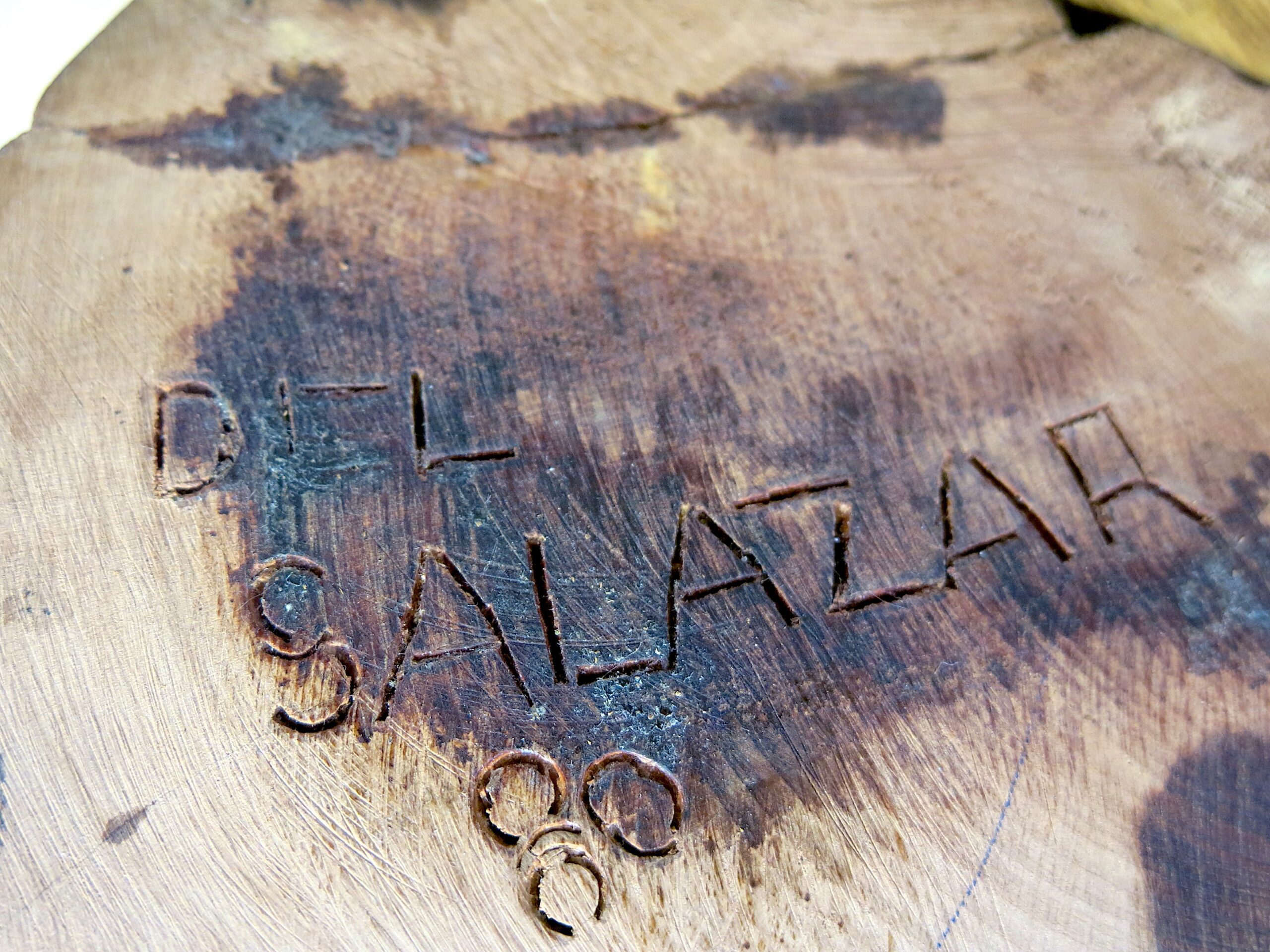 Signed “Del Salazar 80” on bottom. Hand-carved cedar bulto of San Francisco de Asís (St. Francis of Assisi) by Taos, New Mexico folk artist Leo “Del” Salazar. Carved from a single piece of aromatic cedar, natural and unfinished, showcasing the beautiful flowing grain throughout. The figure stands 18″ tall, depicted in Franciscan habit with rope belt, holding a cross, with a small bird carved on his left shoulder — a hallmark attribute of St. Francis. 18″x6″x4″ Please see pictures for condition details are considered a part of the description.