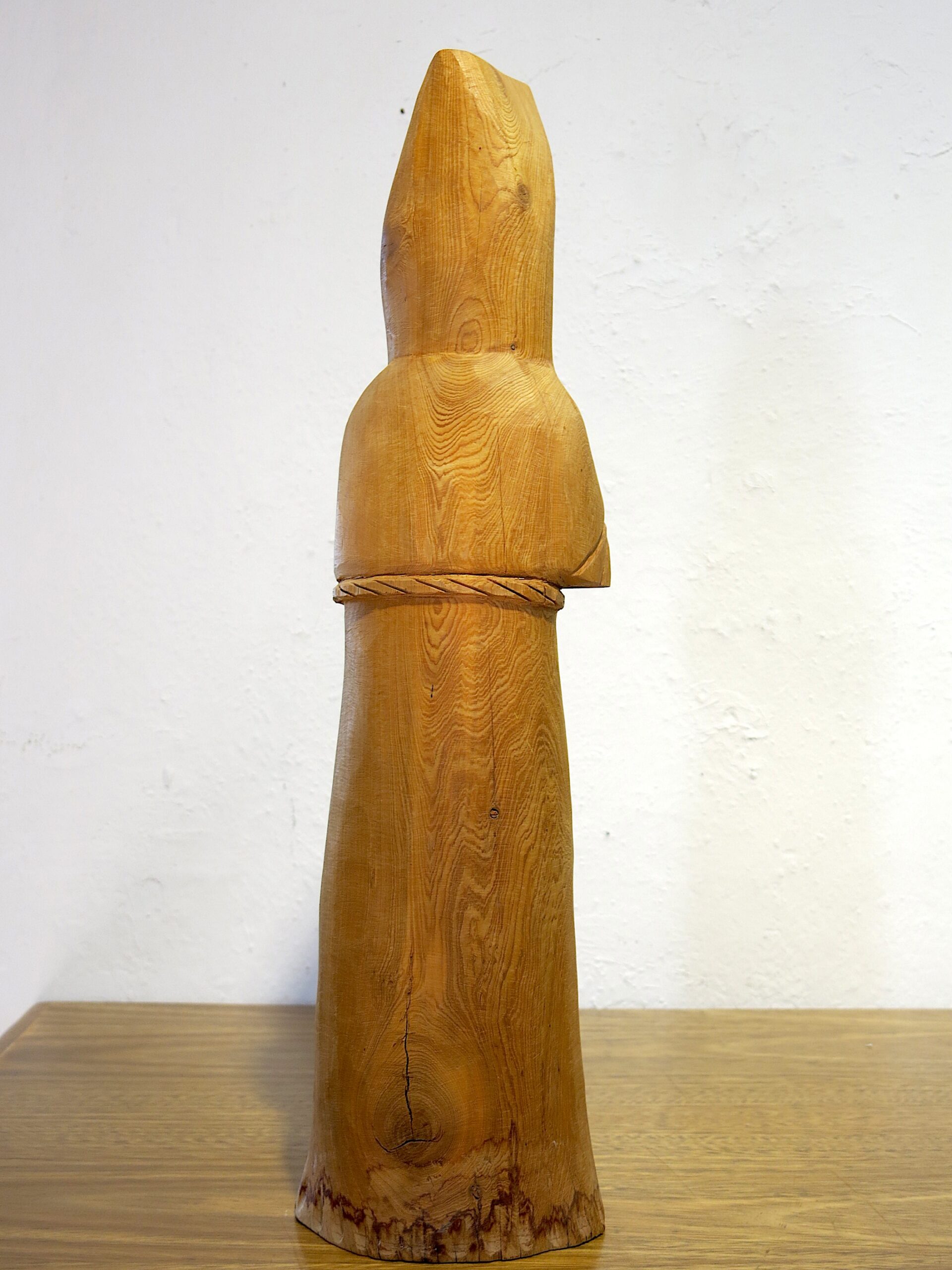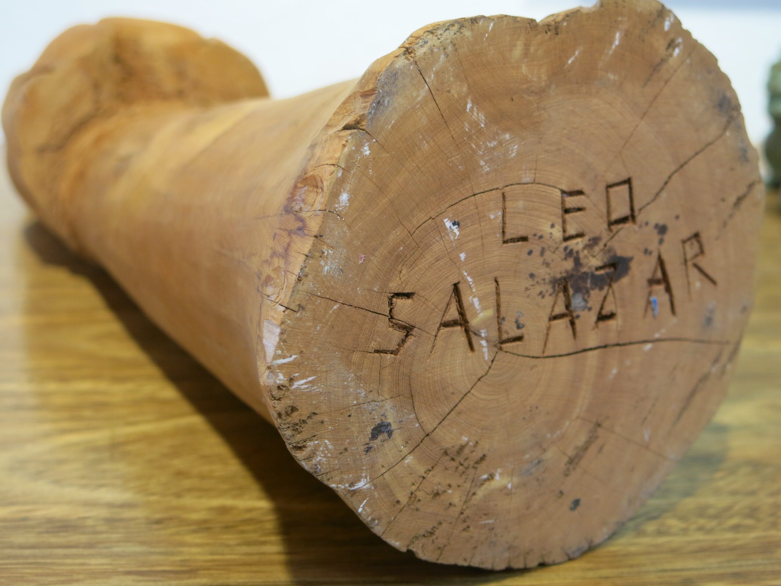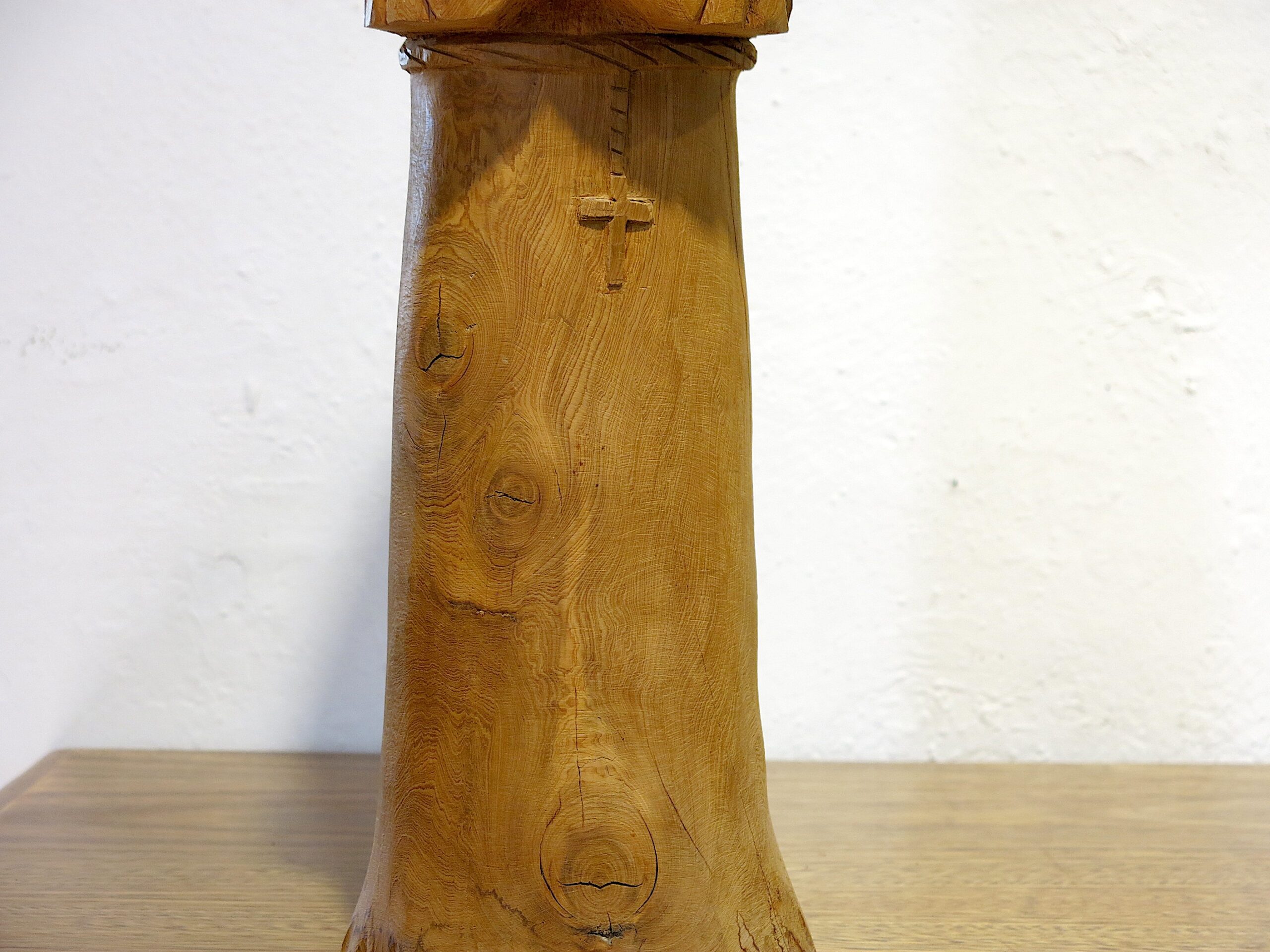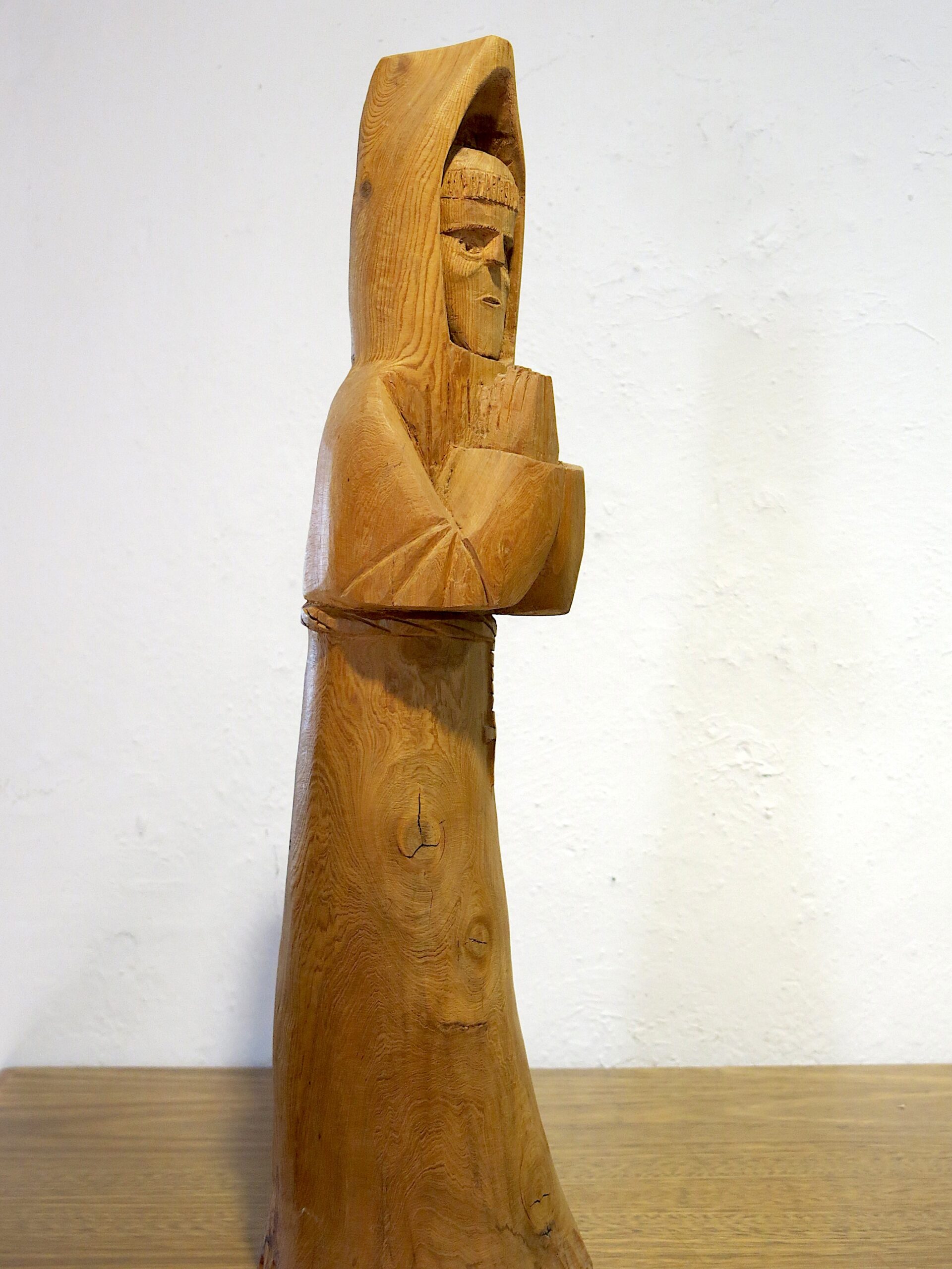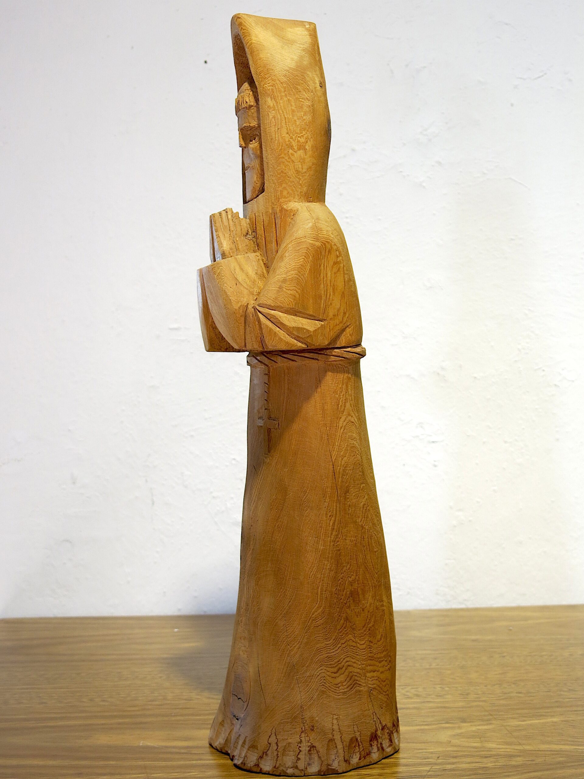 A signed hand-carved cedar bulto of a praying Franciscan friar by celebrated Taos, New Mexico santero Leo Salazar. The figure stands in a hooded Franciscan habit with both hands pressed together in prayer — a technically demanding composition requiring the arms to be fully freed from the wood. A cross is carved in relief on the front of the robe. The top of the head shows a carved tonsure — the shaved crown of a Franciscan monk — a fine detail rarely seen on bultos of this scale. Natural, unfinished aromatic cedar throughout, with dramatic natural knots incorporated into the lower robe. Signed “LEO SALAZAR” carved into the end-grain base. 21″x6″x5.75″ 6 lbs. Please see pictures for condition details as the photos are considered a part of the description.