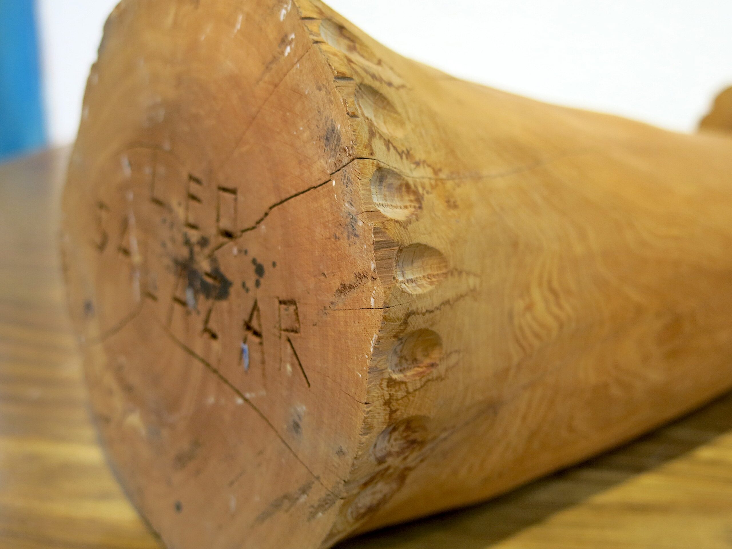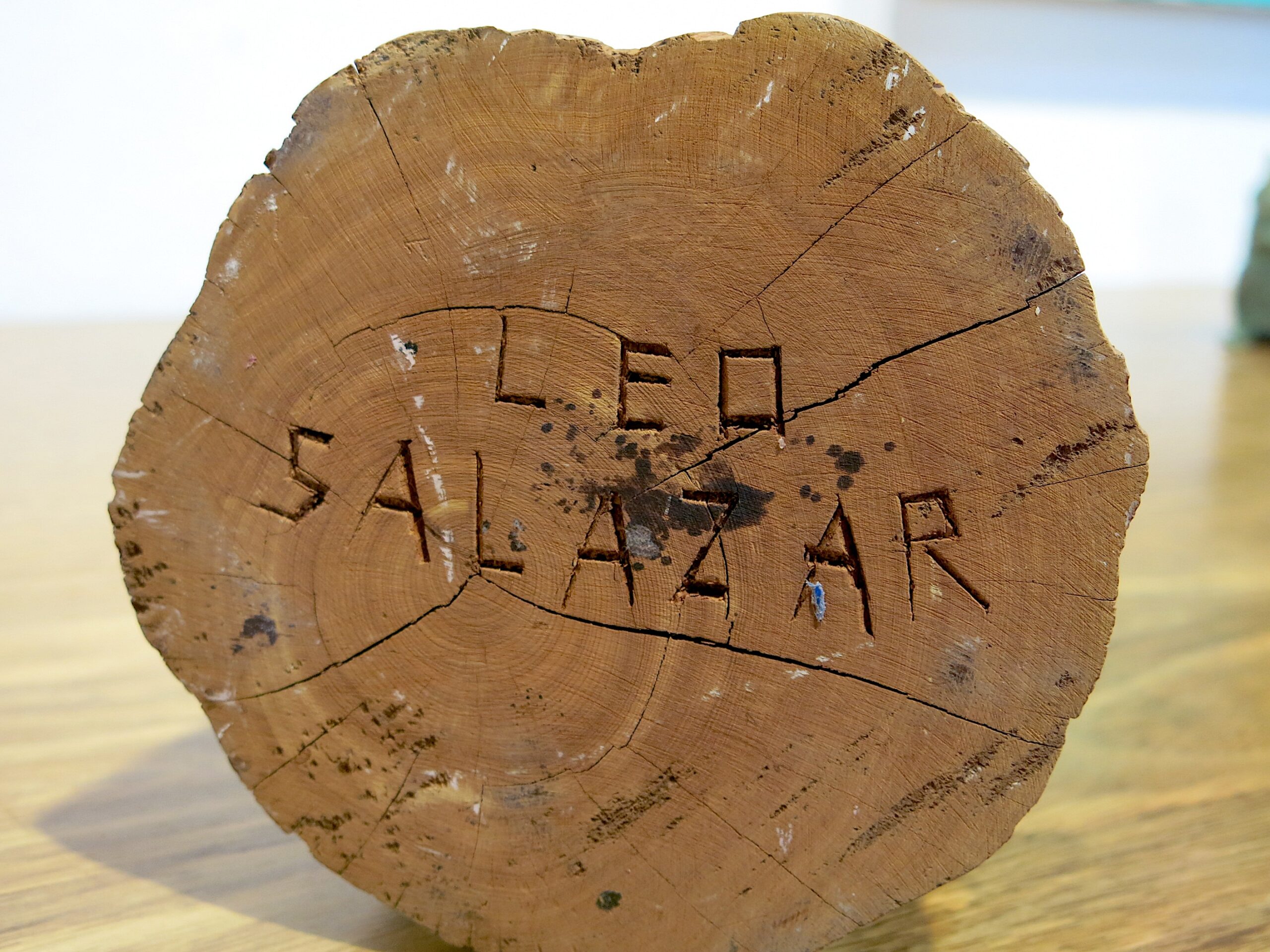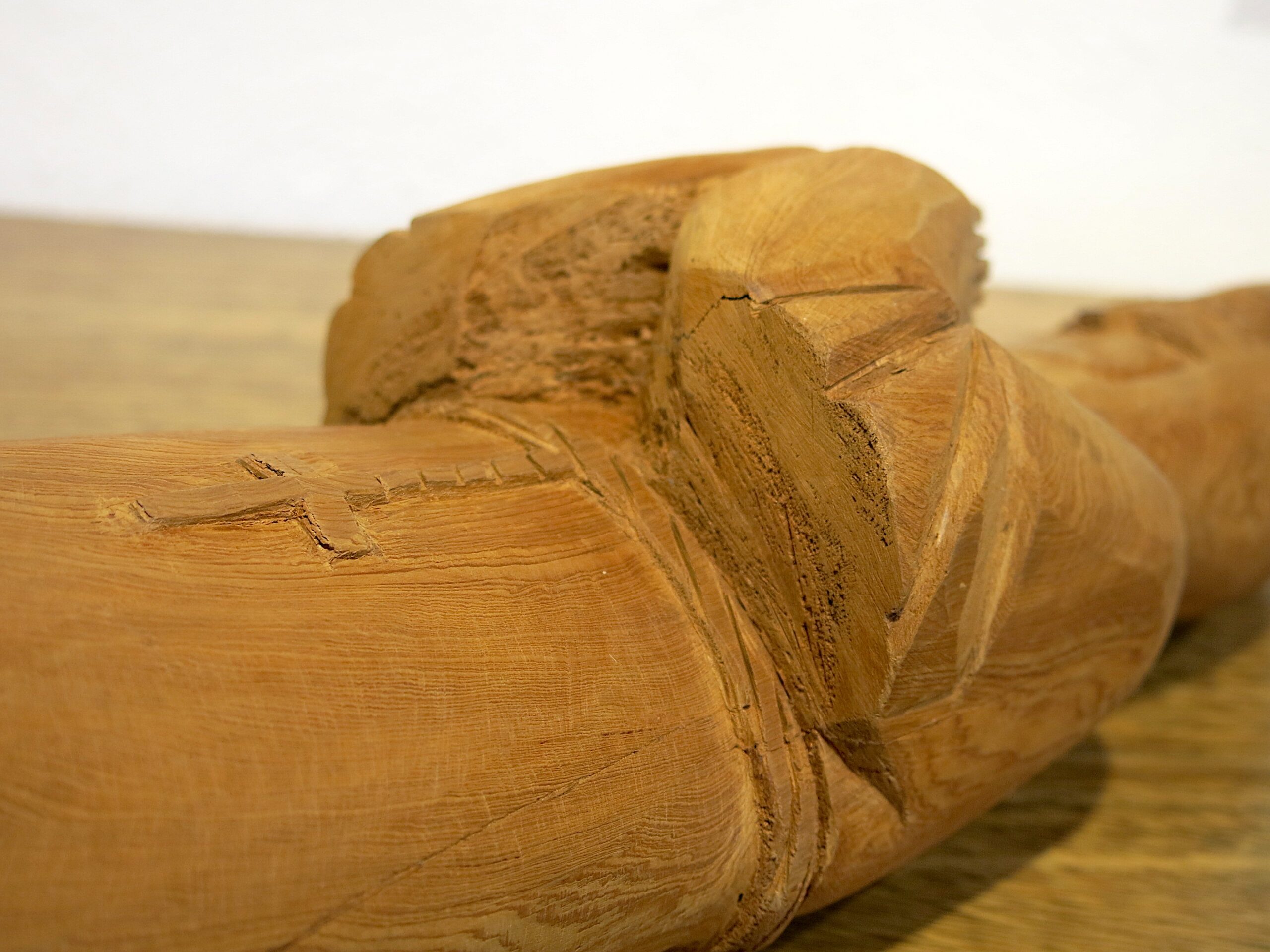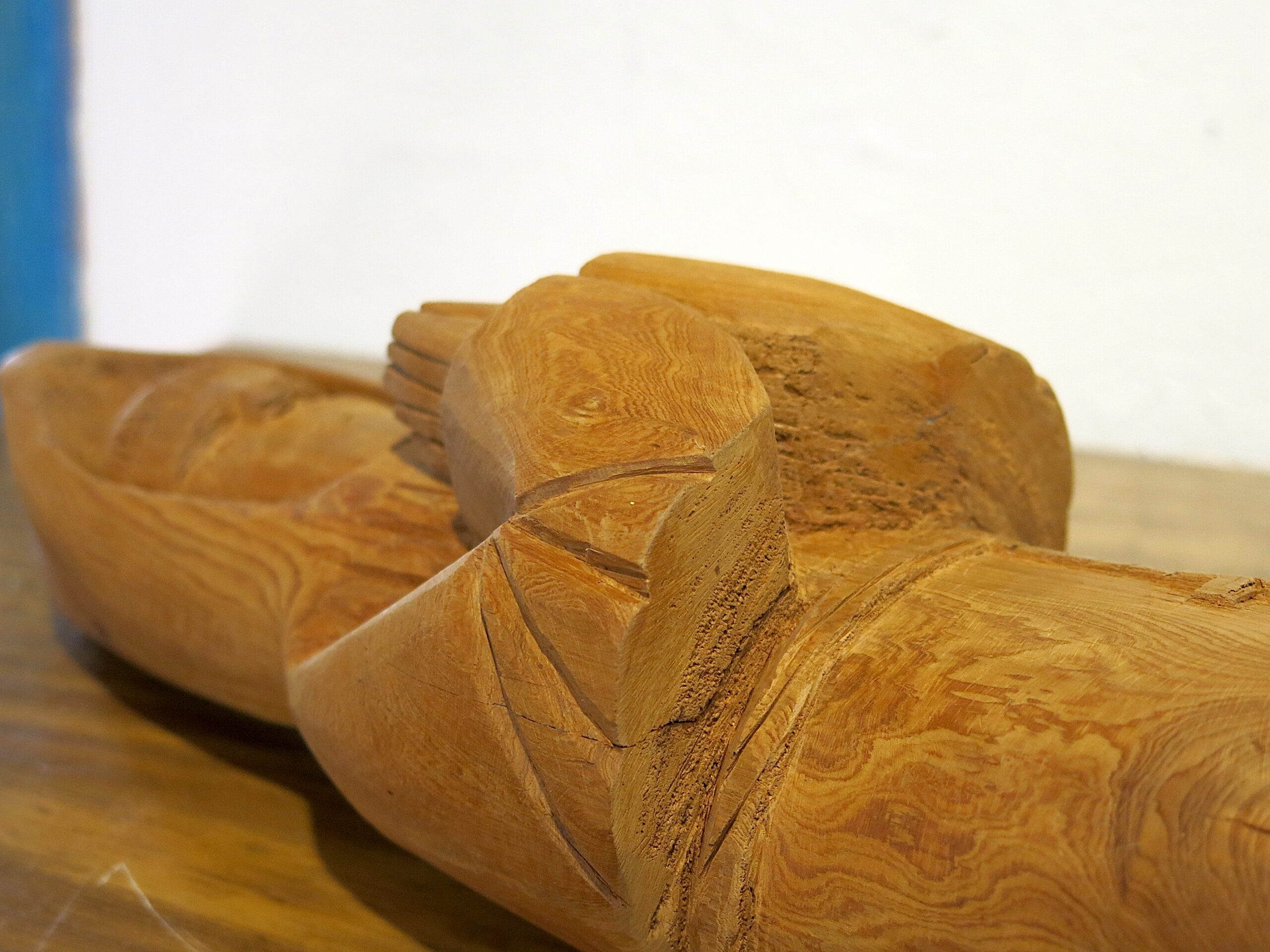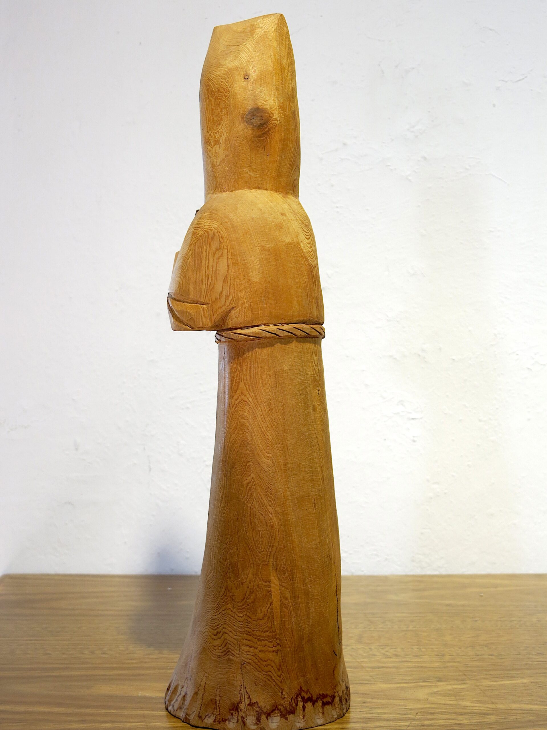 A signed hand-carved cedar bulto of a praying Franciscan friar by celebrated Taos, New Mexico santero Leo Salazar. The figure stands in a hooded Franciscan habit with both hands pressed together in prayer — a technically demanding composition requiring the arms to be fully freed from the wood. A cross is carved in relief on the front of the robe. The top of the head shows a carved tonsure — the shaved crown of a Franciscan monk — a fine detail rarely seen on bultos of this scale. Natural, unfinished aromatic cedar throughout, with dramatic natural knots incorporated into the lower robe. Signed “LEO SALAZAR” carved into the end-grain base. 21″x6″x5.75″ 6 lbs. Please see pictures for condition details as the photos are considered a part of the description.