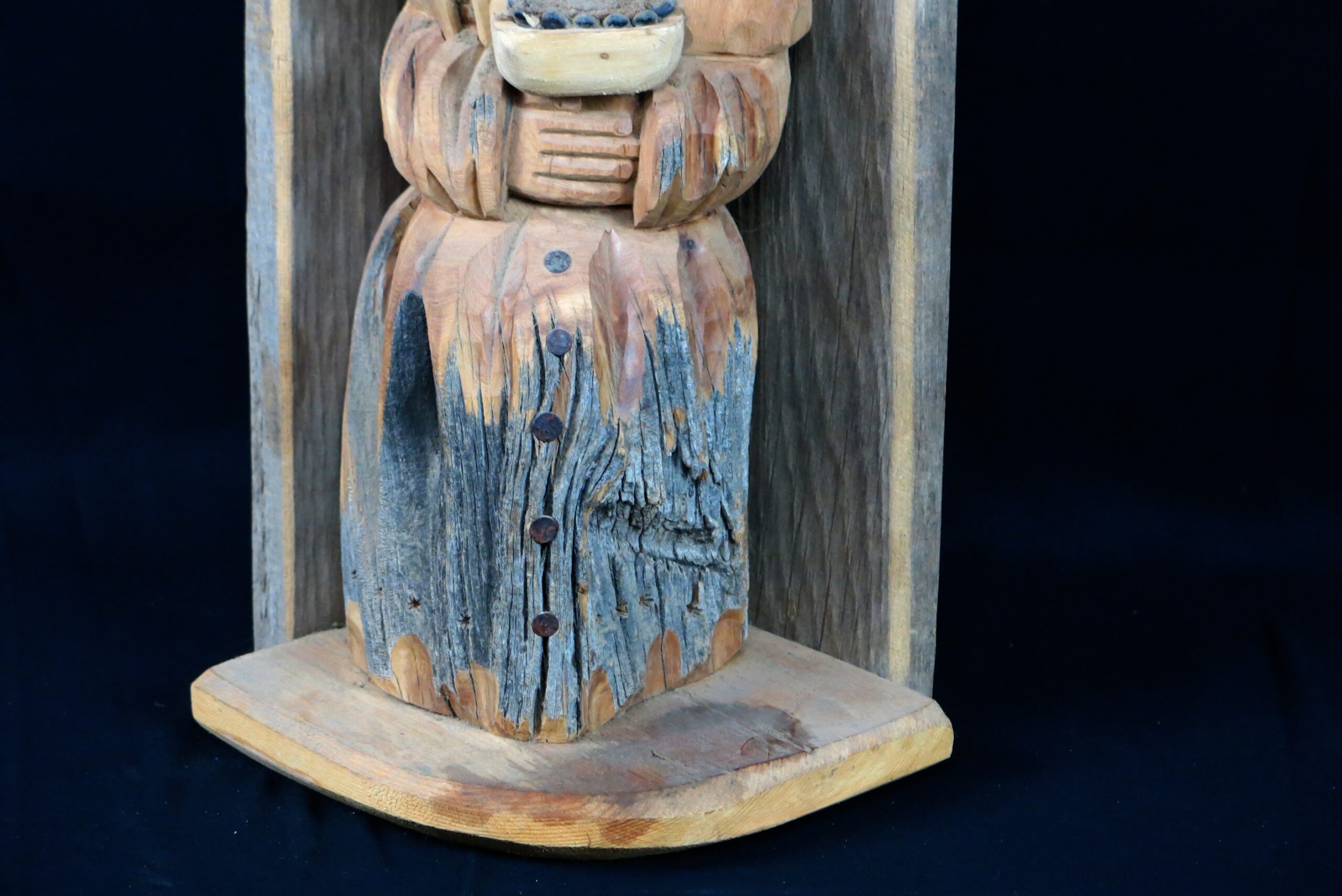 Leonardo Salazar is a renowned santero from Taos, New Mexico known for his hand-carved cedar bultos or three-dimensional religious statues that often incorporate natural wood forms. While he typically works in wood, traditional New Mexican folk art often pairs these bultos with tinwork, such as a “tin fan” or halo, which reflects the historical evolution of the craft in the late 19th century. He insists on performing all work by hand while cradling the piece in his lap, a practice he maintained even as his work reached global collections like the Smithsonian and the Vatican. 17.5″x11″x7″ Please see pictures for condition details as the photos are considered part of the description.