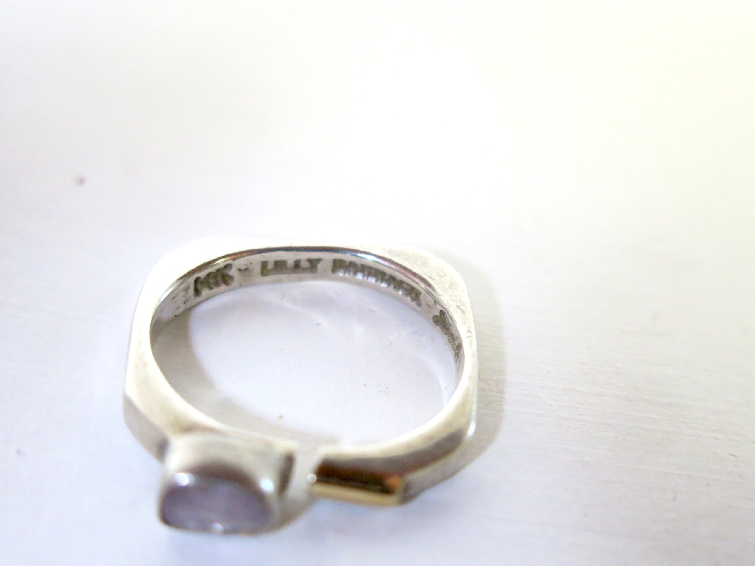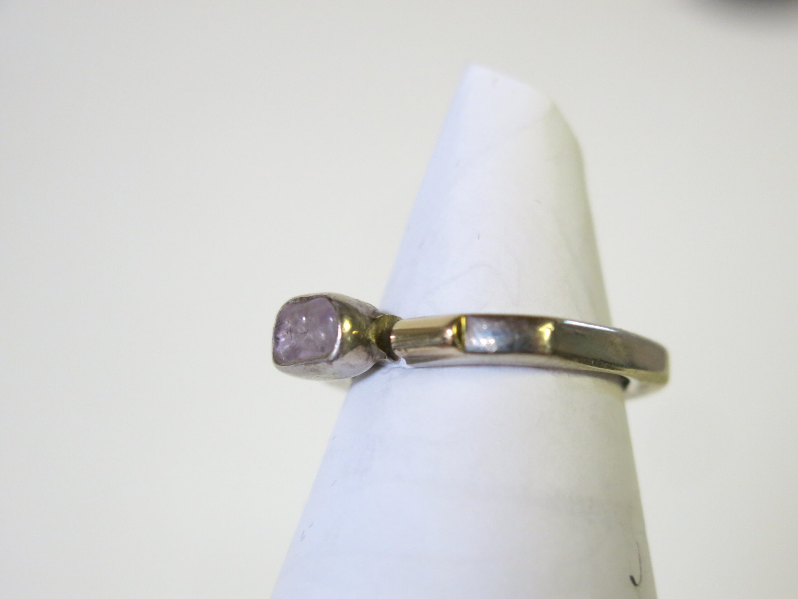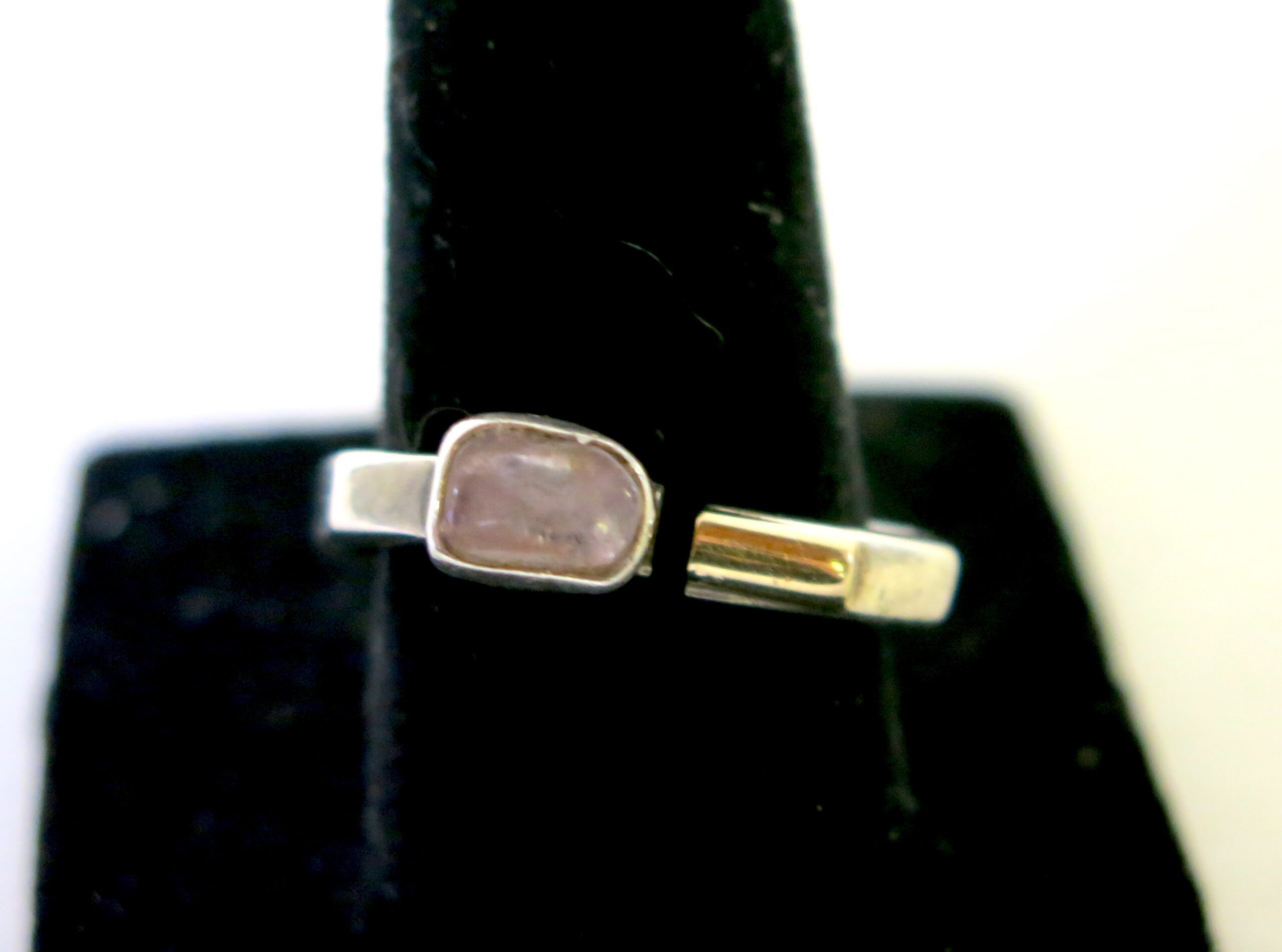 Each Lilly Barrack piece is individually handmade at her studio in New Mexico. Her pieces are forged from 925 Sterling Silver. The ring has a bezel set amethyst stone and 14 carat gold bar. Every stone is handpicked to ensure that every piece is unique. Size at 7.5 (easily resized)