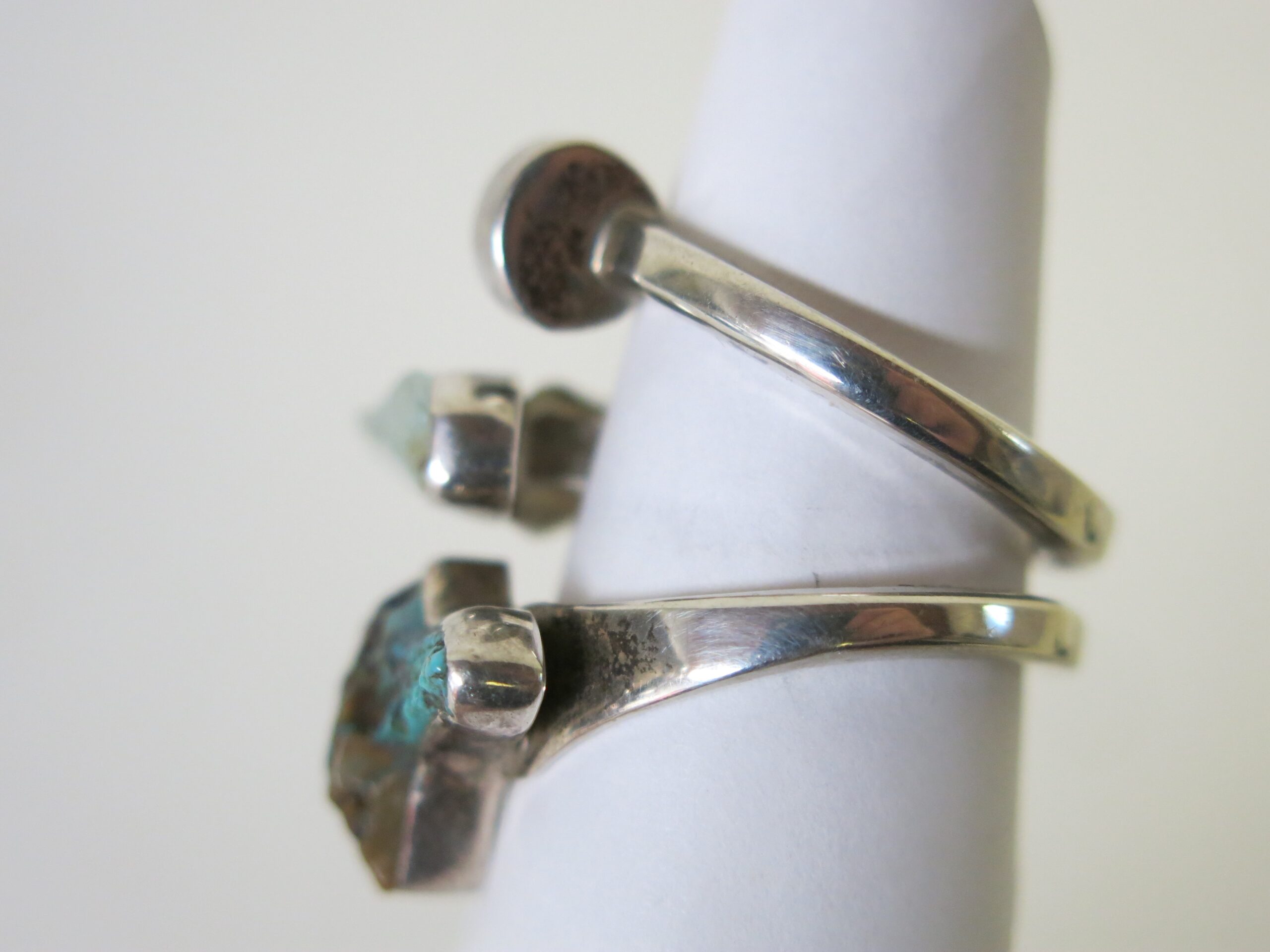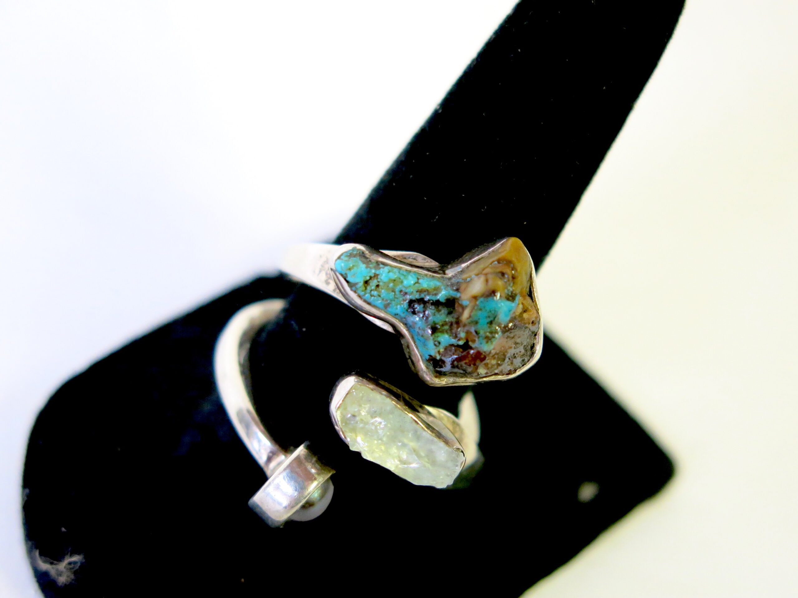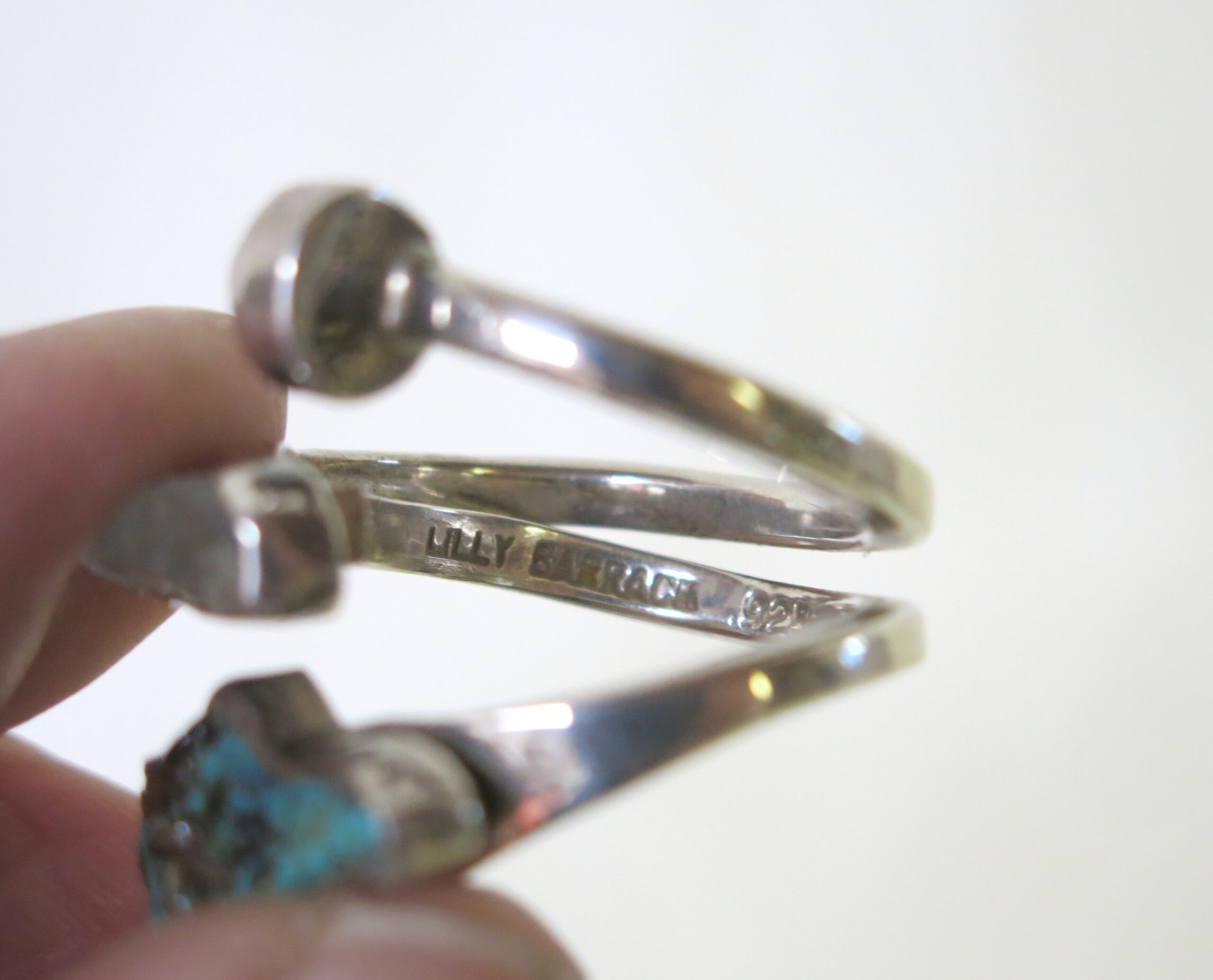 Each Lilly Barrack piece is individually handmade at her studio in New Mexico. Her pieces are forged from 925 Sterling Silver. Every stone is handpicked to ensure that every piece is unique. The individual stones are raw and untreated. Size at 7.5 (easily resized)