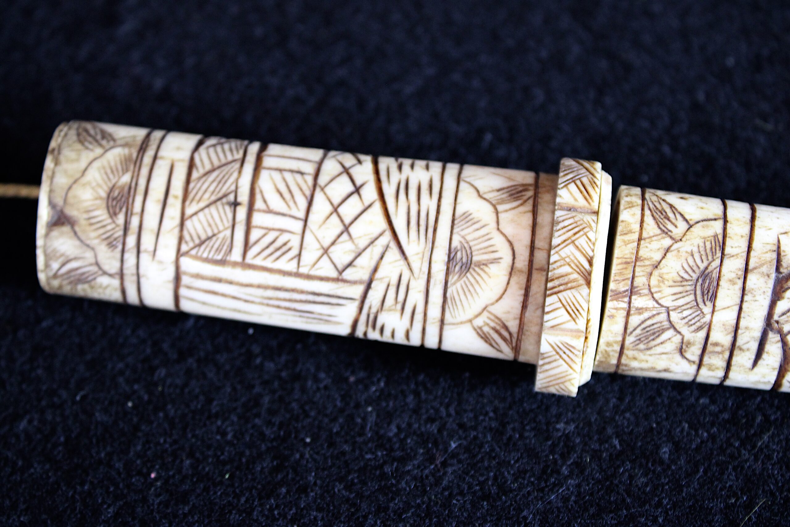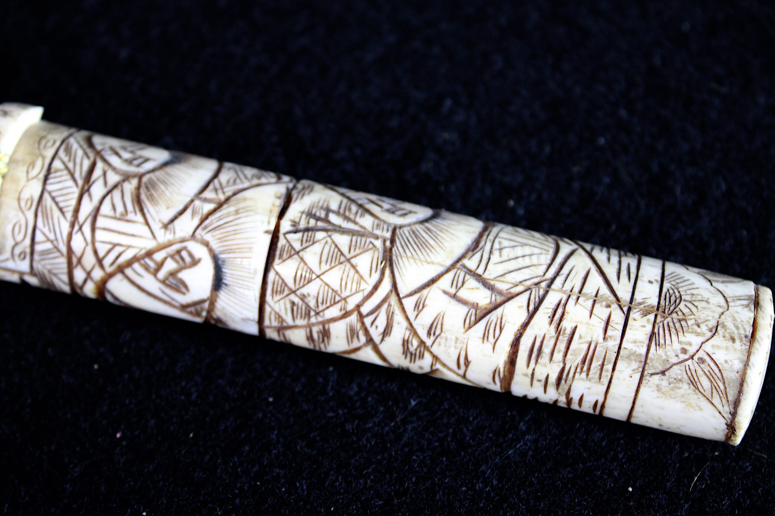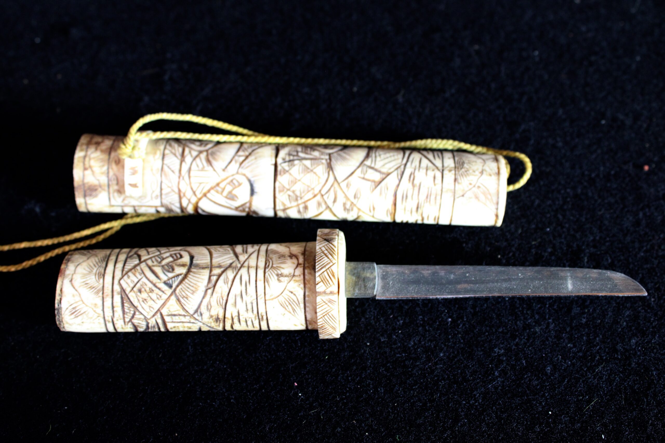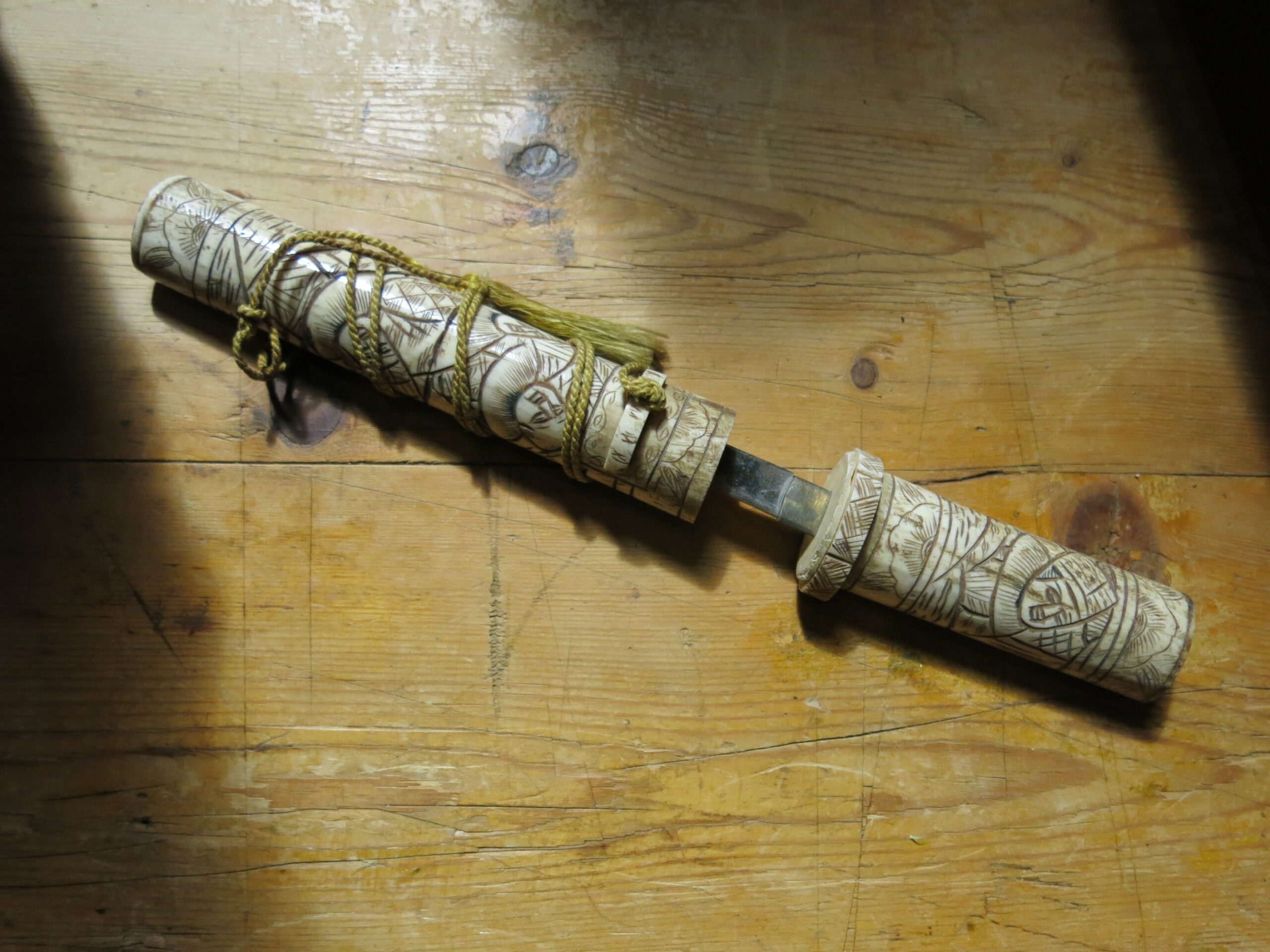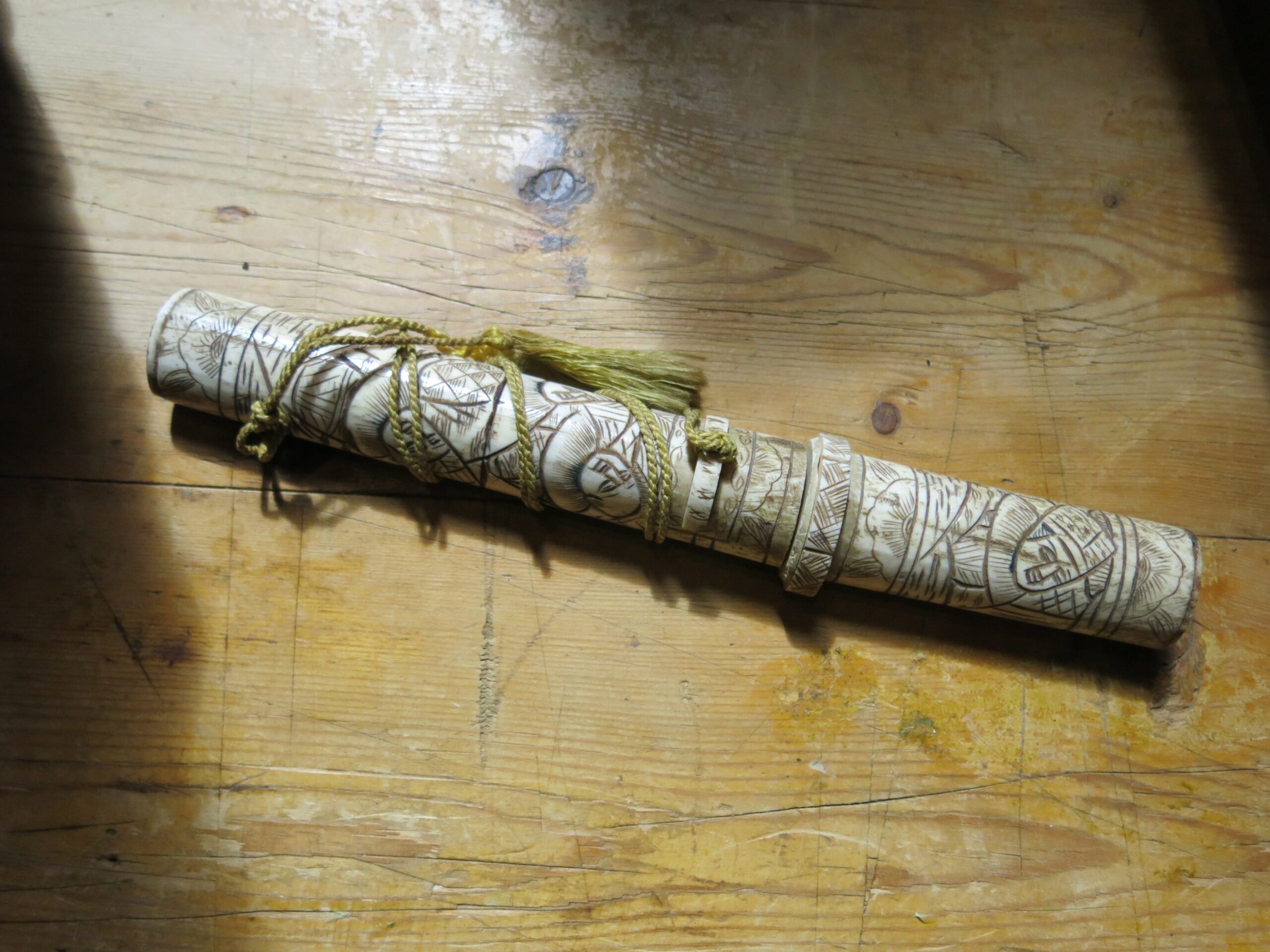 The scabbard (saya) and handle (tsuka) are constructed from carved bone, likely ox or cow. You can see visible “seams” or segments where multiple pieces of bone have been joined together to form the length of the scabbard. Ivory, by contrast, was usually carved from a single dense piece. While functional versions existed, these highly ornate bone pieces were primarily created for the export and tourist trade during the late 19th and early 20th centuries. They were intended as decorative “Grand Tour” souvenirs rather than combat-ready weapons. The surface is decorated in low-relief carving that has been inked or stained black to highlight the details. These carvings depict traditional Japanese scenes, such as samurai, figures in a landscape, or floral motifs. 10.5″x1.25″x.75″ Please see pictures for condition details as the photos are considered part of the description.