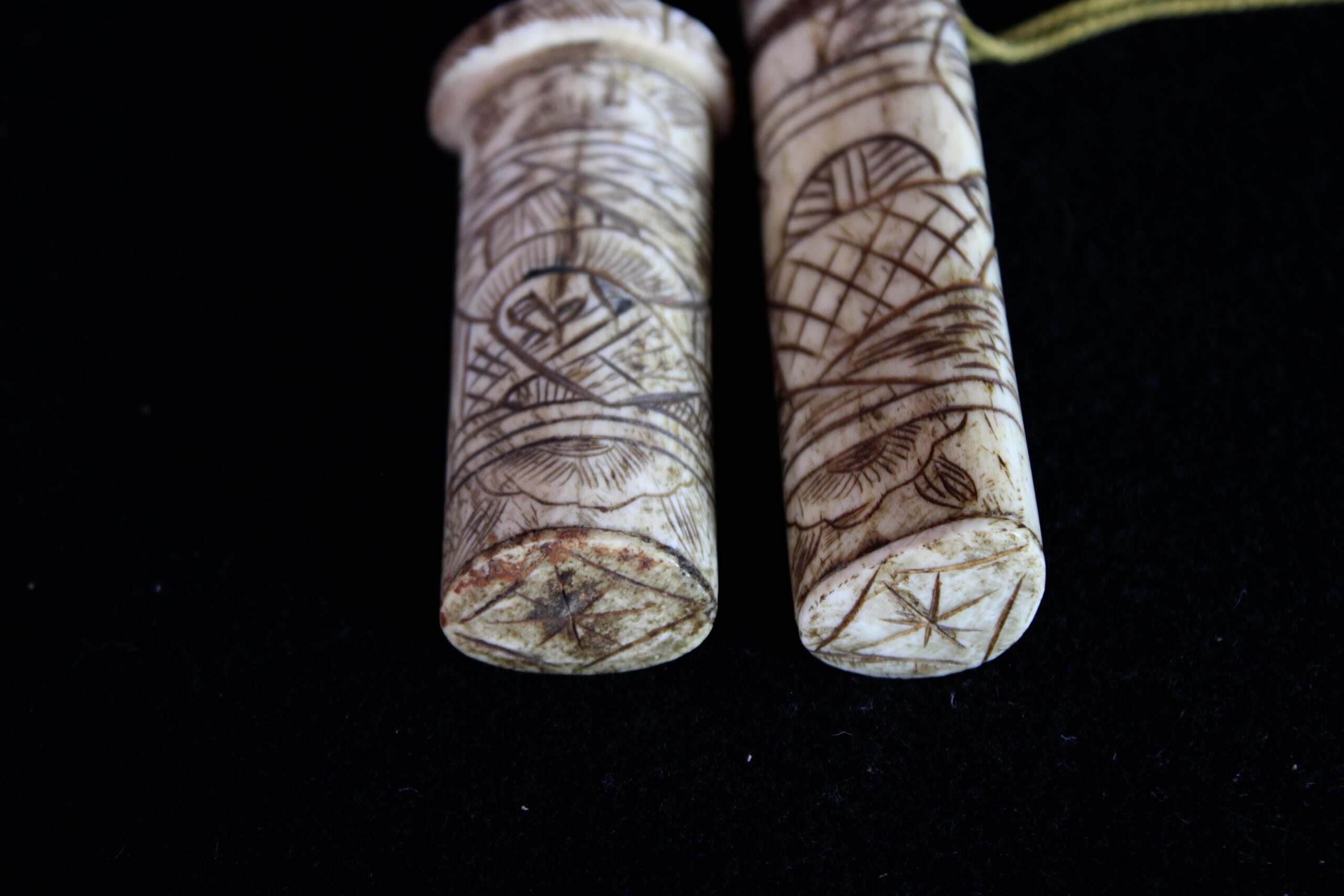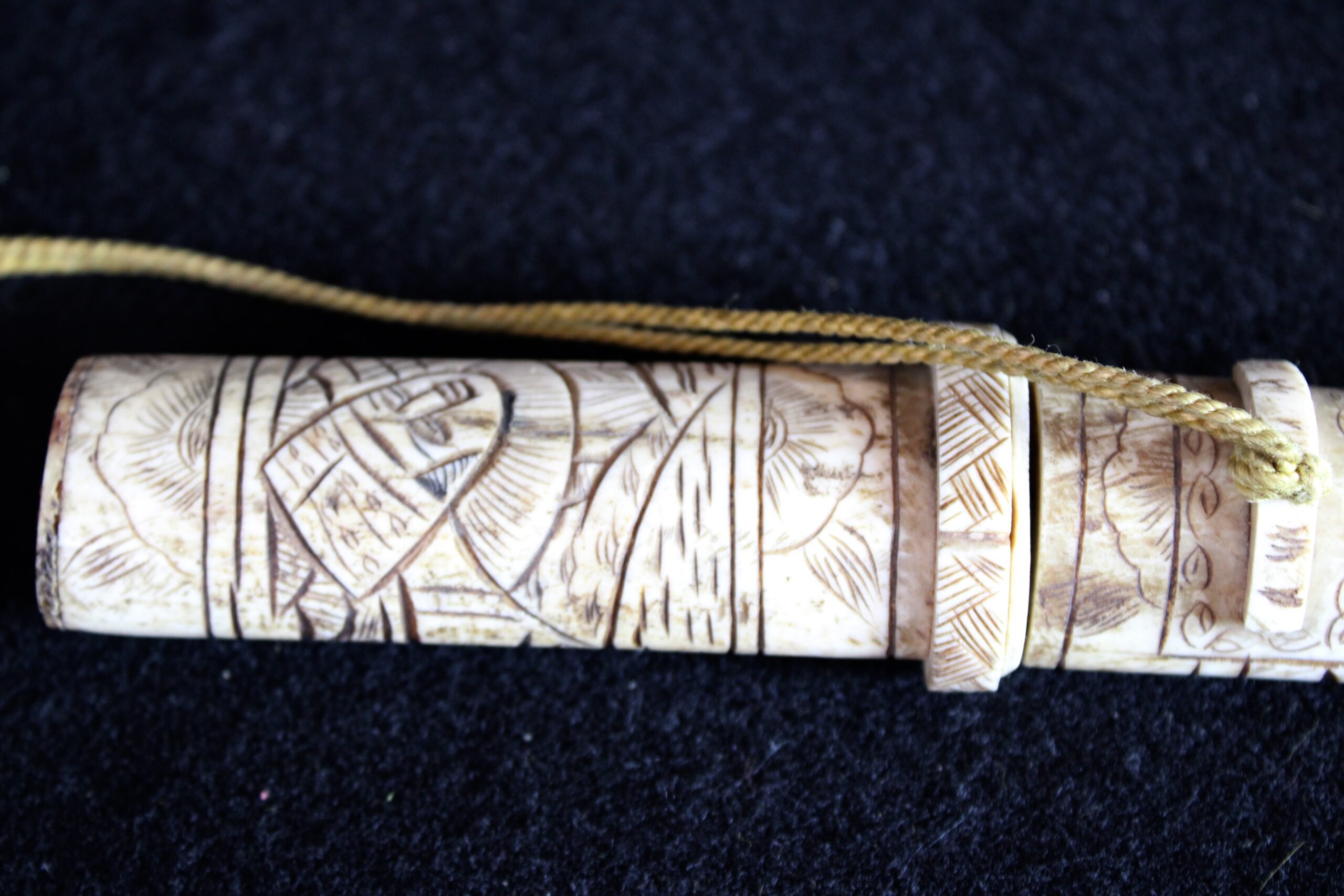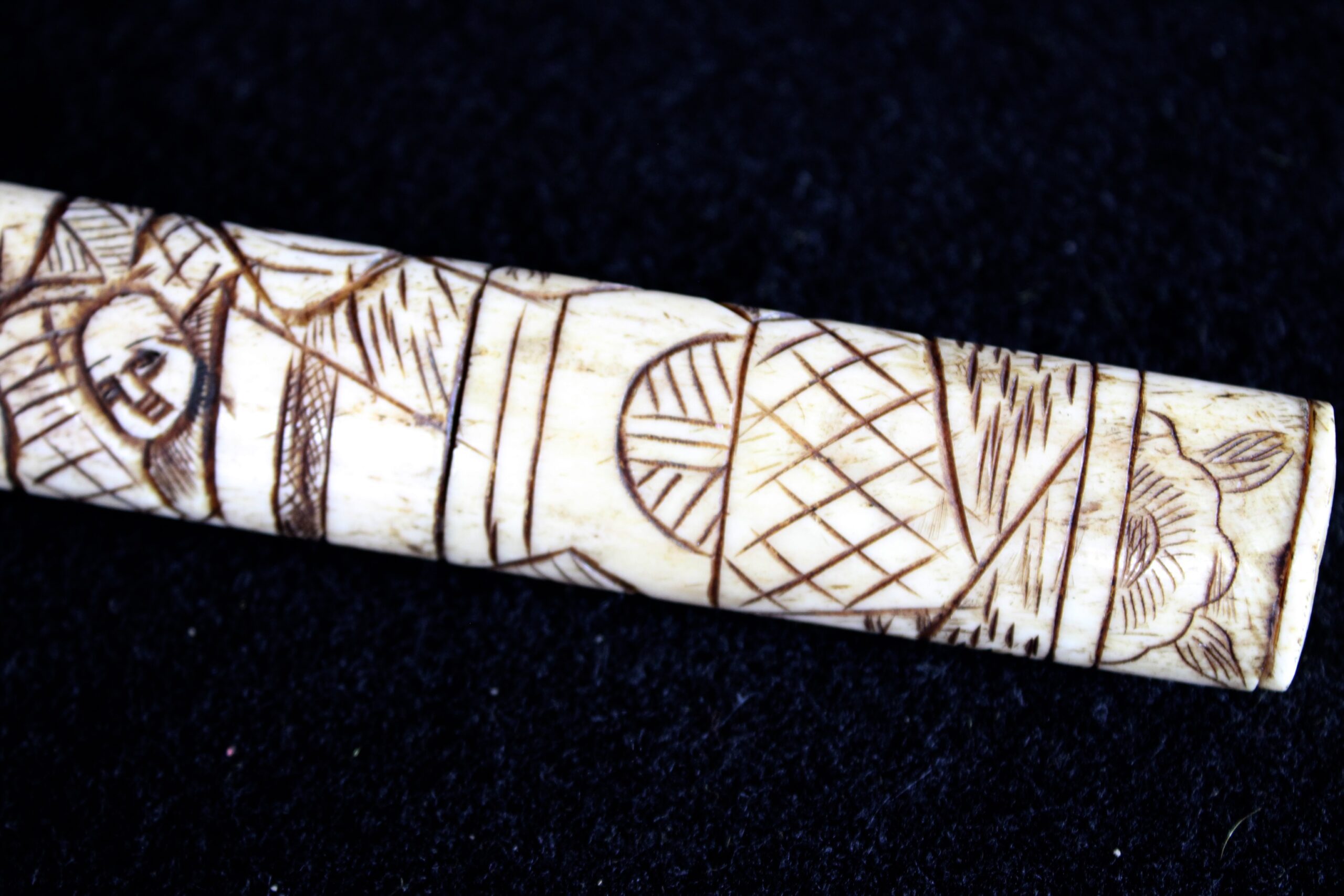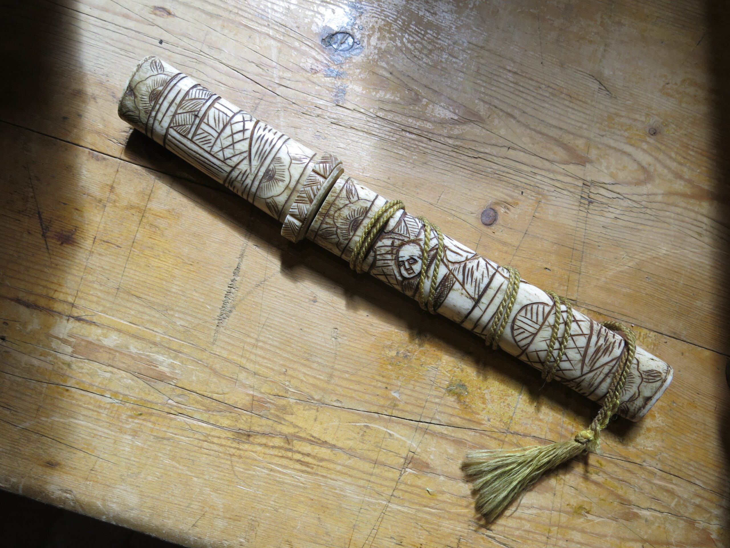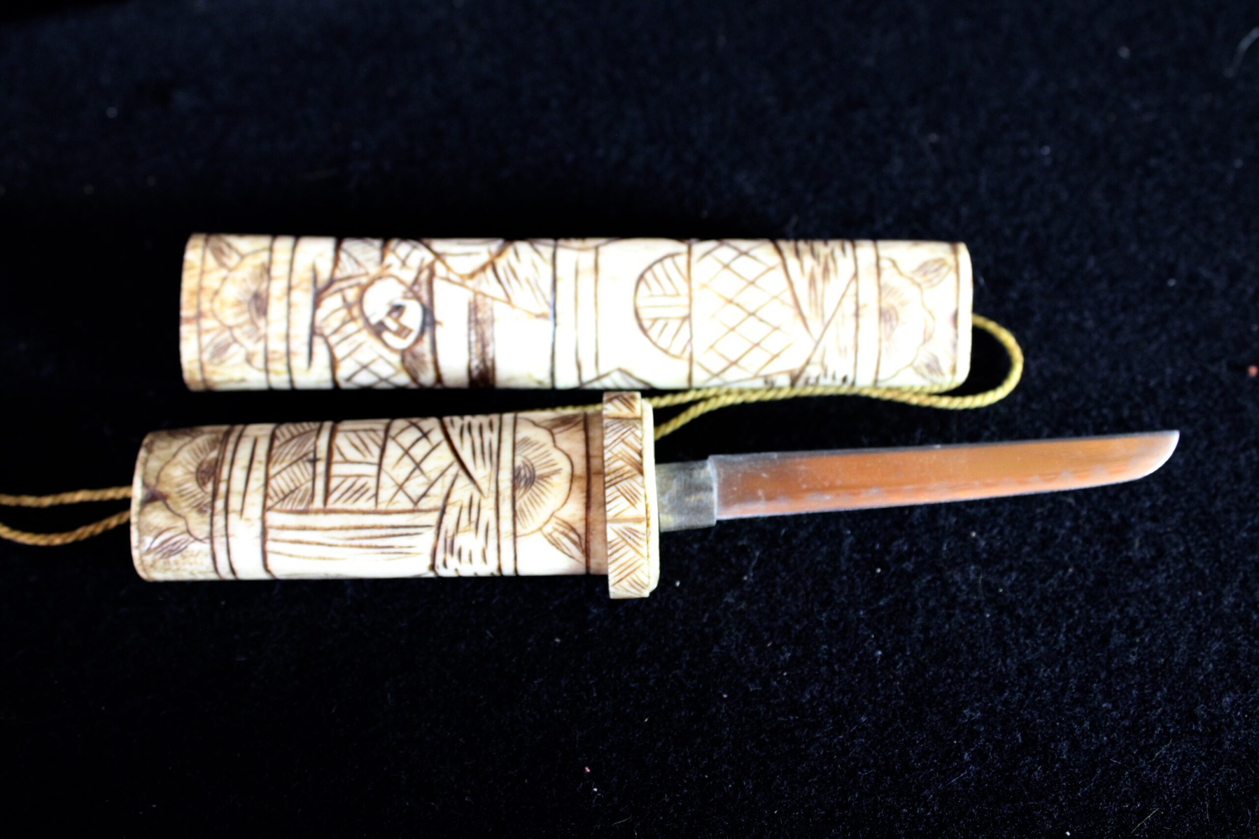 The scabbard (saya) and handle (tsuka) are constructed from carved bone, likely ox or cow. You can see visible “seams” or segments where multiple pieces of bone have been joined together to form the length of the scabbard. Ivory, by contrast, was usually carved from a single dense piece. While functional versions existed, these highly ornate bone pieces were primarily created for the export and tourist trade during the late 19th and early 20th centuries. They were intended as decorative “Grand Tour” souvenirs rather than combat-ready weapons. The surface is decorated in low-relief carving that has been inked or stained black to highlight the details. These carvings depict traditional Japanese scenes, such as samurai, figures in a landscape, or floral motifs. 10.5″x1.25″x.75″ Please see pictures for condition details as the photos are considered part of the description.