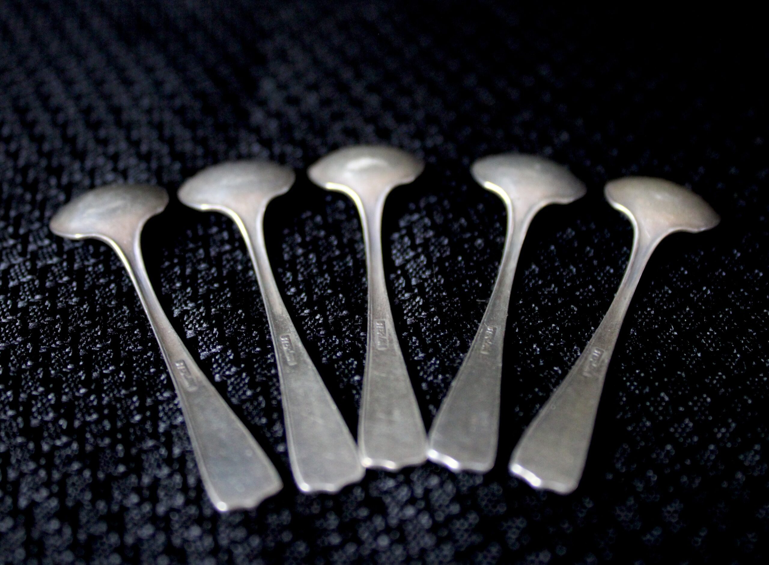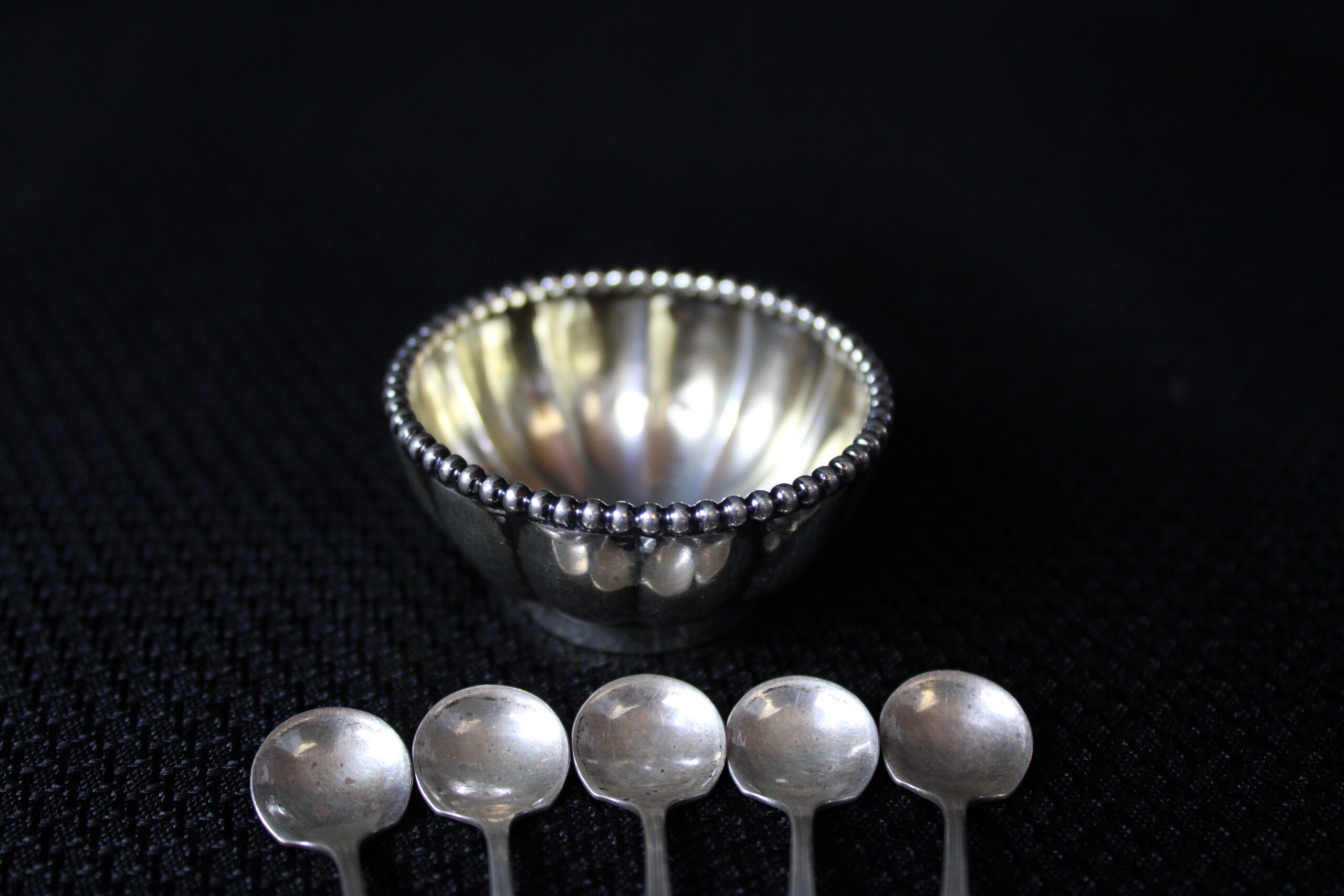 Rare George Shiebler Sterling Silver Salt Cellar with Five Spoons
