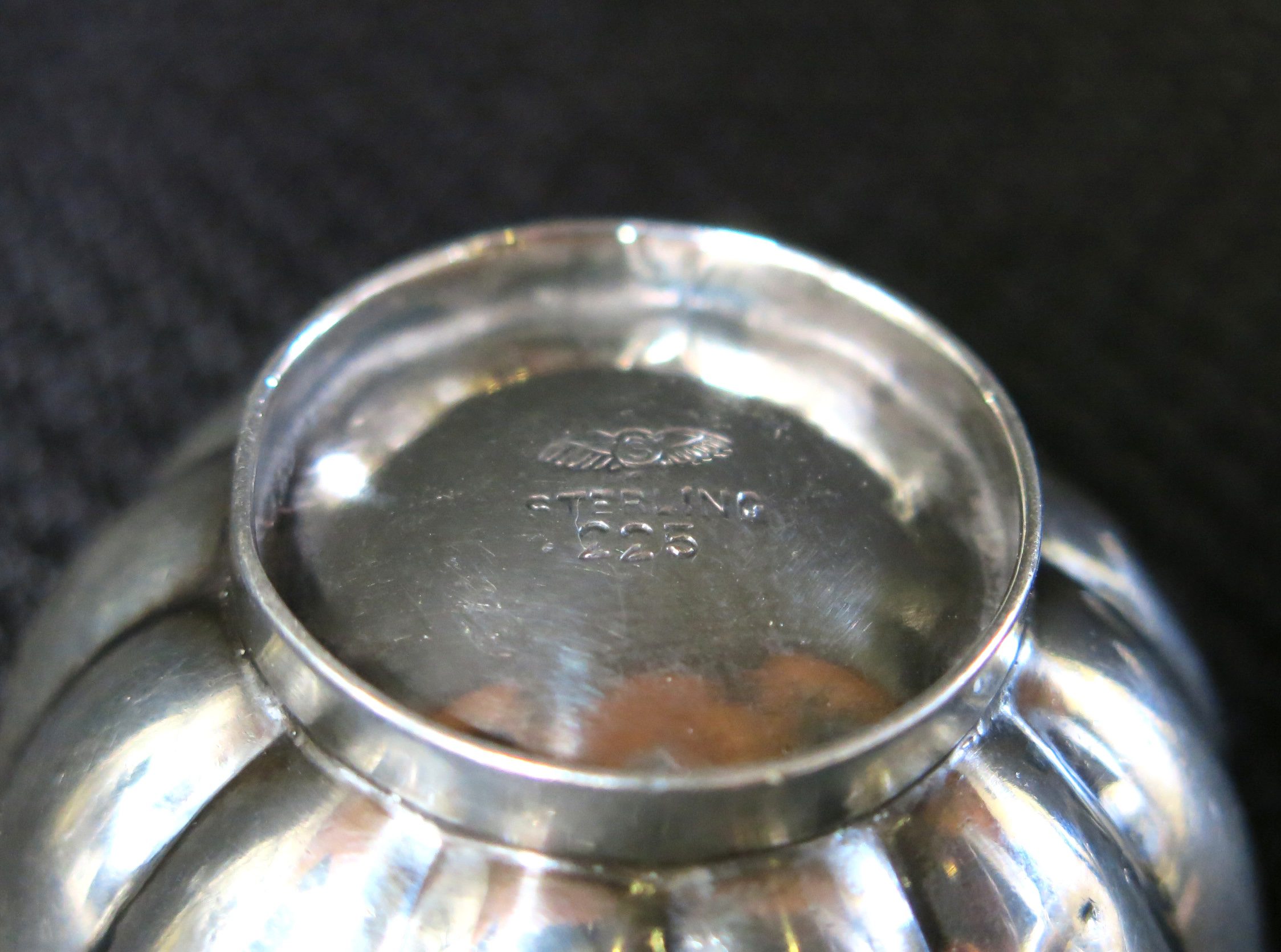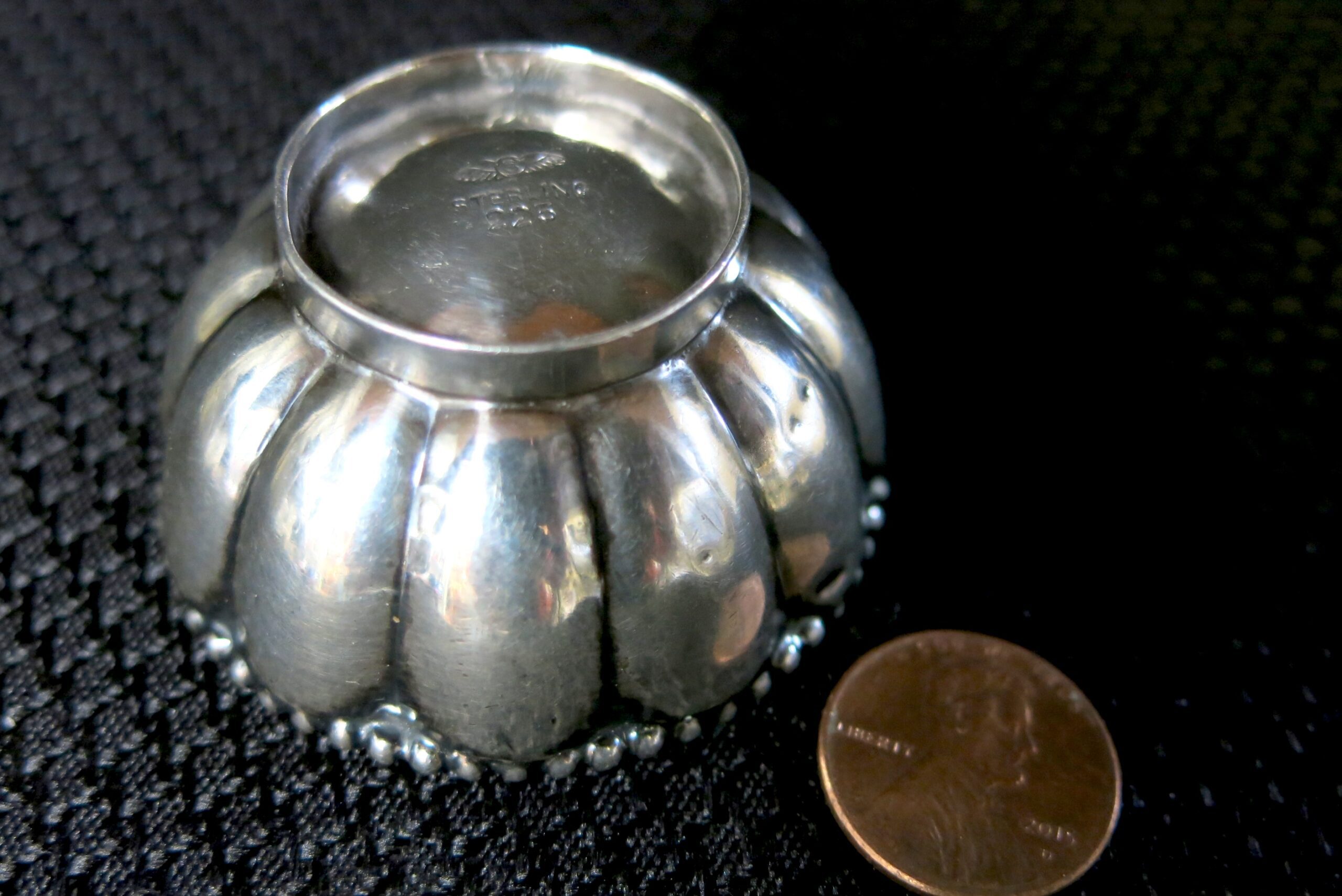Lotus form with beaded edge leading to foliate flutes dipping round to a footed base. Some dents in flutes. Marked with a flying S hallmark (George Shiebler) above Sterling 225. Rare form in vintage condition. Salt spoons are all marked Sterling. Bowl 30g Spoons 20g Total 50g. Please see pictures for condition details as the photos are considered part of the description.