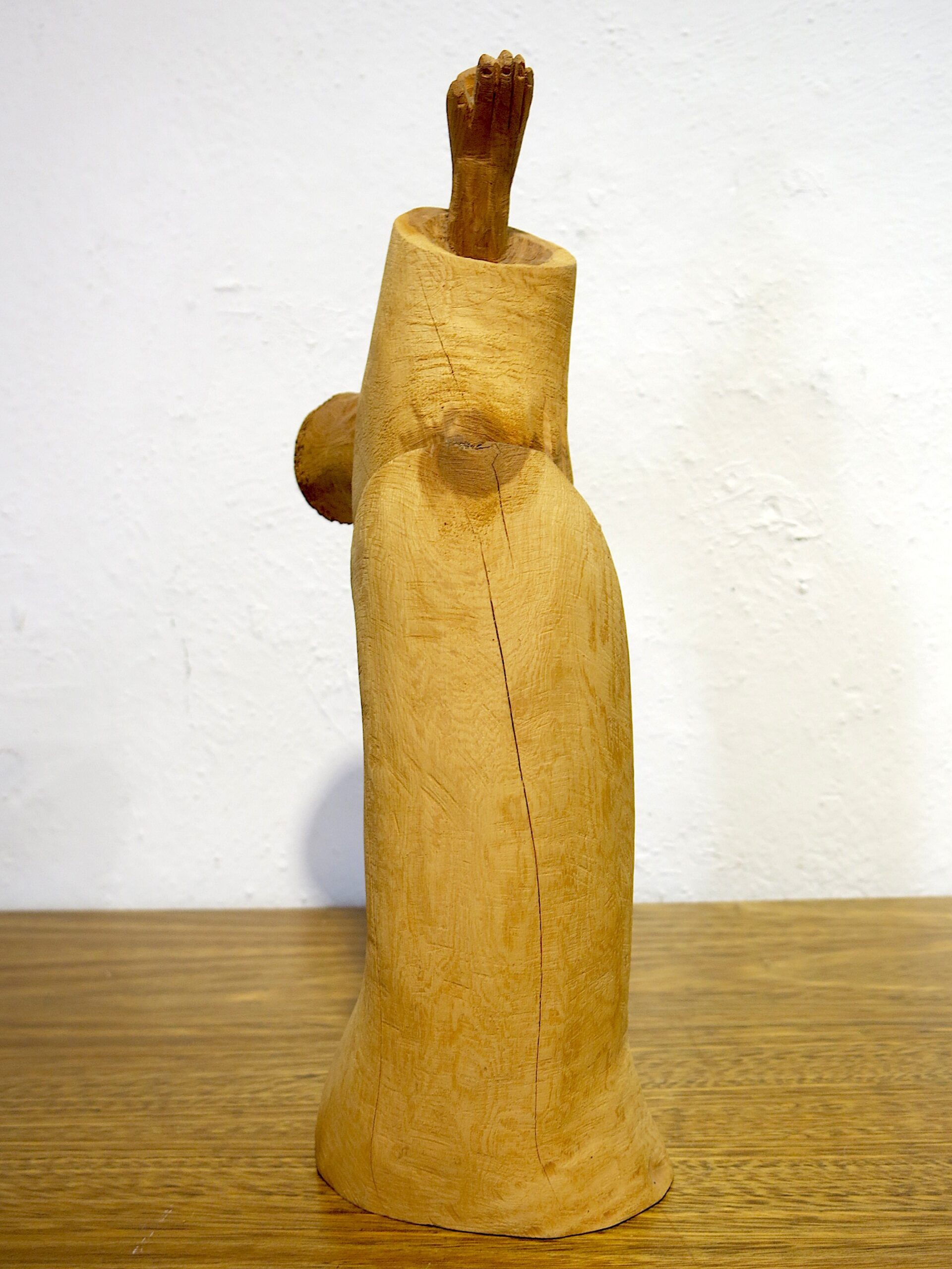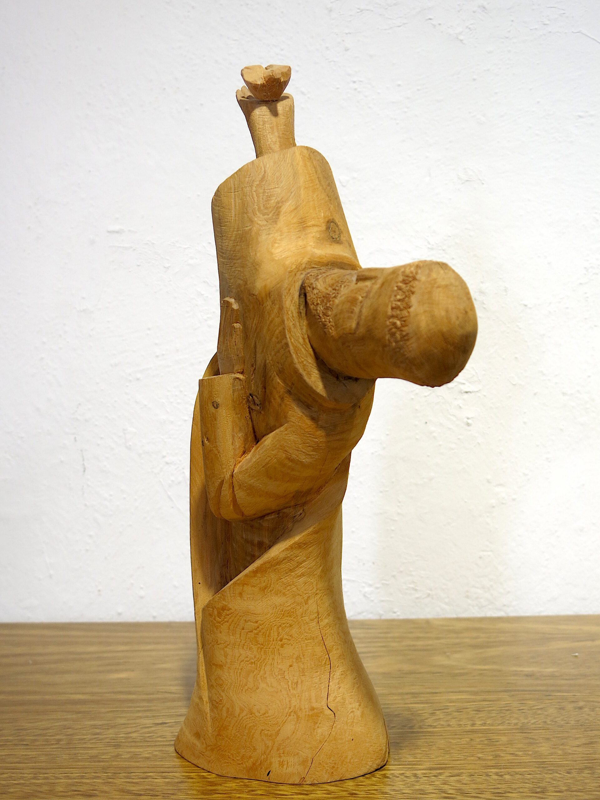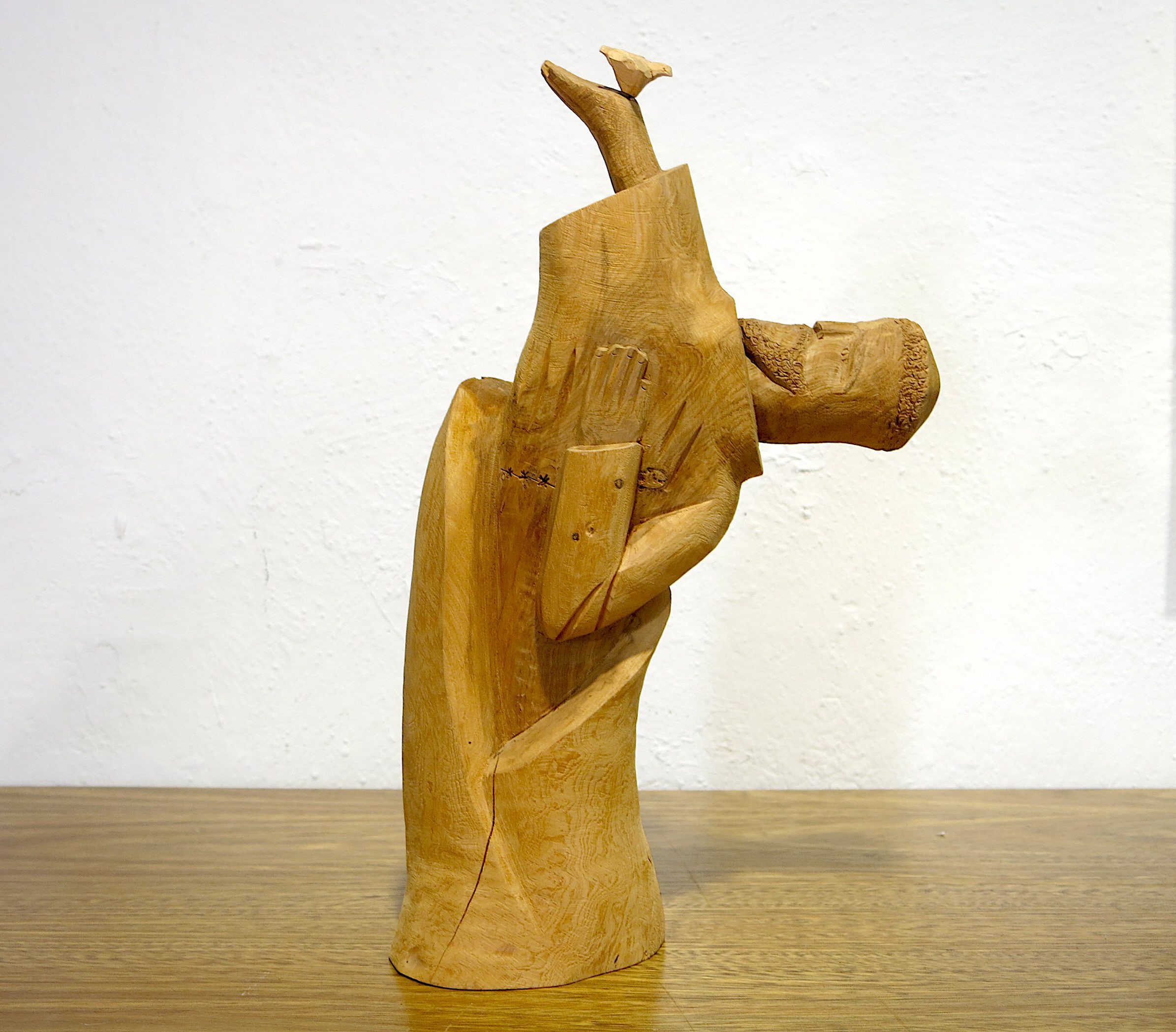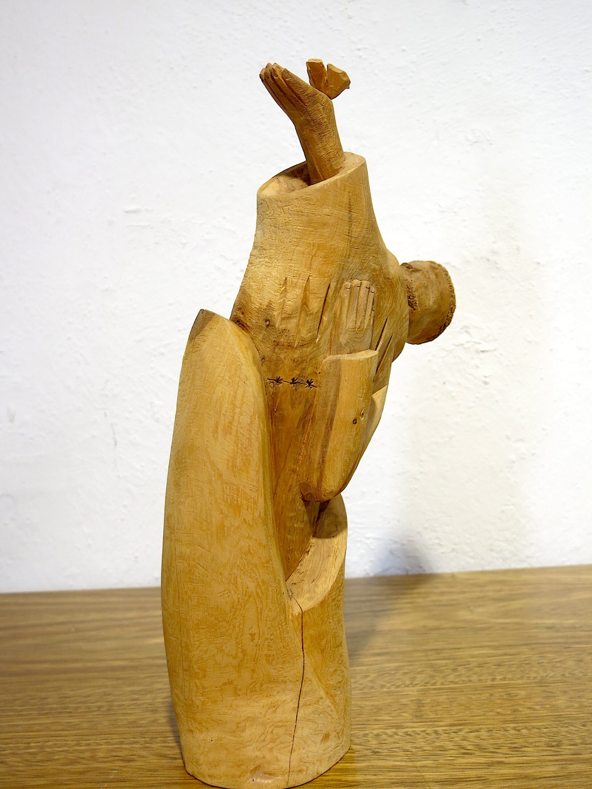An exceptional and rare large-scale hand-carved cedar bulto of San Francisco de Asís (St. Francis of Assisi) by Michael Salazar of Taos, New Mexico — signed 1983, within his final years of carving before his untimely death in the mid-1980s. This is among the most ambitious compositions in the Salazar family tradition. The figure leans forward dramatically at a steep angle — breaking completely from the static columnar form typical of New Mexican bultos — with the face turned in profile and one arm raised, a small bird perched on the outstretched hand. The other arm holds a book or tablet against the body, carved with star-punch cross marks. The leaning posture and intact bird represent an extraordinary feat of carving in a single piece of cedar. 15″x8″x4.5″ 3 lbs. Please see pictures for condition details as the photos are considered a part of the description.