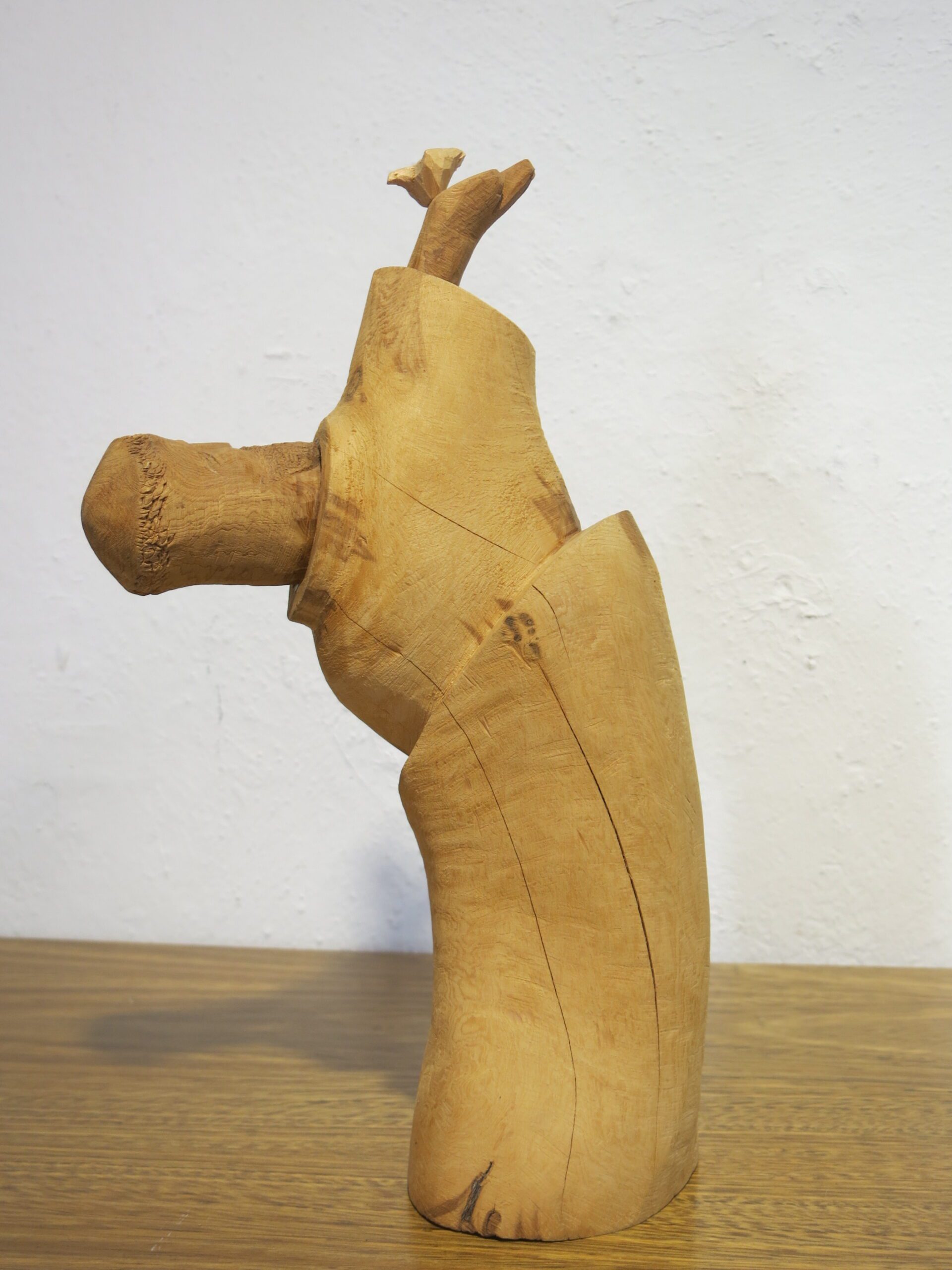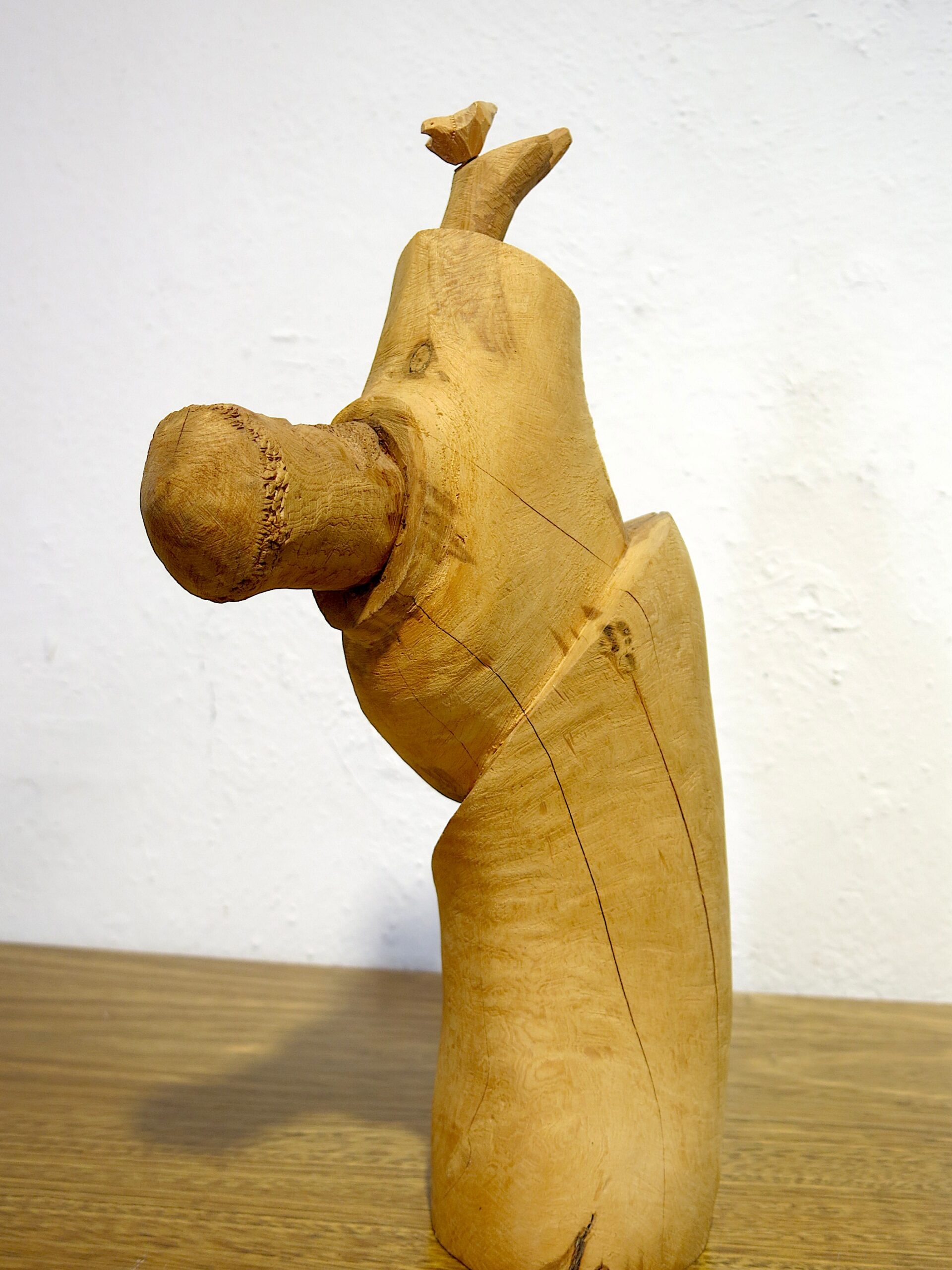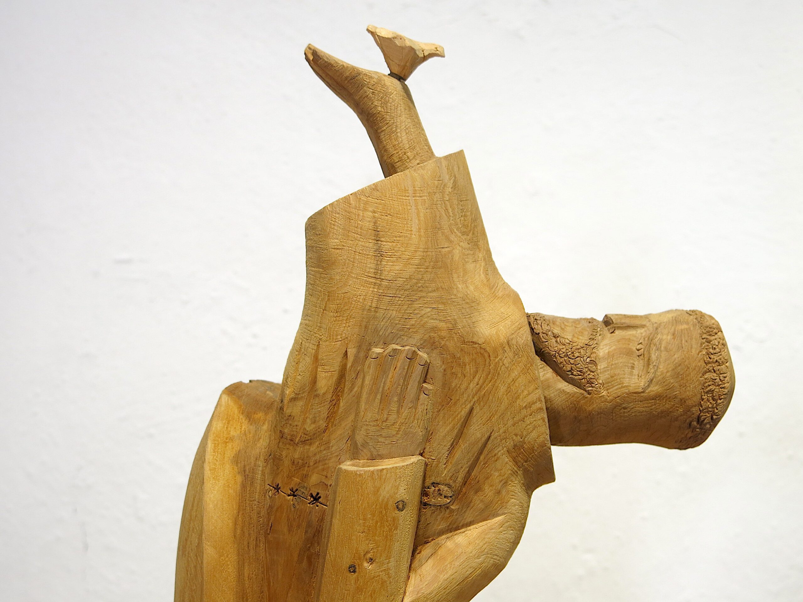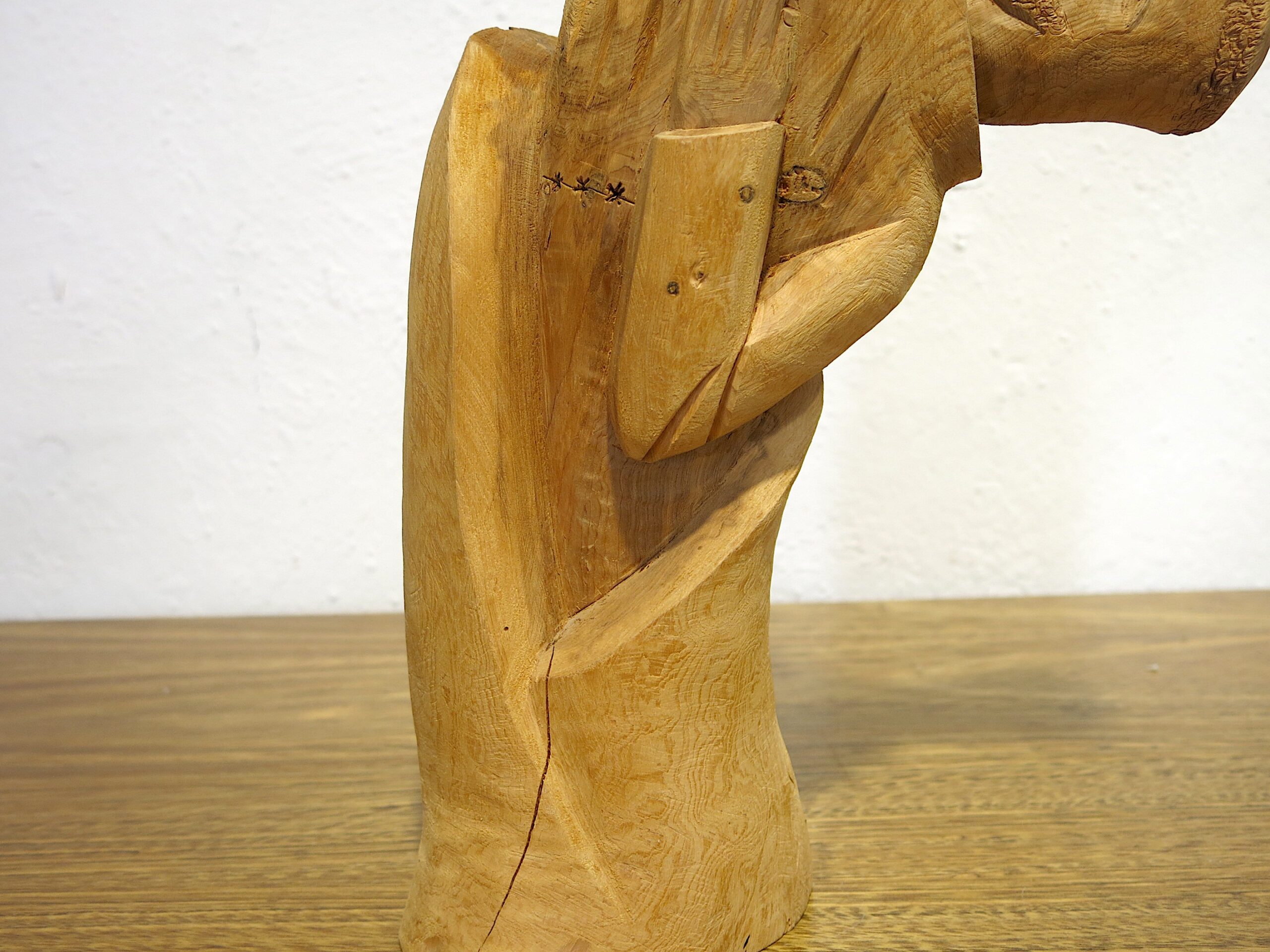 An exceptional and rare large-scale hand-carved cedar bulto of San Francisco de Asís (St. Francis of Assisi) by Michael Salazar of Taos, New Mexico — signed 1983, within his final years of carving before his untimely death in the mid-1980s. This is among the most ambitious compositions in the Salazar family tradition. The figure leans forward dramatically at a steep angle — breaking completely from the static columnar form typical of New Mexican bultos — with the face turned in profile and one arm raised, a small bird perched on the outstretched hand. The other arm holds a book or tablet against the body, carved with star-punch cross marks. The leaning posture and intact bird represent an extraordinary feat of carving in a single piece of cedar. 15″x8″x4.5″ 3 lbs. Please see pictures for condition details as the photos are considered a part of the description.
