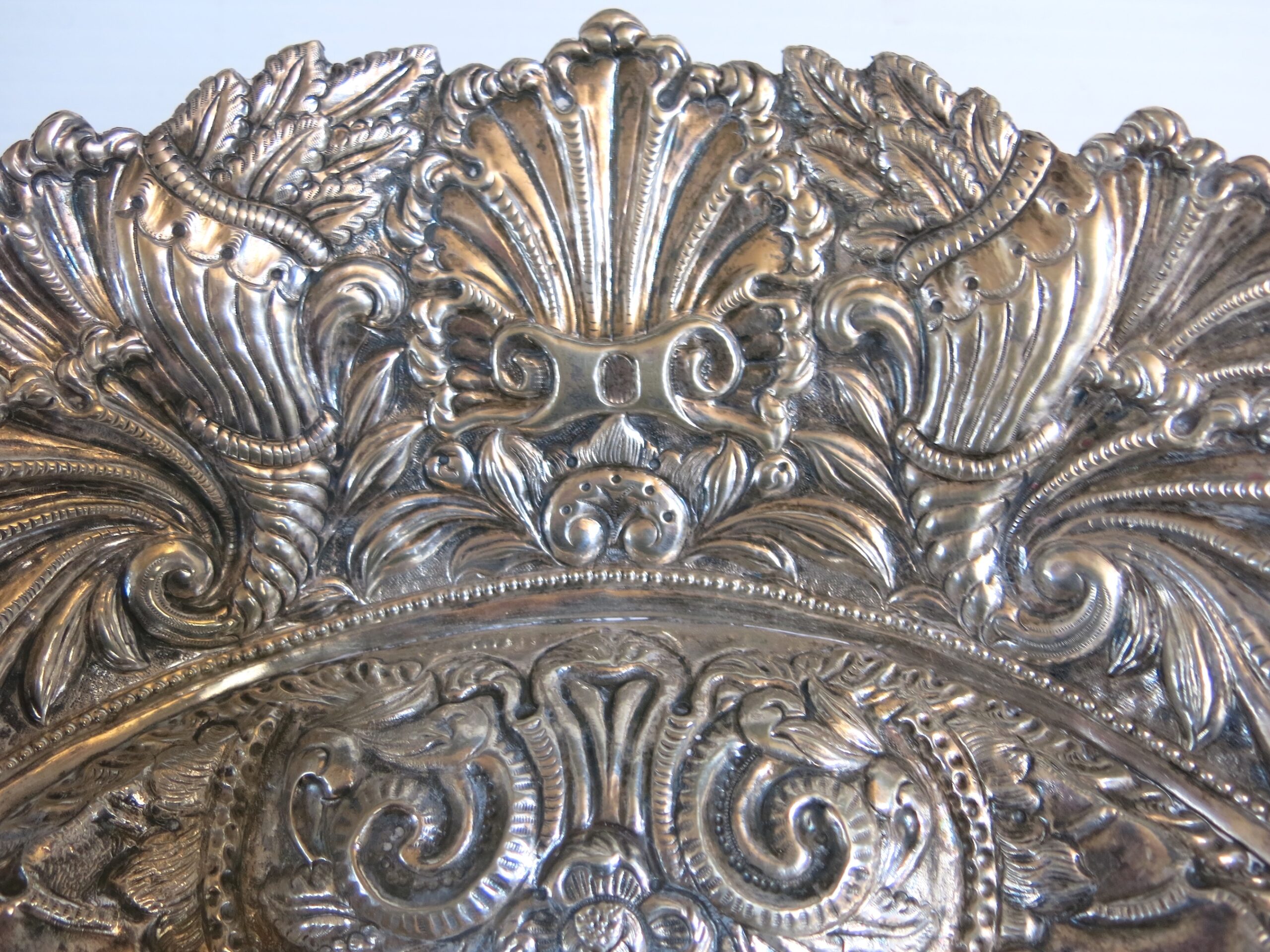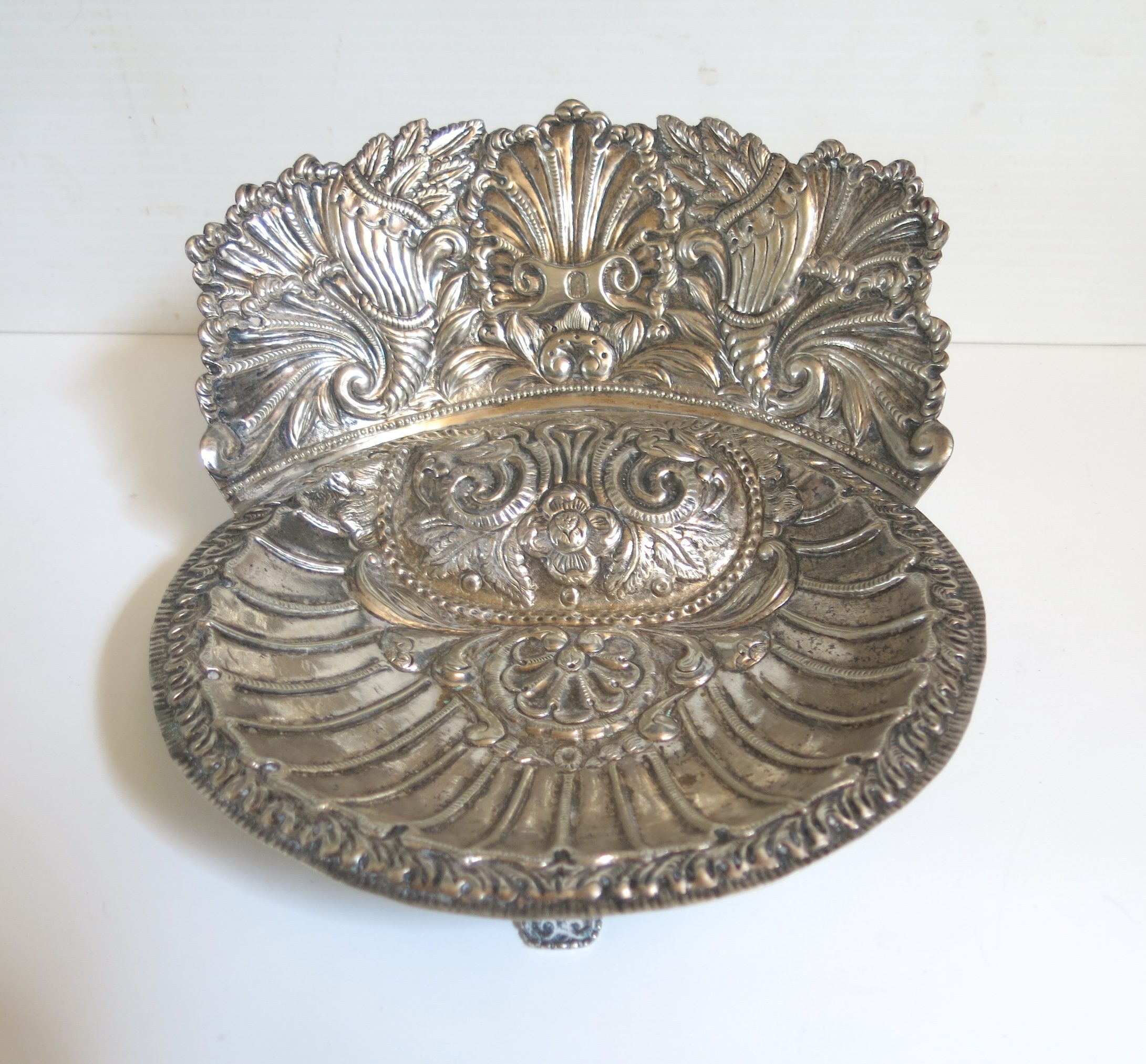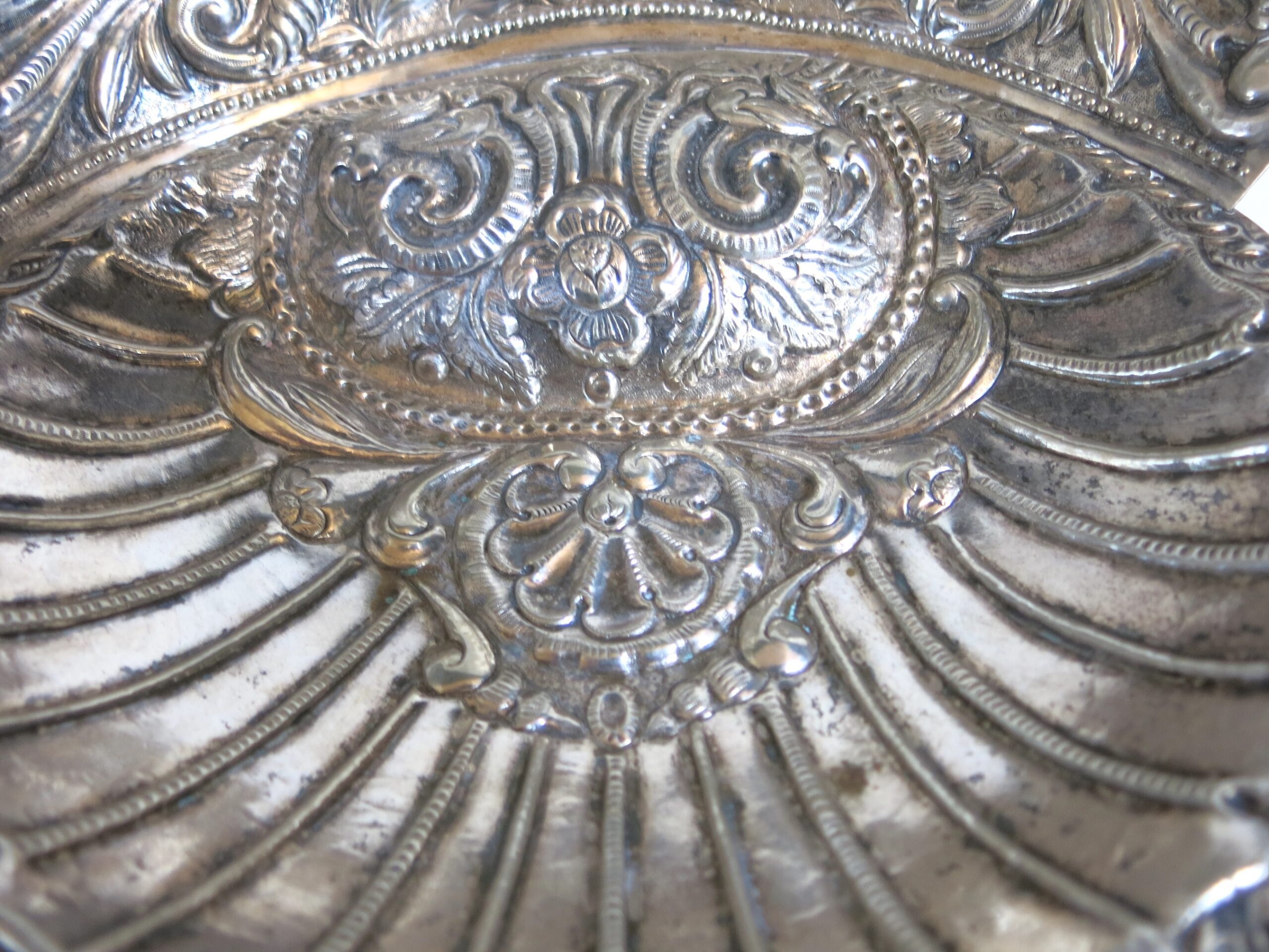Spanish Colonial Holy Water Font is probably used as a baptismal for home ceremonies, this silver font is heavily chased in repoussé flowers and vining plants. No dents or damage. Late 19th century, 4.5″H x 9″W x 9.5″ D