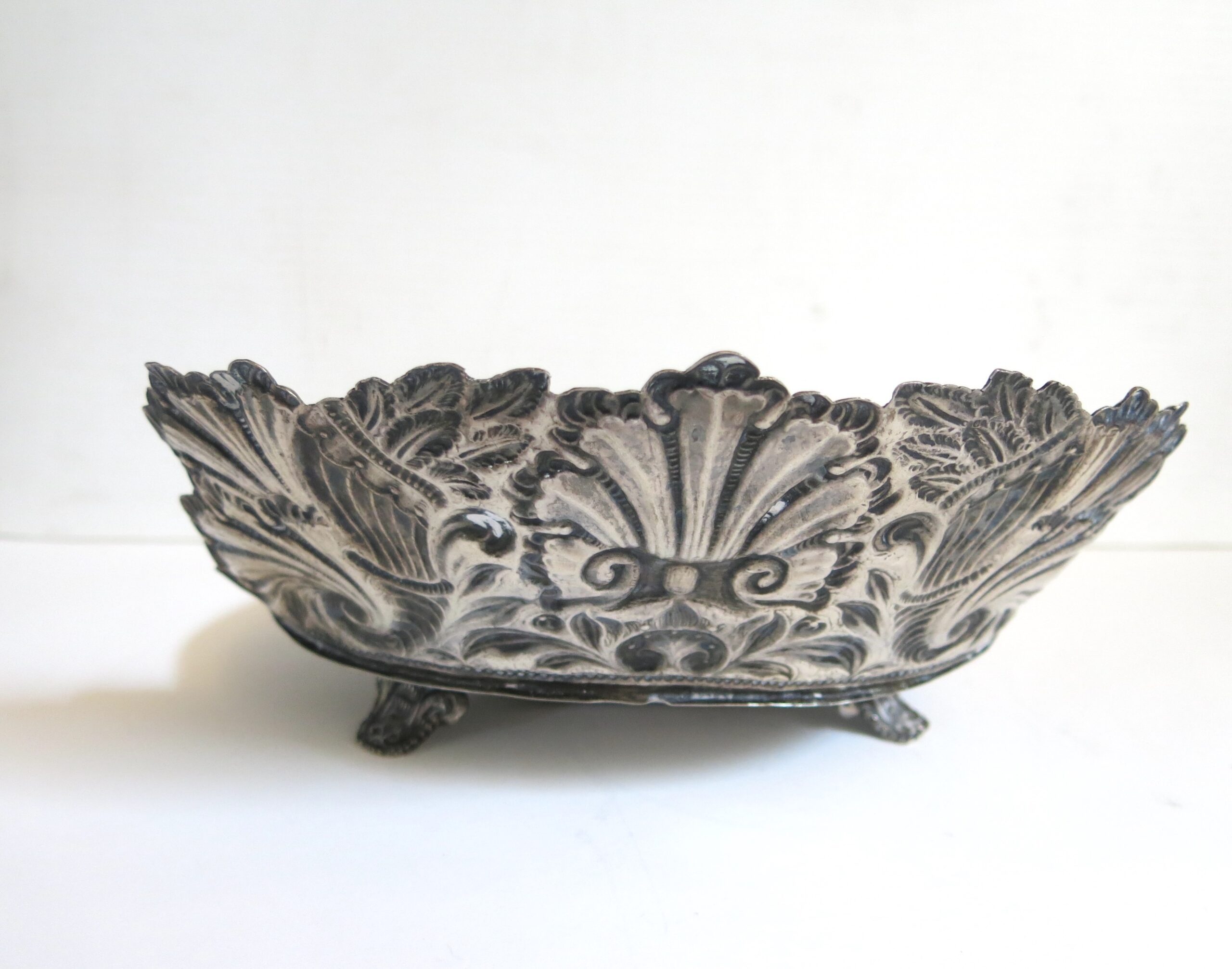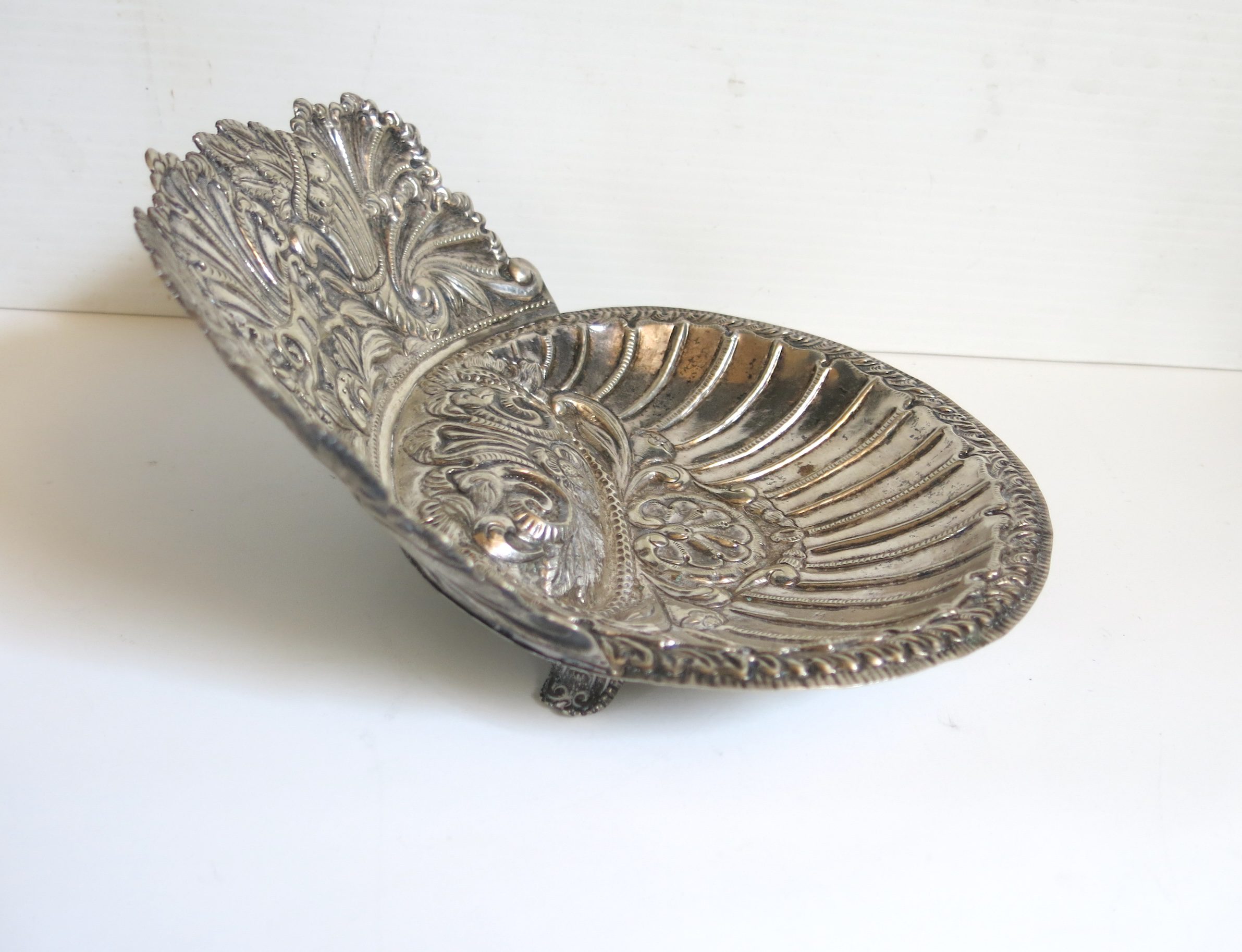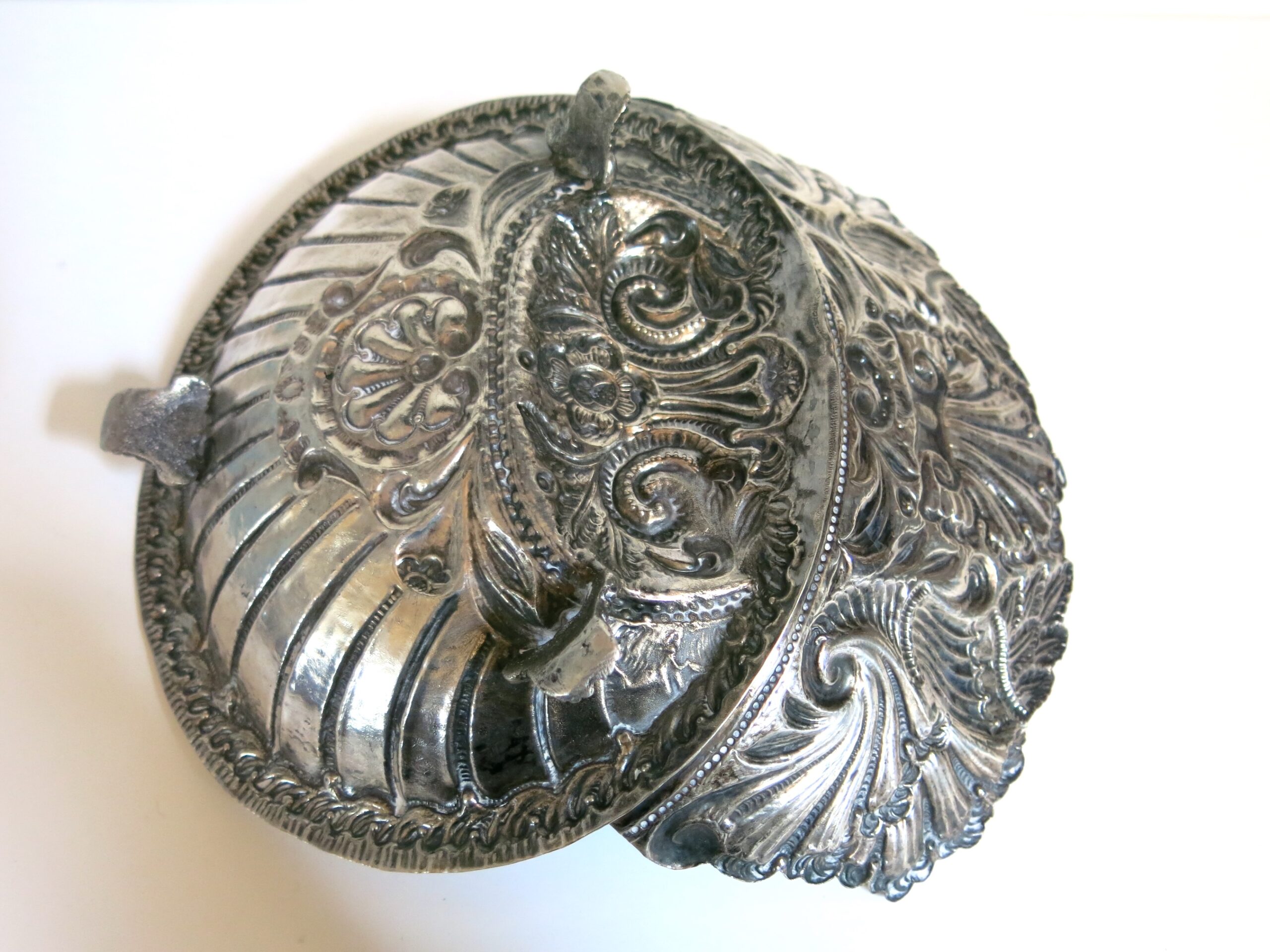 Spanish Colonial Holy Water Font is probably used as a baptismal for home ceremonies, this silver font is heavily chased in repoussé flowers and vining plants. No dents or damage. Late 19th century, 4.5″H x 9″W x 9.5″ D