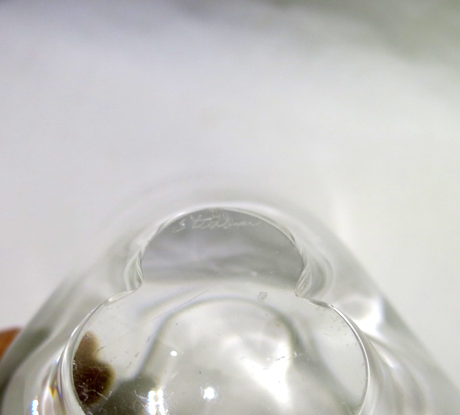 Originally designed by Donald Pollard in the mid-20th century. This vintage piece features a diamond-point etched “Steuben” signature and is crafted from a high-refractive-index crystal, known for creating beautiful cascades of light. 6.4″x6.5″x6.5″ 1.3oz.