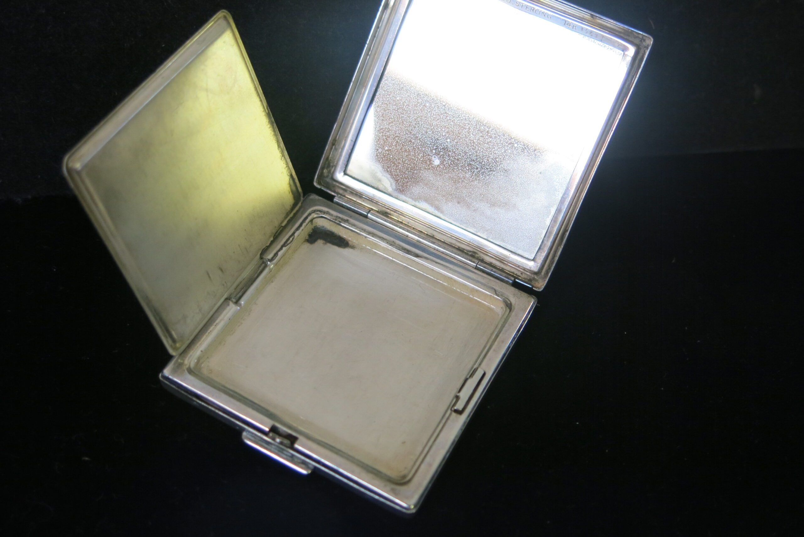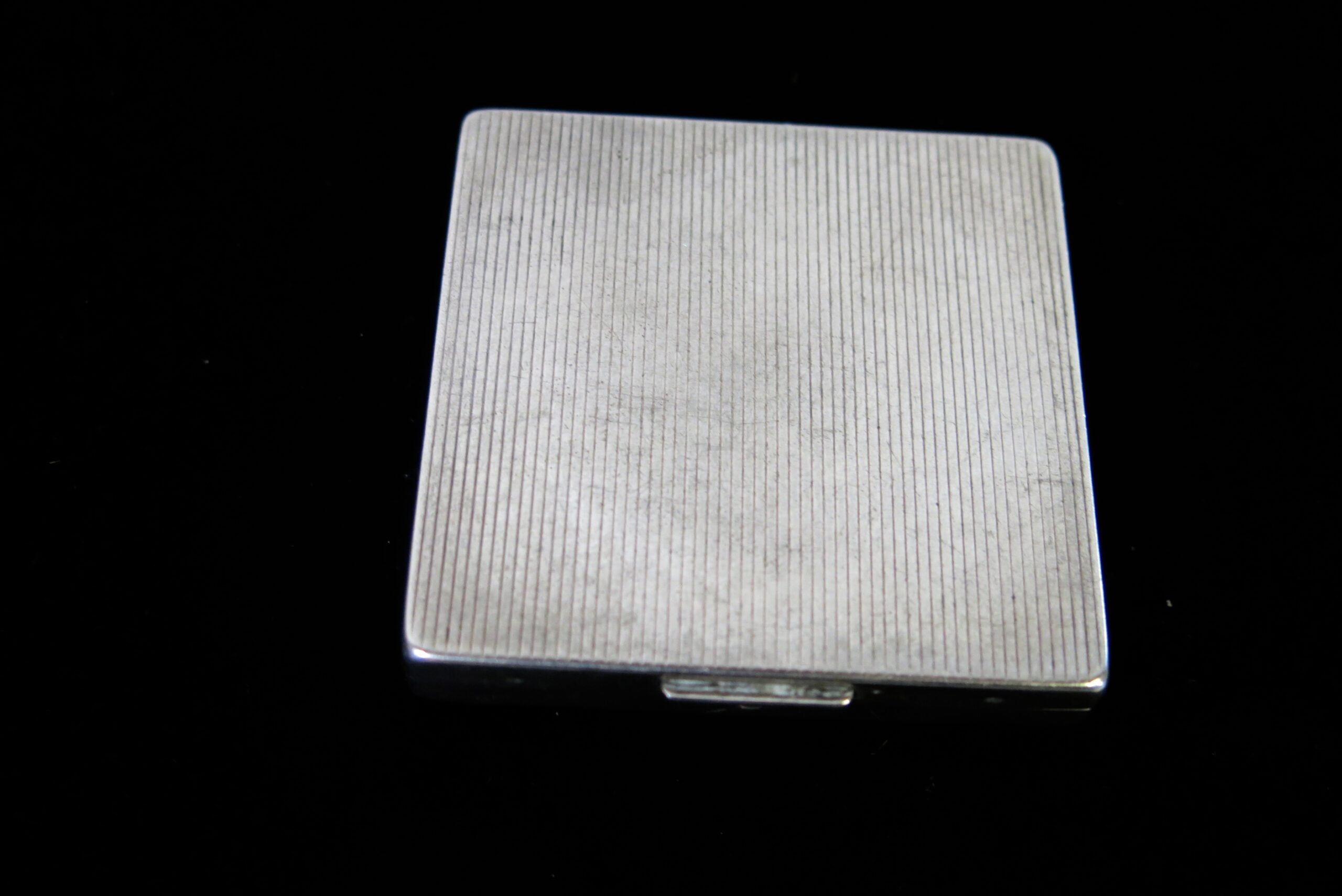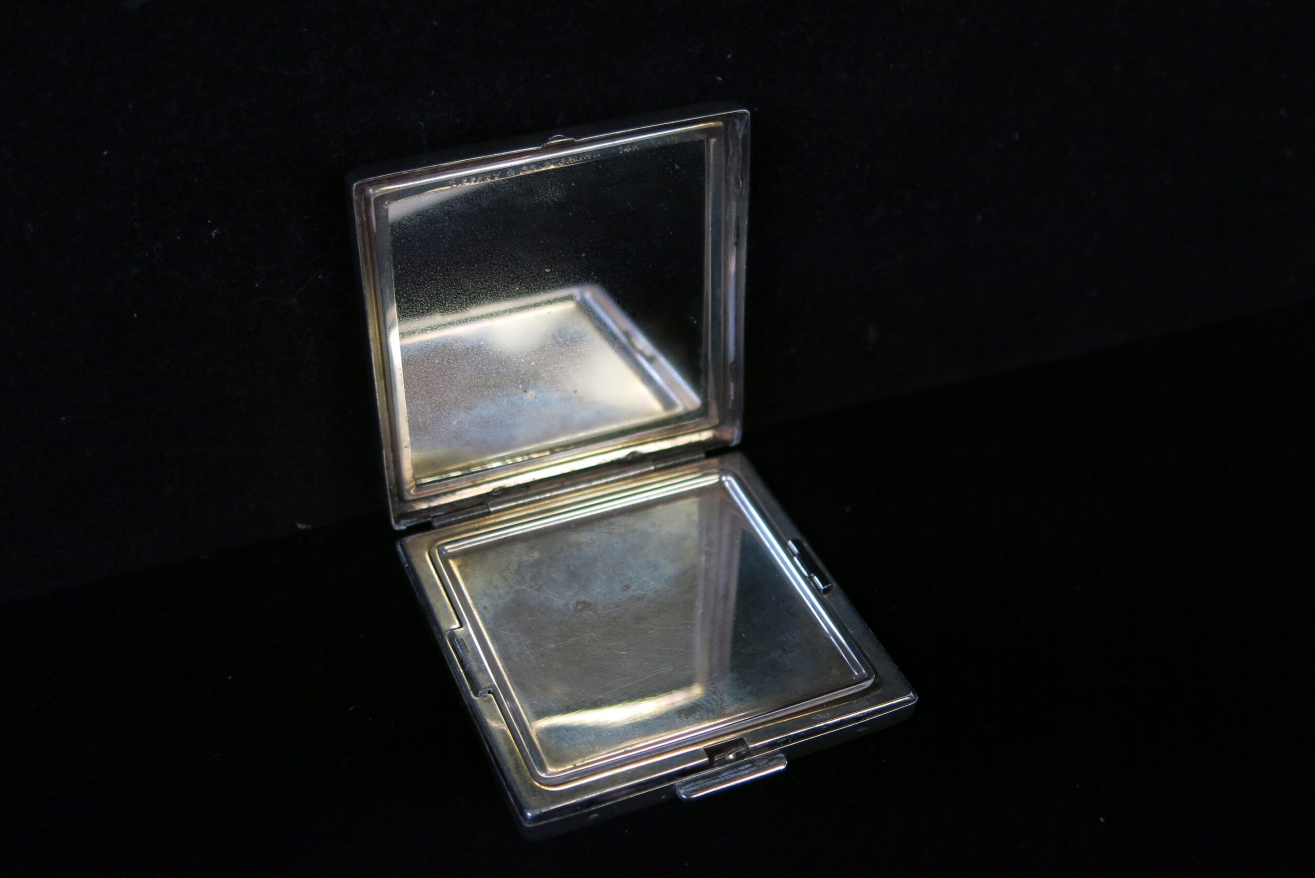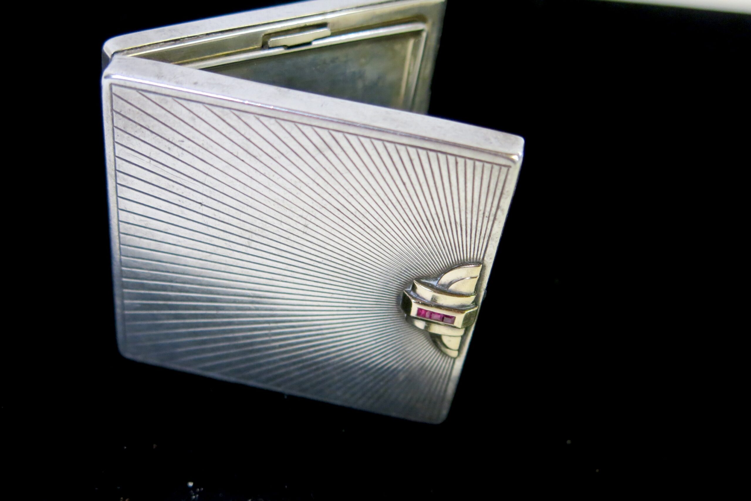 Art Deco in style, this compact was made ca. 1928. The top of the square compact is decorated with a distinctive engraved sunburst or radiant design emanating from the clasp mechanism. The main body is sterling silver, and the clasp features a 14k yellow gold element set with three square-cut rubies. 90g Please see photos for condition details as the pictures are considered part of the description.