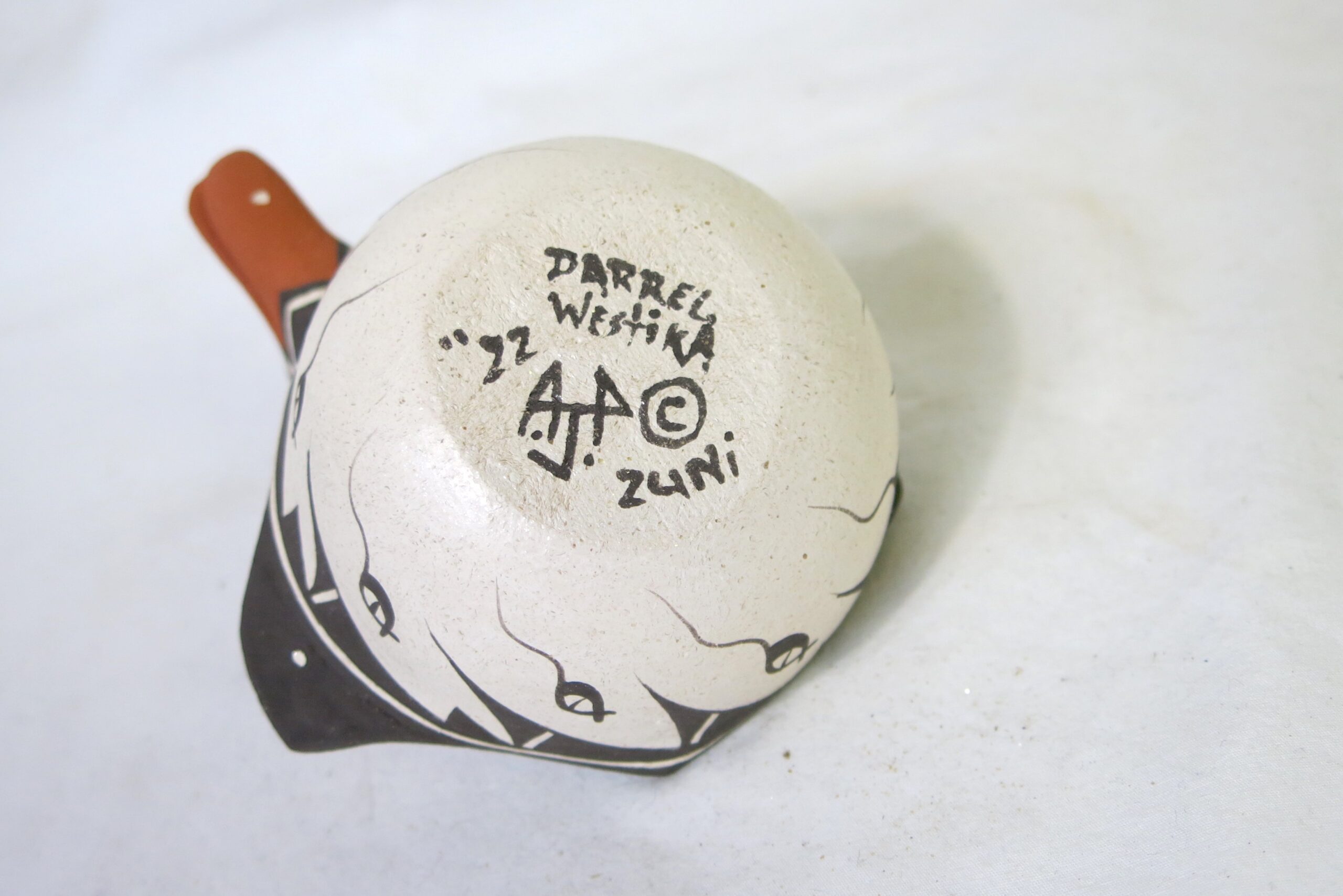 Signed Darrel Westika “92 A.J.P. © Zuni on bottom. The vessel is an effigy pot, meaning it is crafted in the shape of an animal. Duck figures hold significant symbolic meaning in Pueblo culture, often associated with water, the migration of spirits, and sustenance. 3.5″ x 4.25″ x 5.25”