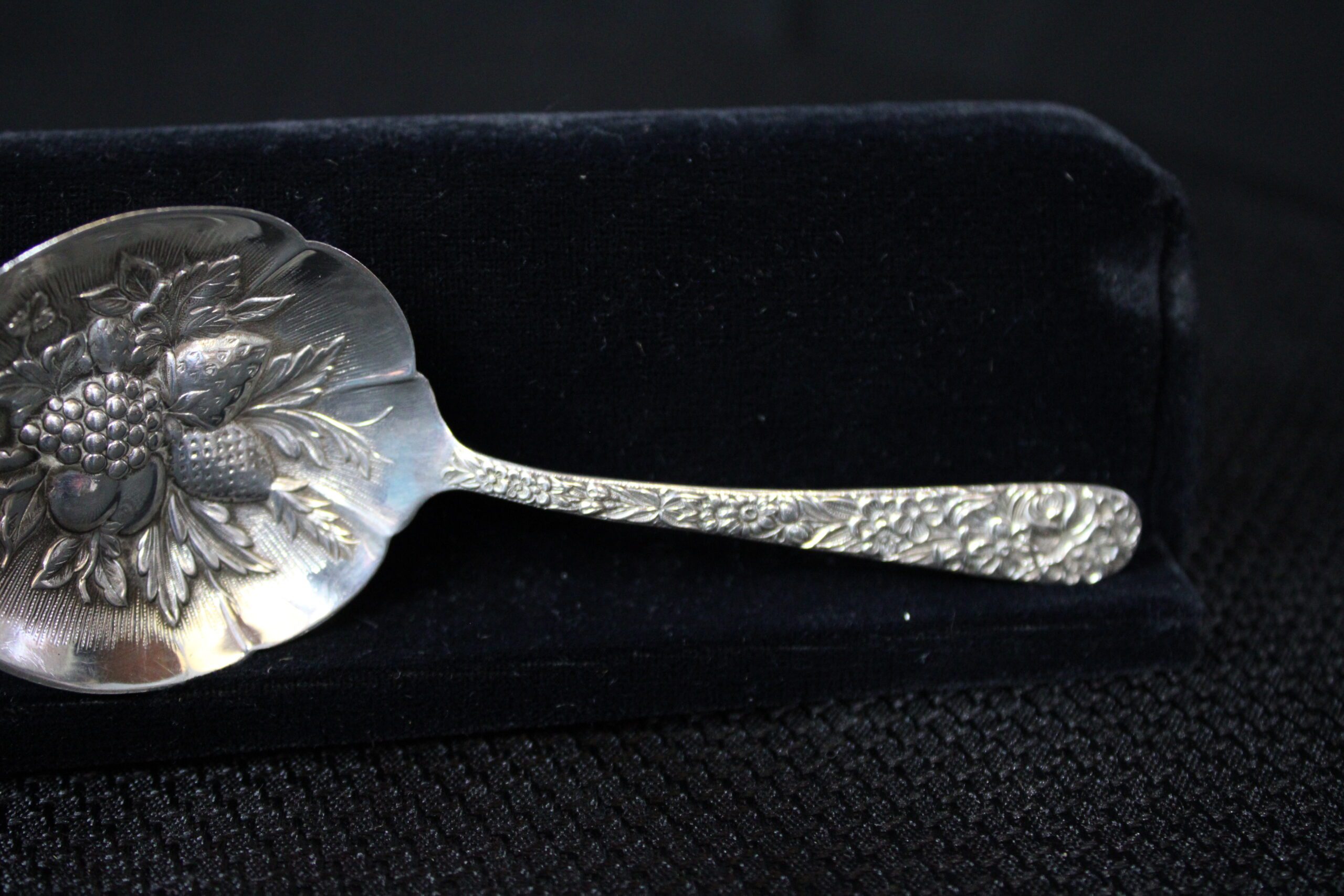 Splendid repousse fruit in the bowl leading to an equally well defined sculpted handle. Marked “S. Kirk and Sons Sterling” on reverse of stem. This piece is a classic S. Kirk & Son Repoussé sterling silver bonbon spoon (also known as a candy or nut spoon). The Repoussé pattern, first introduced in 1828, remains one of the most iconic American sterling silver designs. 30g Please see pictures for condition details as the photos are considered part of the description.