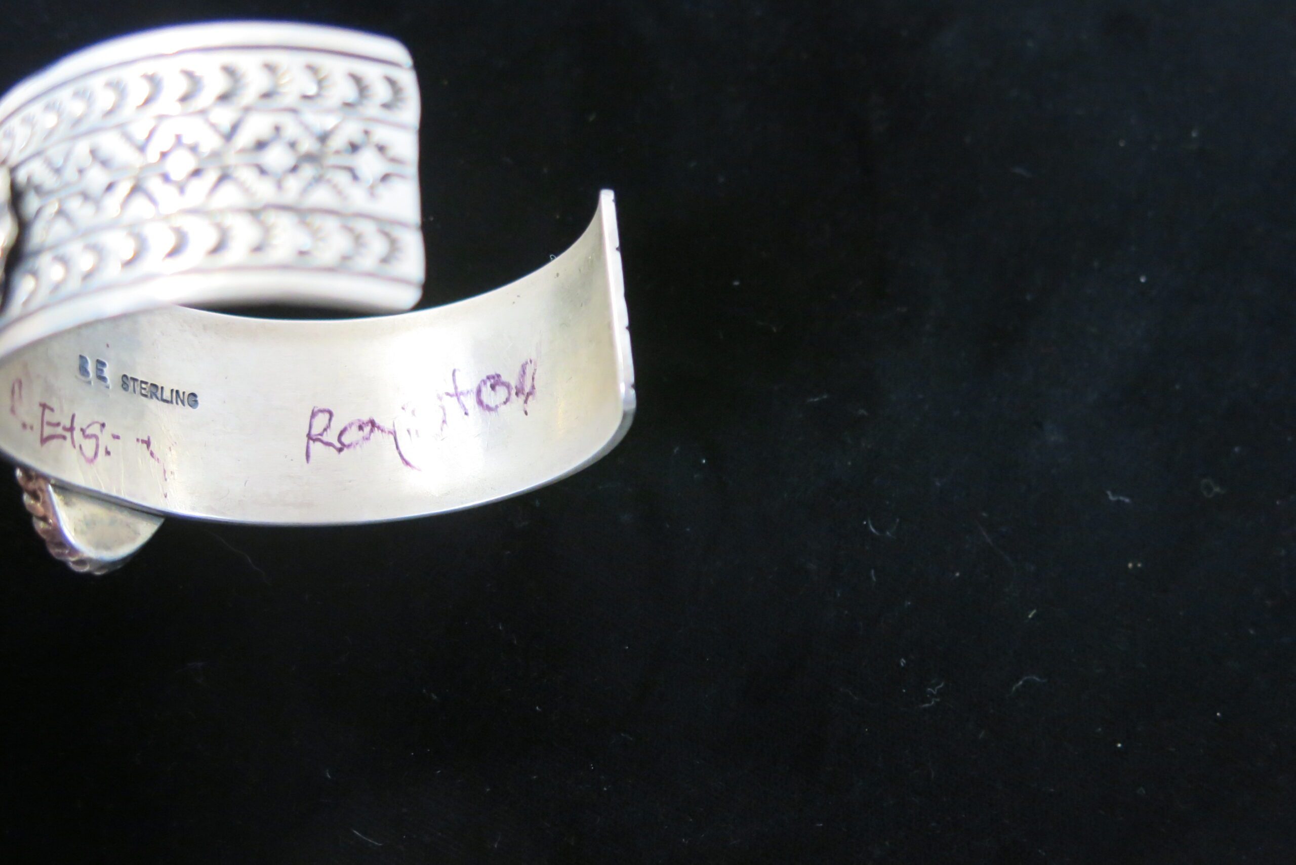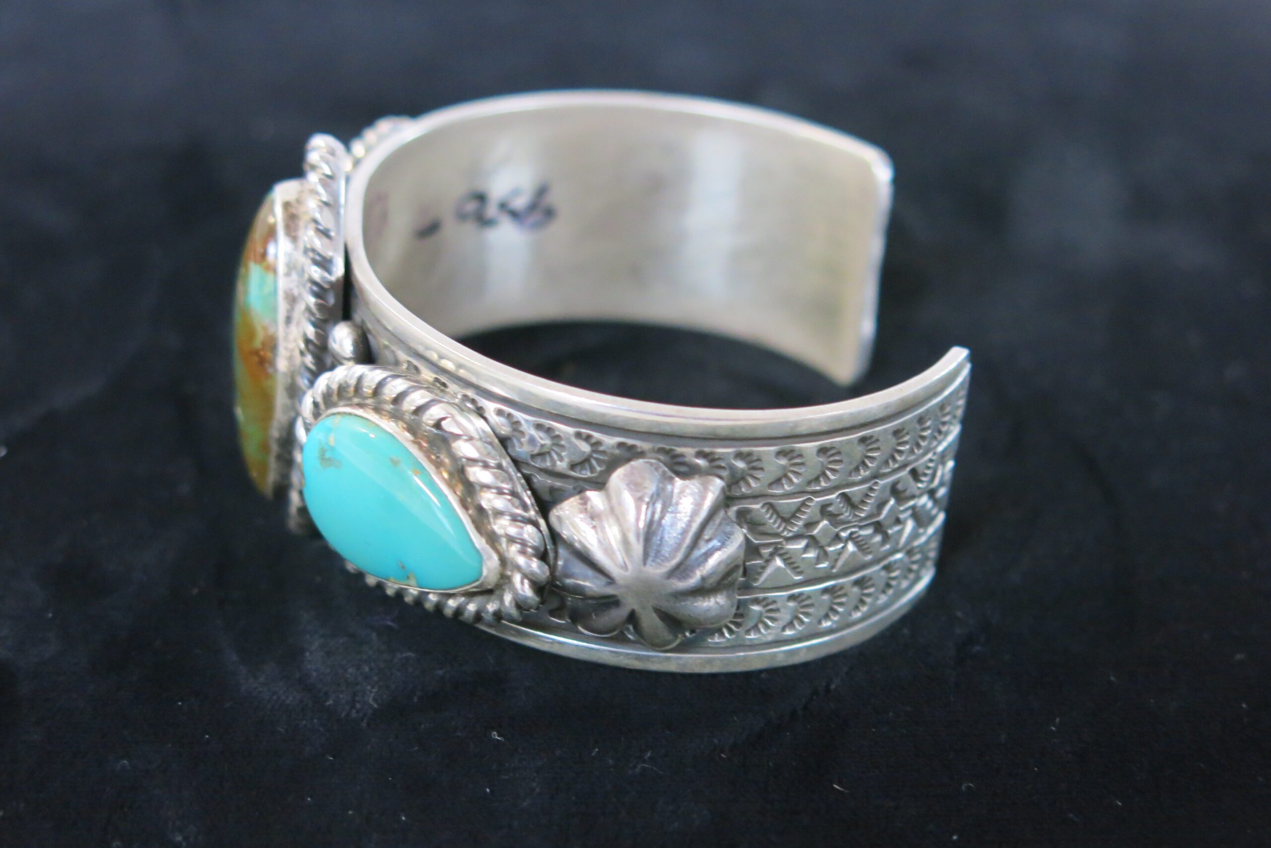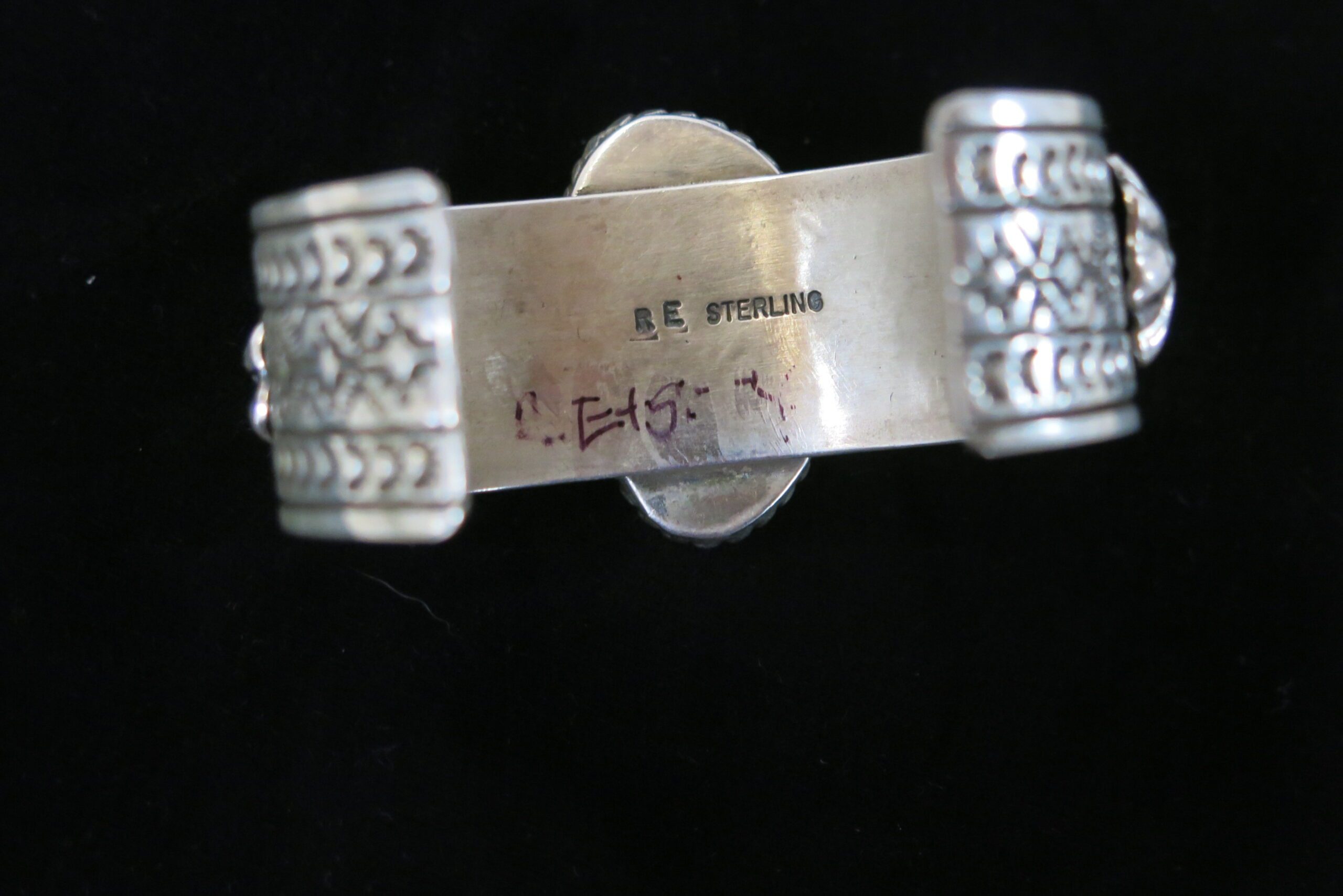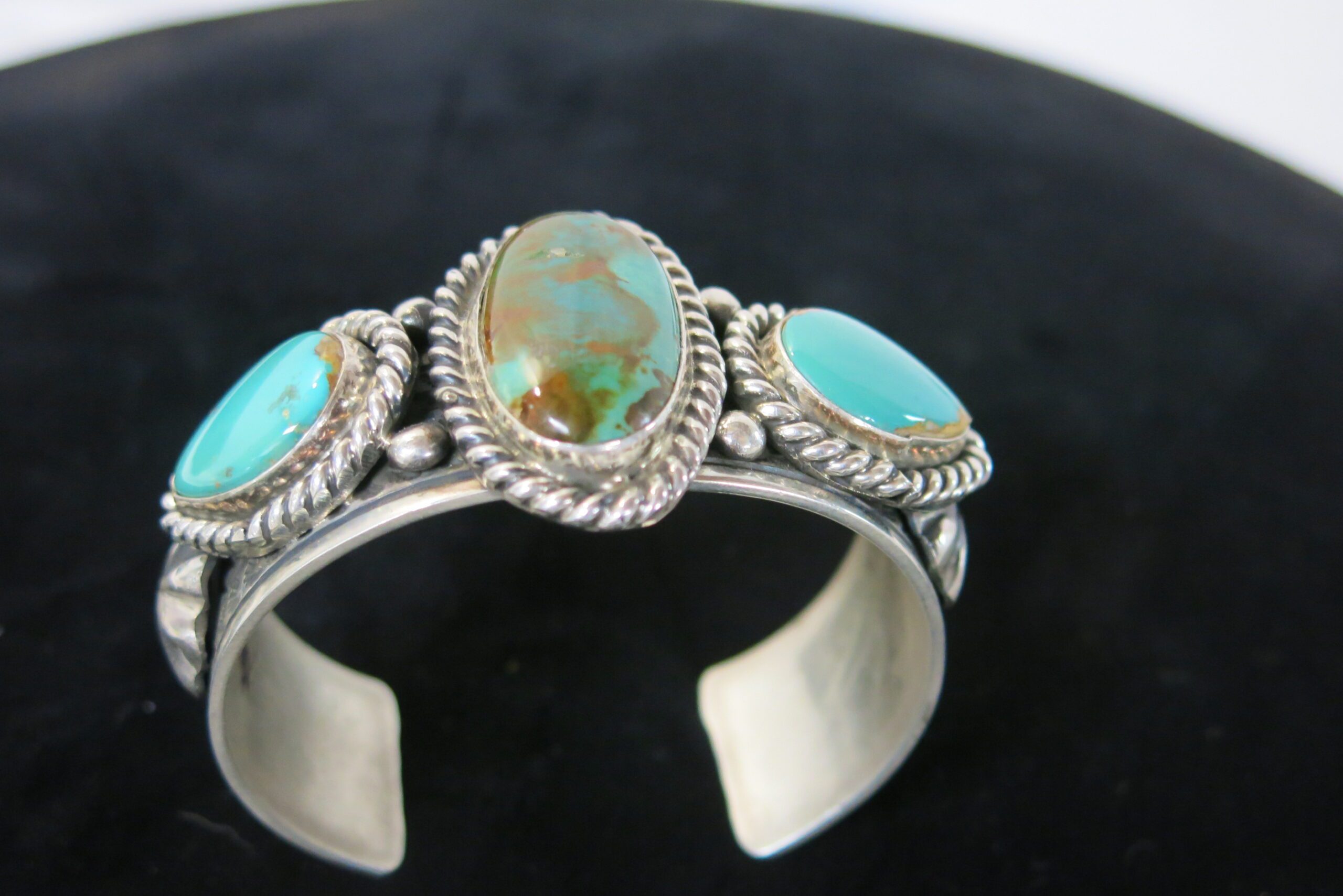Signed RE with Sterling stamp on reverse. Three-stone cuff, featuring three substantial, oval turquoise stones set horizontally across the top of the wrist. The settings utilize a traditional sawtooth bezel setting and are decorated with applied silver elements of twisted wire and small silver beads around the bezel edge. Hand stamped decorations flank matching star rondels. 105g. 5.75″ circumference with a 1.25″ opening.